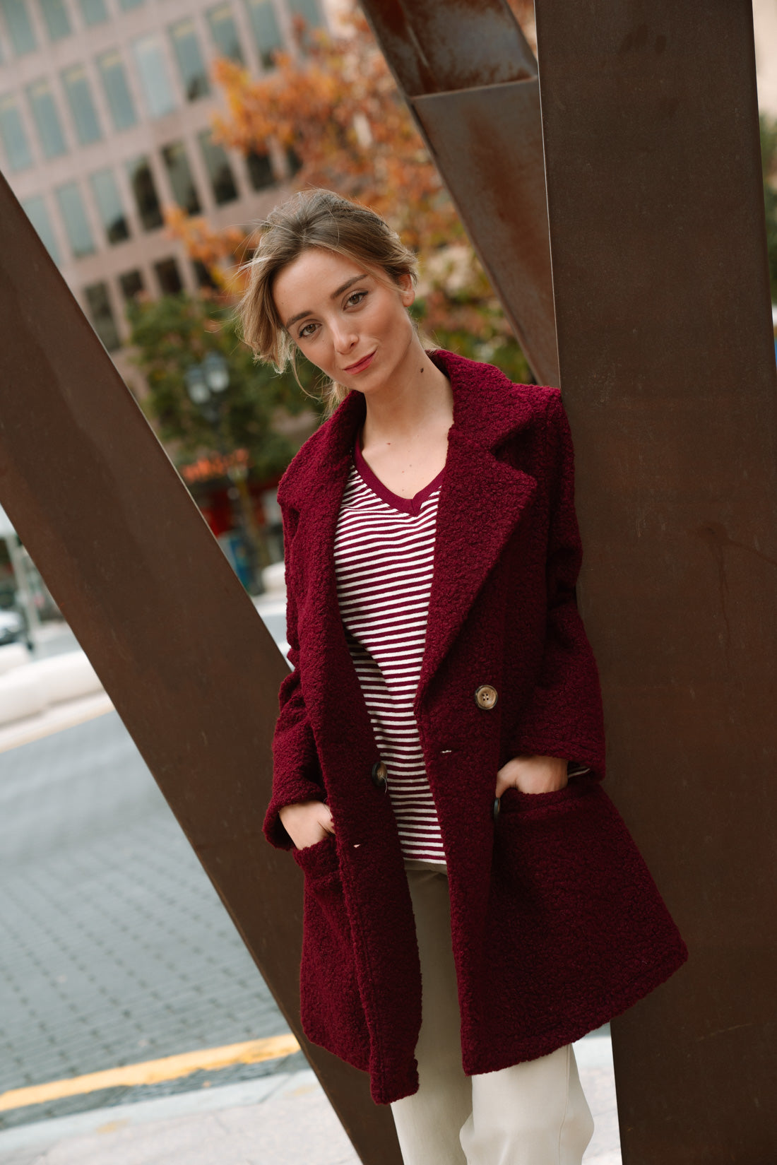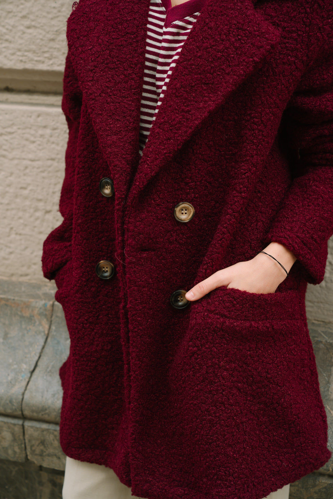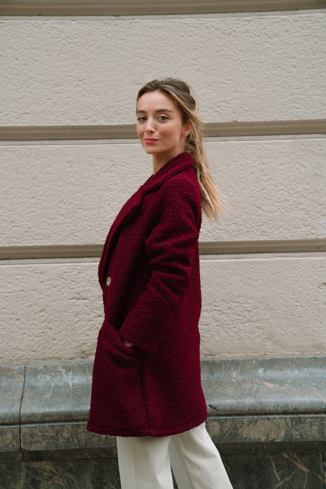 Abrigo DOLLY 4 botones burdeos. Borreguito sintético. La prenda perfecta para elevar tu outfit y darle un toque actual y sofisticado. 100% poliester T.U. equivalente a S-M (La modelo utiliza T.XS)