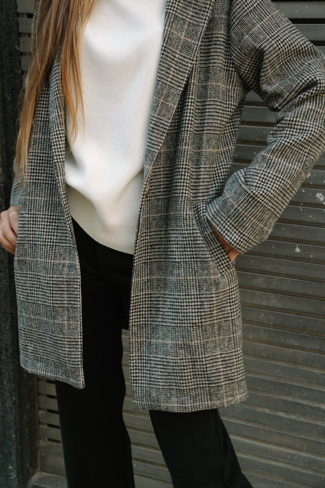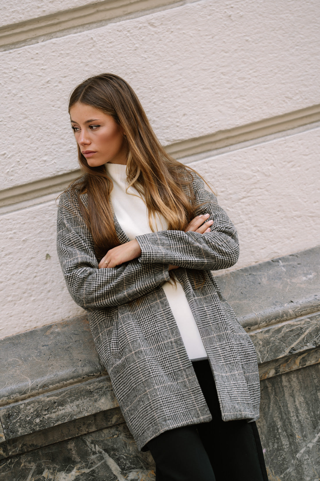 Abrigo BONN negro. Un abrigo sin forro perfecto para entretiempo, puedes utilizarlo como chaqueta larga con blusa o como abrigo con un jersey de punto. 100% poliéster. La modelo utiliza T.S
