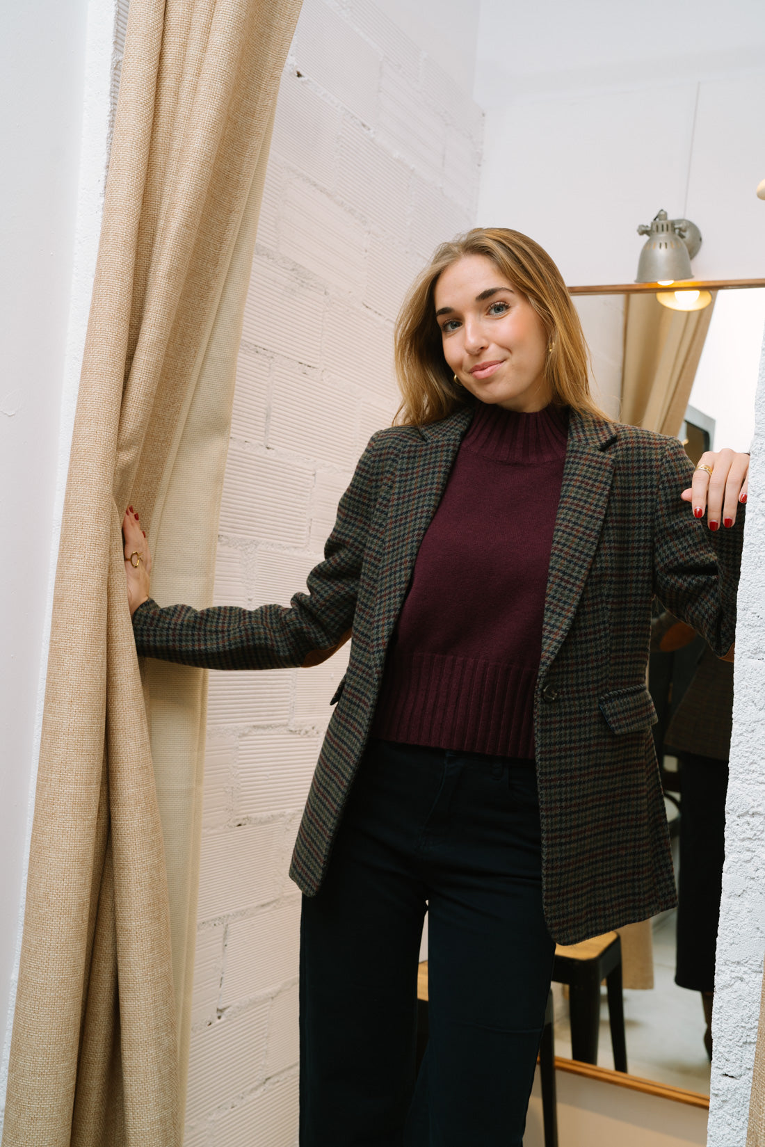 Blazer PATTS micro pata de gallo en tonos marino y burdeos. 15%lana 85%poliester. Forro 100%poliester. La modelo lleva puesta T.L (la modelo utiliza T.S)