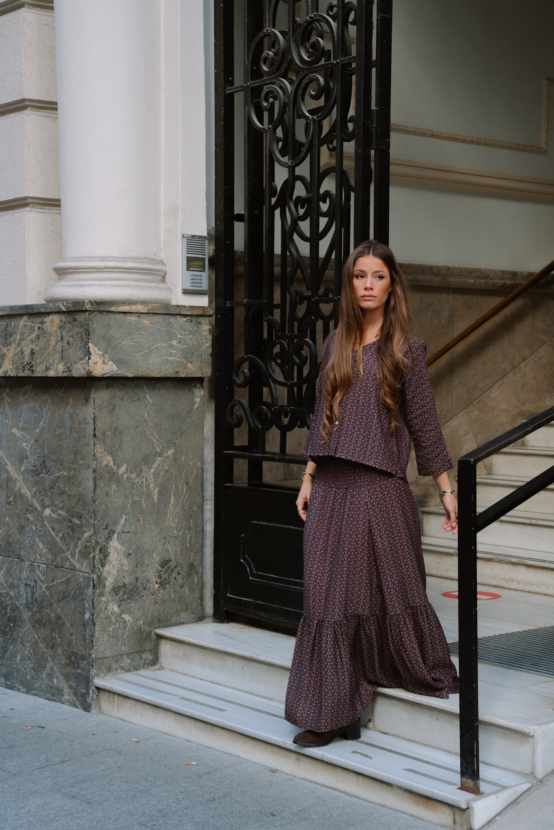 Blusa ELSA abotonada con cuello pico. Estampada en tonos choco y azules. 100% viscosa. TU equvalente a S-M (La modelo utiliza XS)
