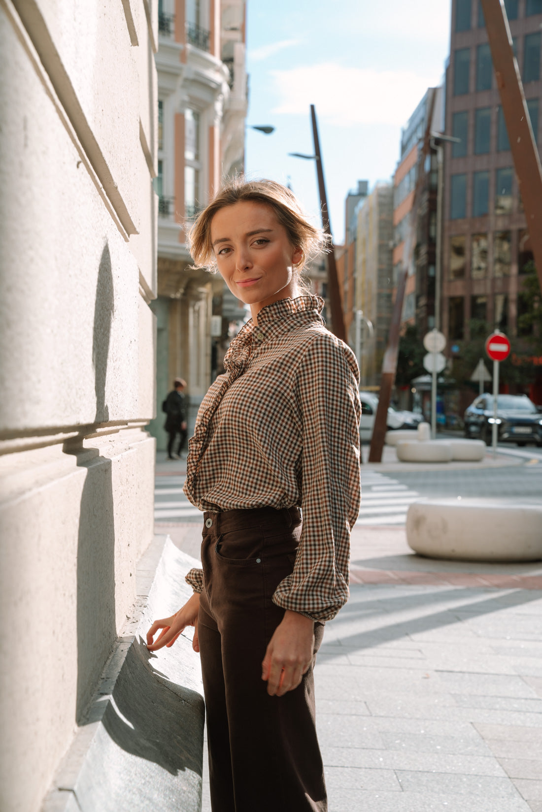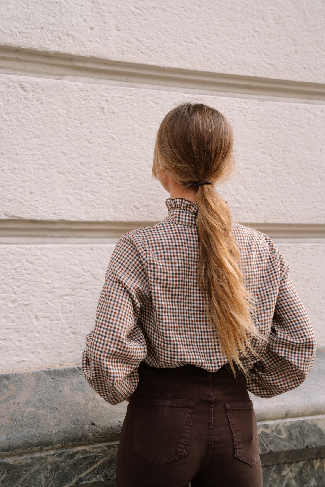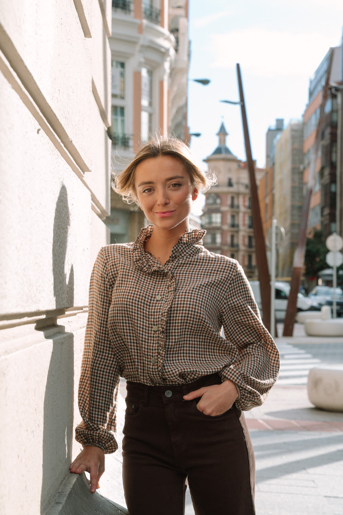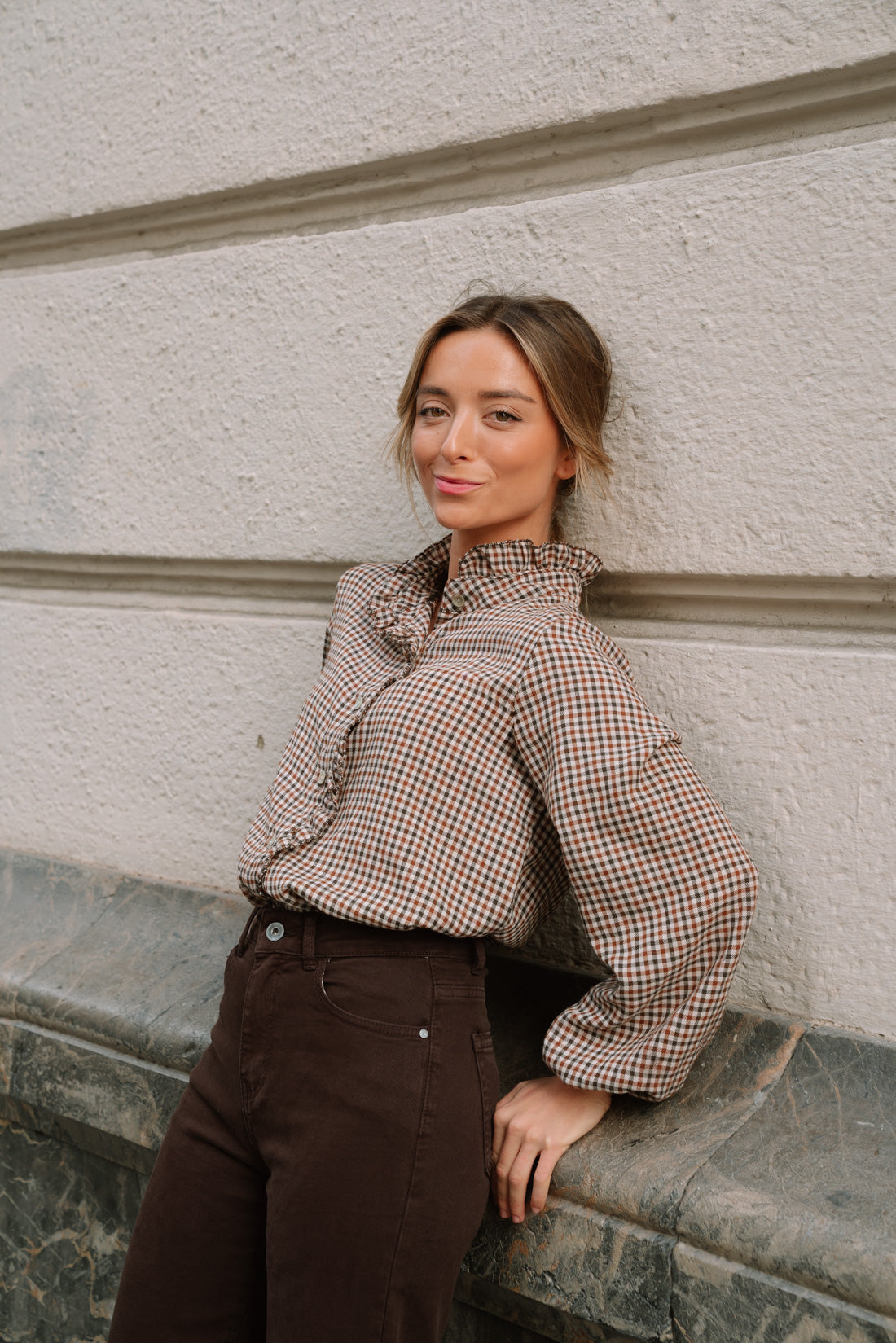 Camisa GIGHY vichy en tonos whisky y marrón. Blusa abotonada con cuello a la caja con pequeños volantes. Manga con goma para recogerla cómodamente. Suave tejido 30% algodón 70% poliéster.(La modelo utiliza T.S)