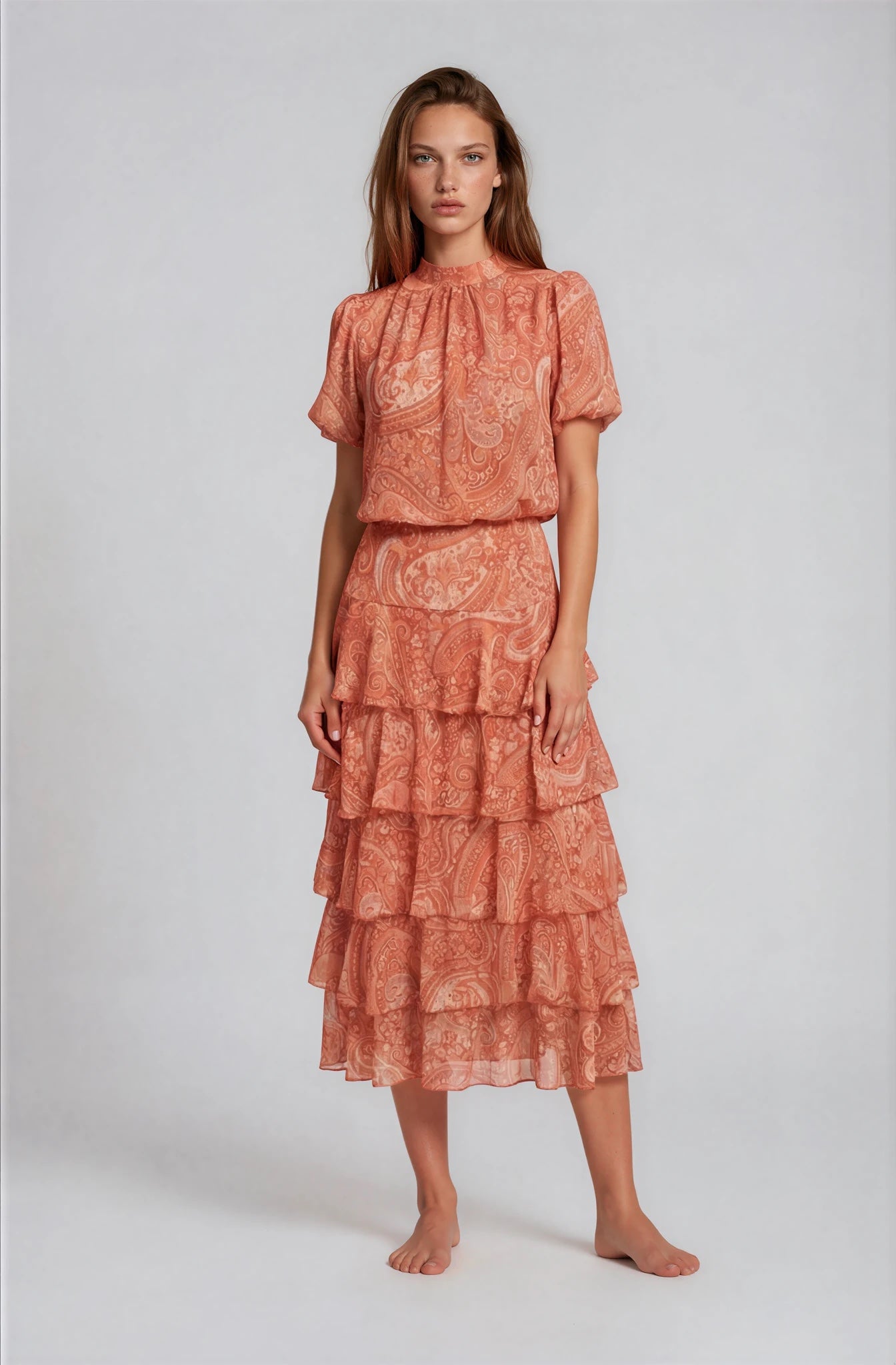 Blusa de gasa con estampado paisley en tonos tejas. Cuello redondo y manga corta con goma ligeramente abullonada. Tejido 100% gasa. Disponible en T.S y T.M