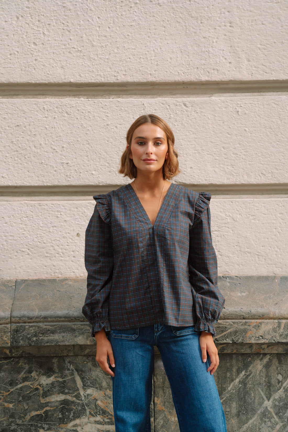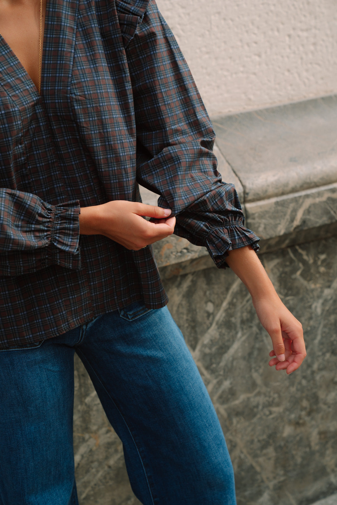Blusa tartán choco y azules. Cuello pico y detalle de volantes en los hombros. mangas con goma y pequeño volante. 100% algodón. T.U. equivalente a S-M (la modelo utiliza XS)