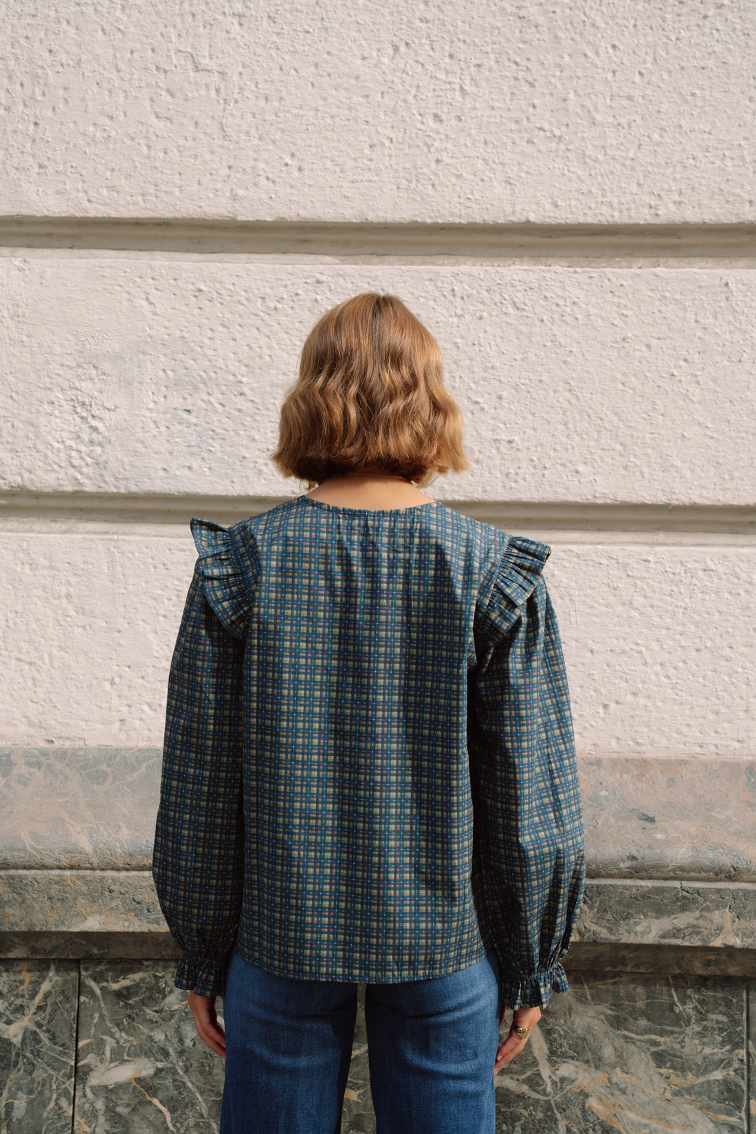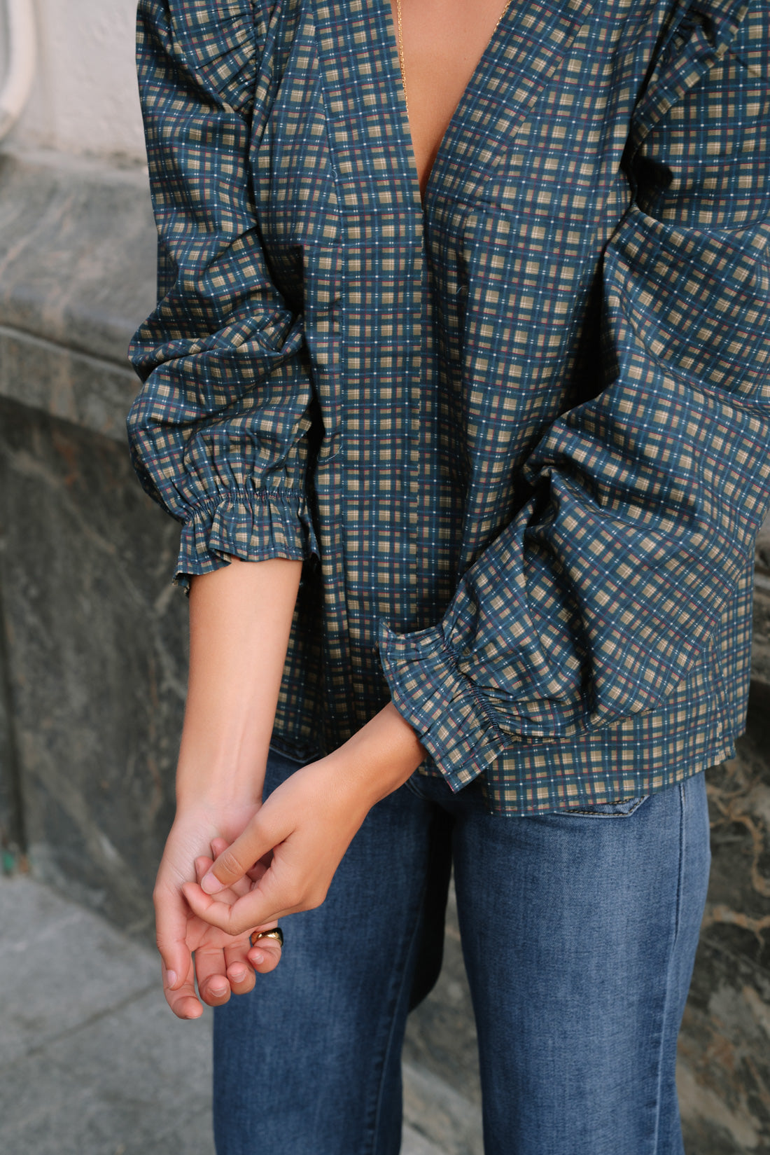 Blusa tartán kaki y azules. Cuello pico y detalle de volantes en los hombros. mangas con goma y pequeño volante. 100% algodón. T.U. equivalente a S-M (la modelo utiliza XS)
