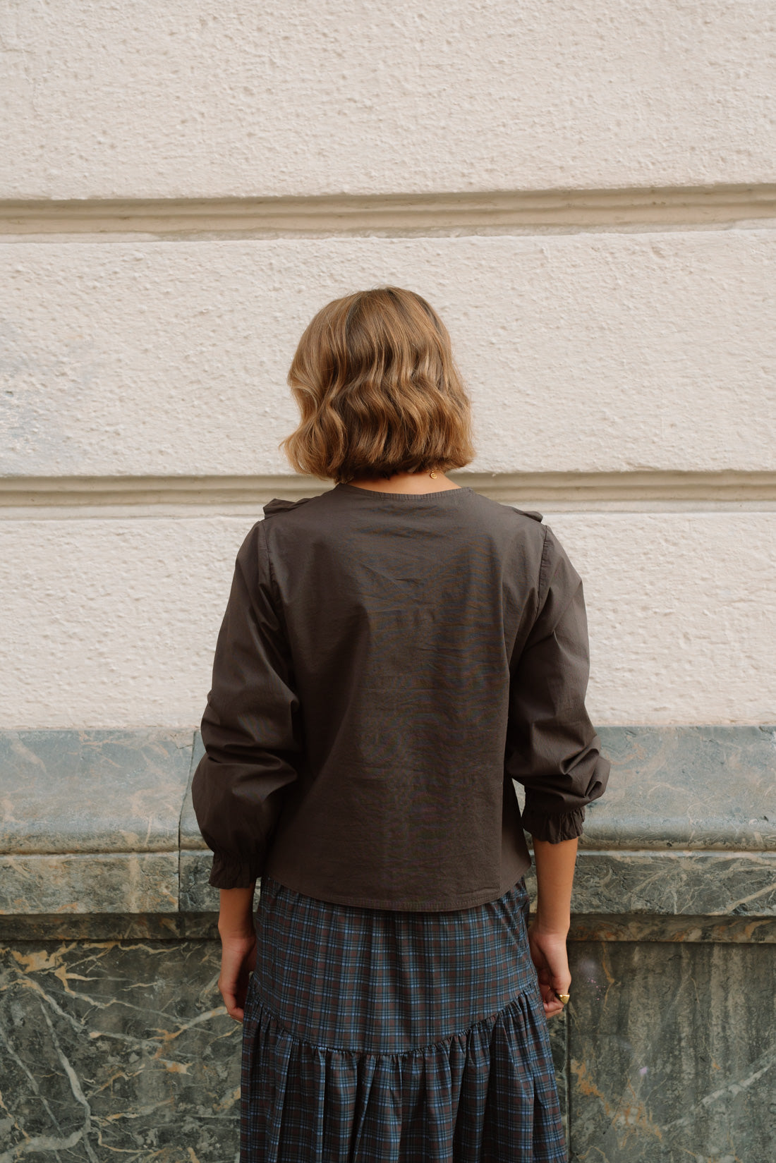 Camisa VIOLETT choco. Blusa abotonada pico 100% algodón con detalle de chorrera en el pecho. Manga con goma y pequeño volante. T.U (la modelo utiliza T.S)