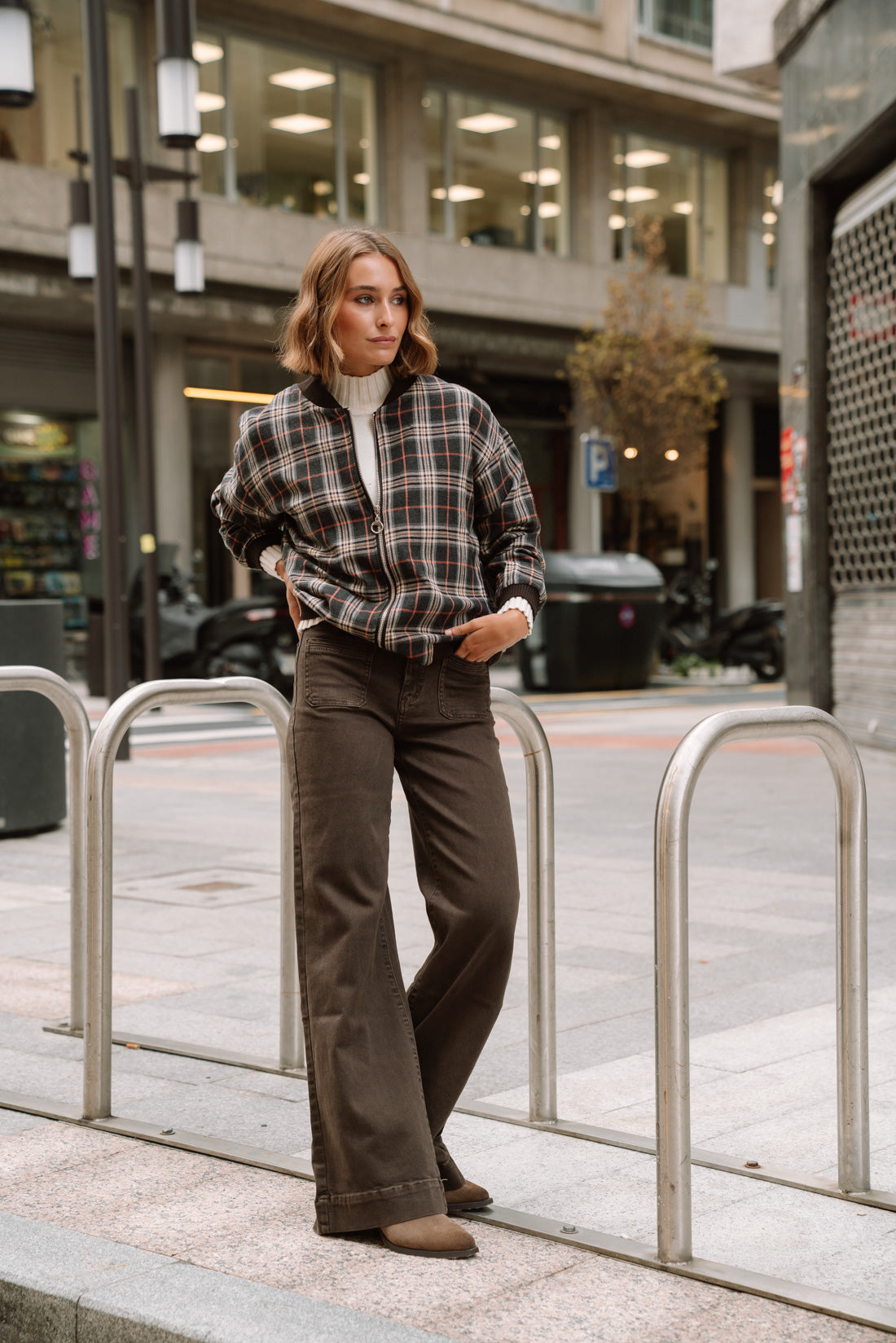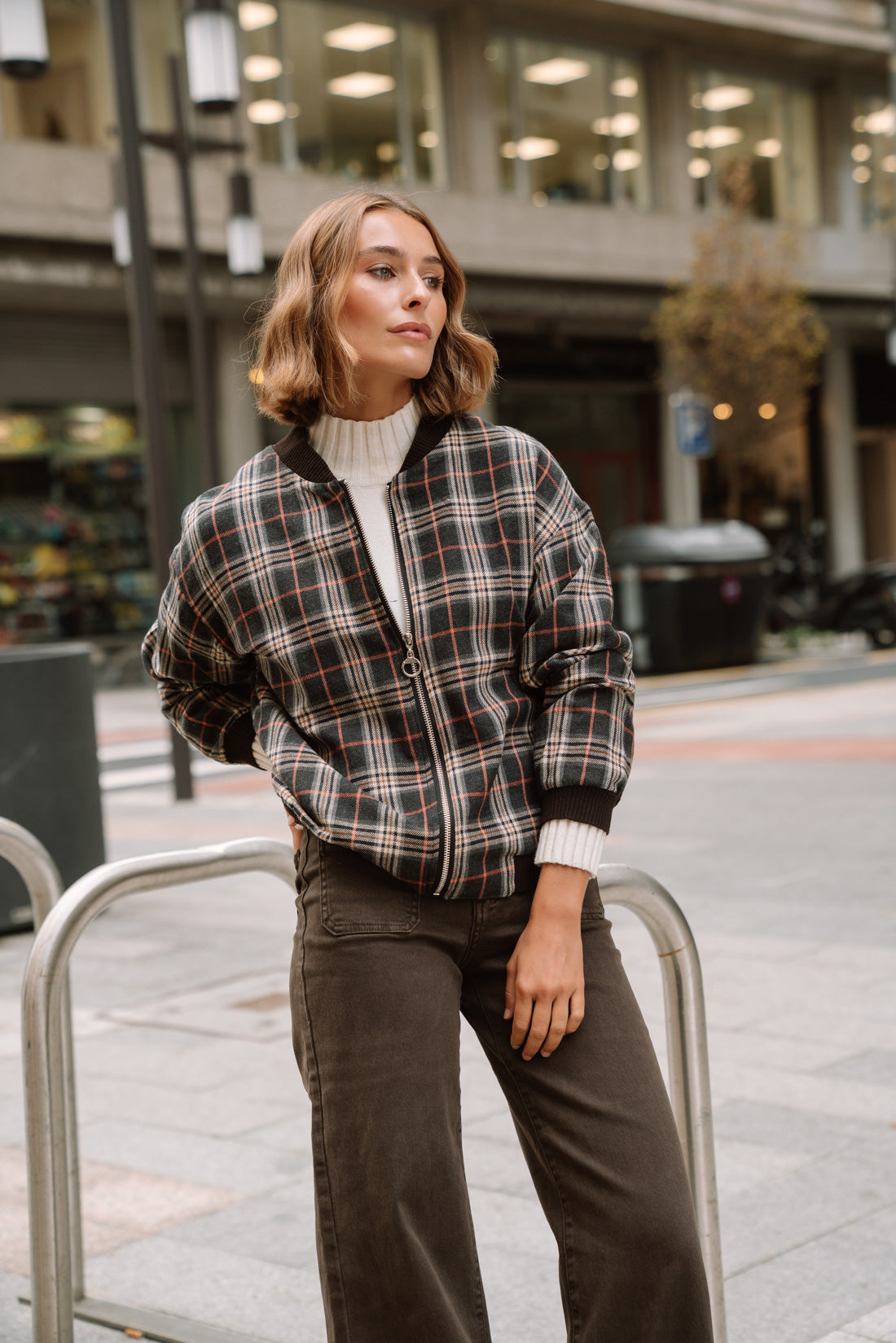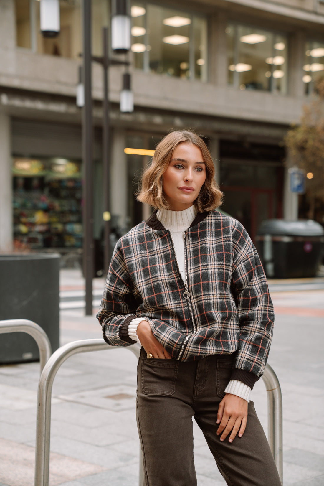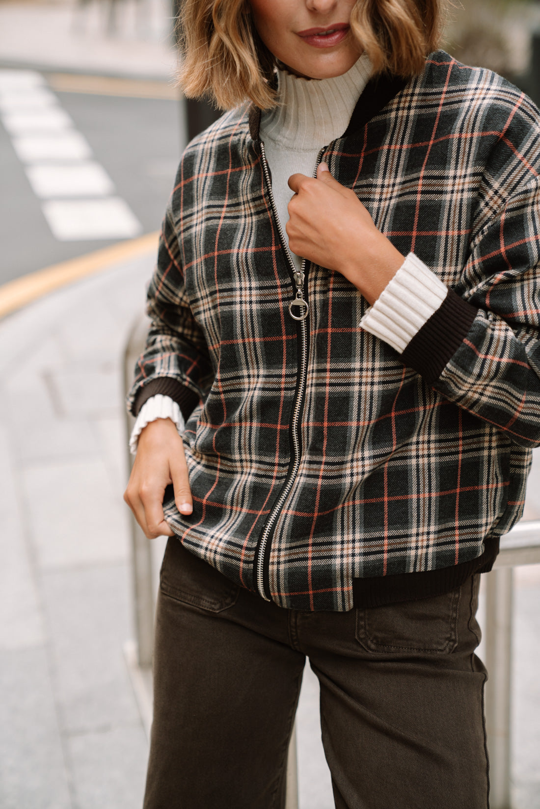Bomber ESCOCIA con cremallera.Contraste choco en cuello, bajo y mangas de la prenda. 80% algodón 20% polyester. T.U. equivale a talla S-M (La modelo utiliza T.XS)