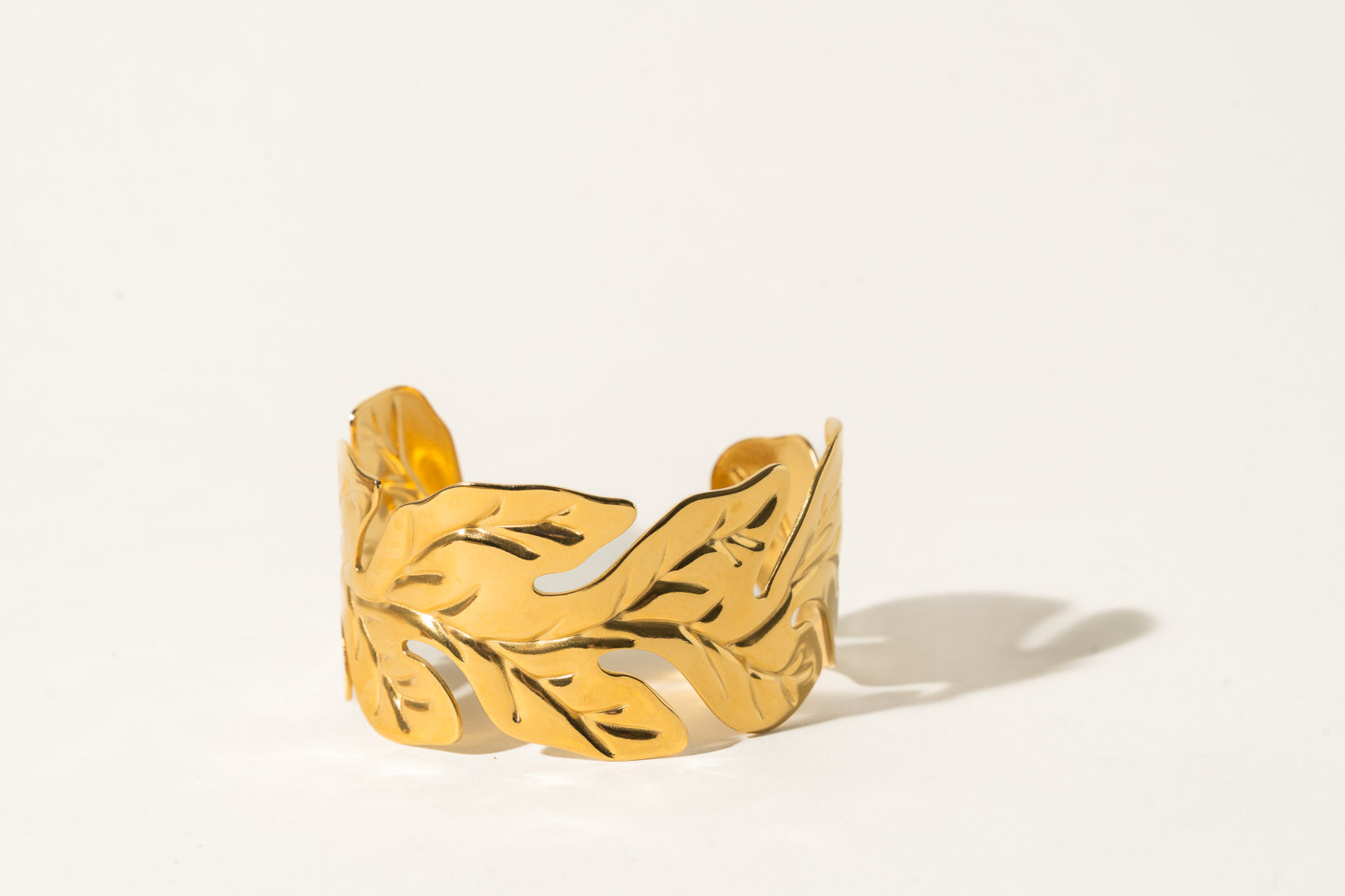 Brazalete PVD bañada en oro. Forma de hoja. Ajustable.