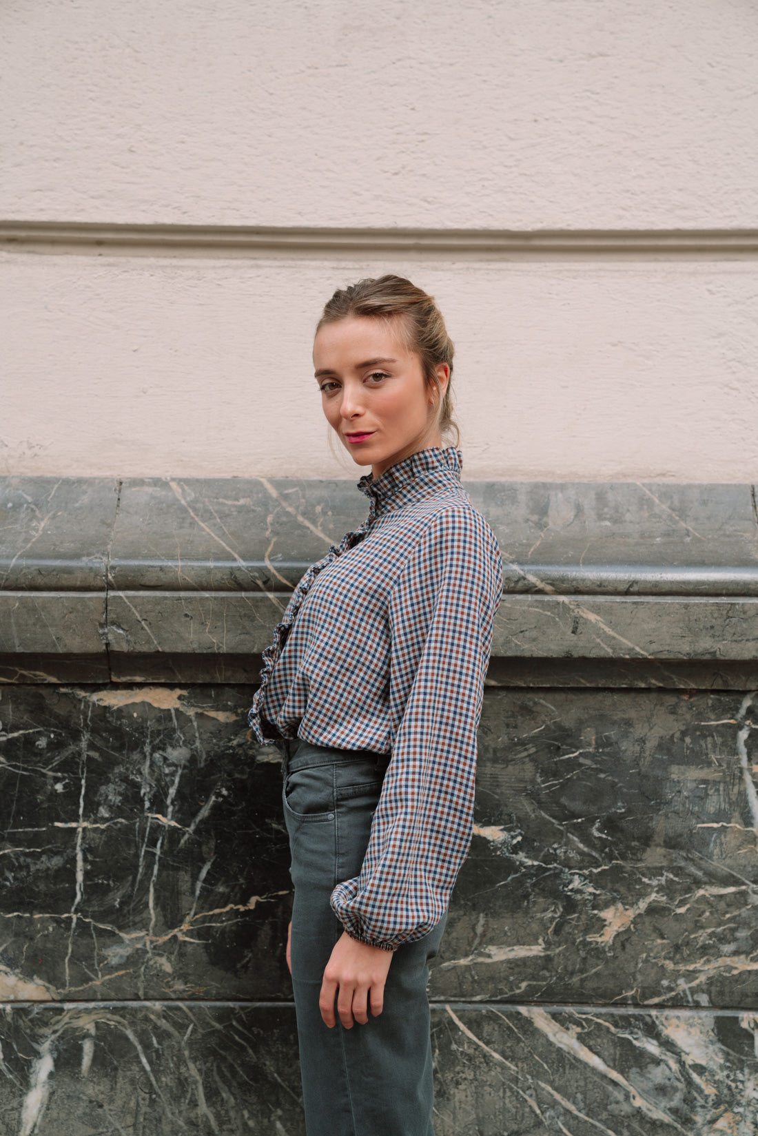 Camisa GIGHY vichy en tonos azules. Blusa abotonada con cuello a la caja con pequeños volantes. Manga con goma para recogerla cómodamente. Suave tejido 30% algodón 70% poliéster.(La modelo utiliza T.S)