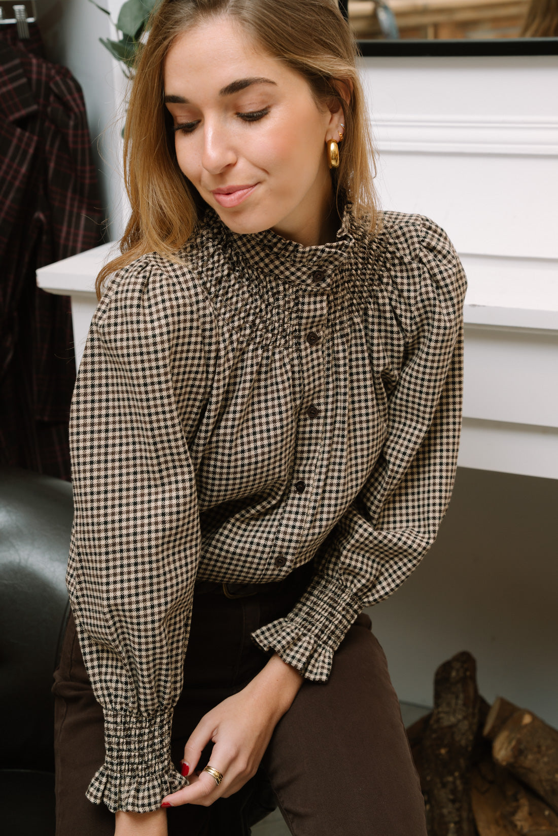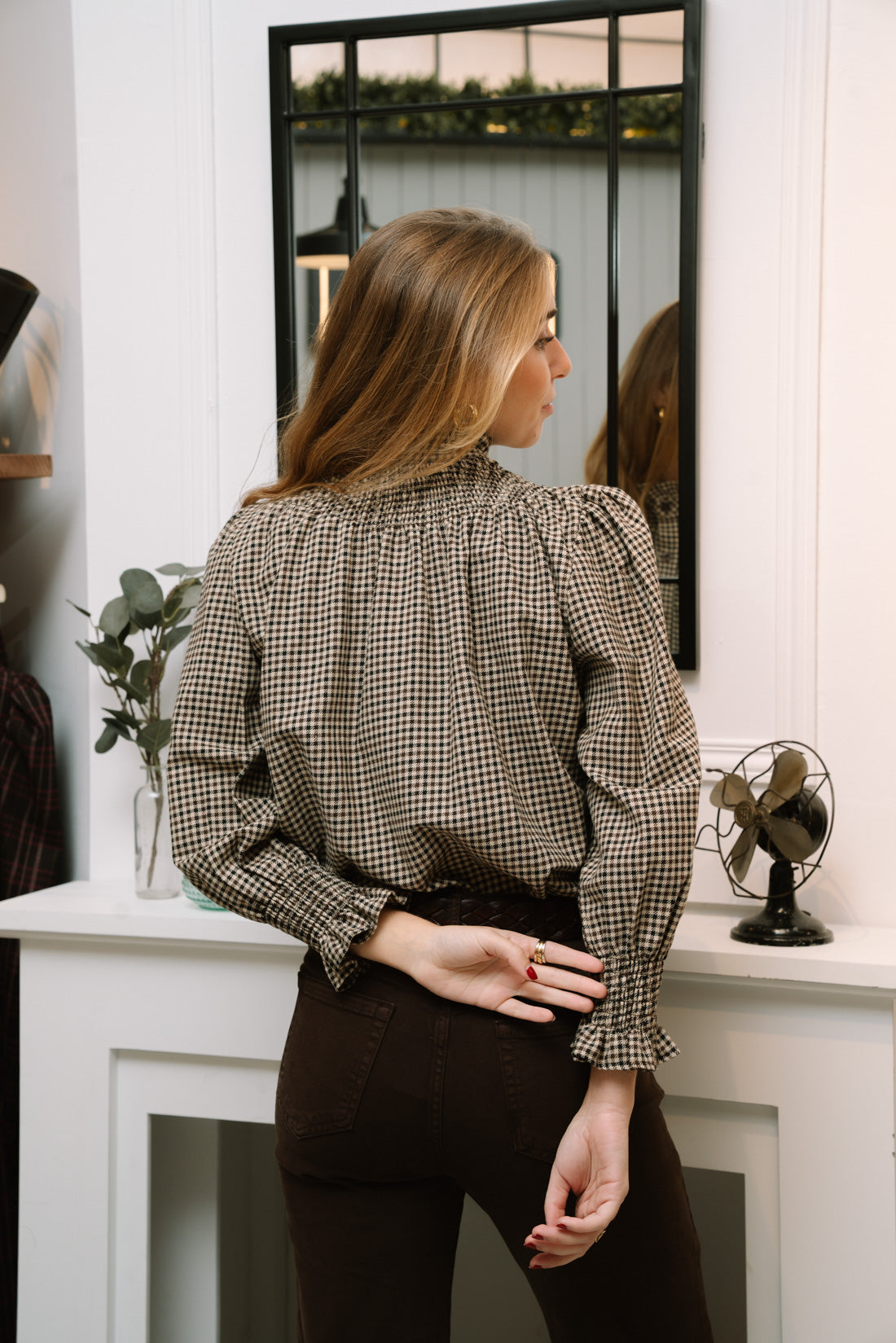Blusa KHUINA con estampado vichy choco. La elegancia y versatilidad de una camisa abotonada con inspiración victoriana. Cuello alto y mangas con goma. 75% algodón 25% poliester. T.M ( la modelo utiliza t.XS)