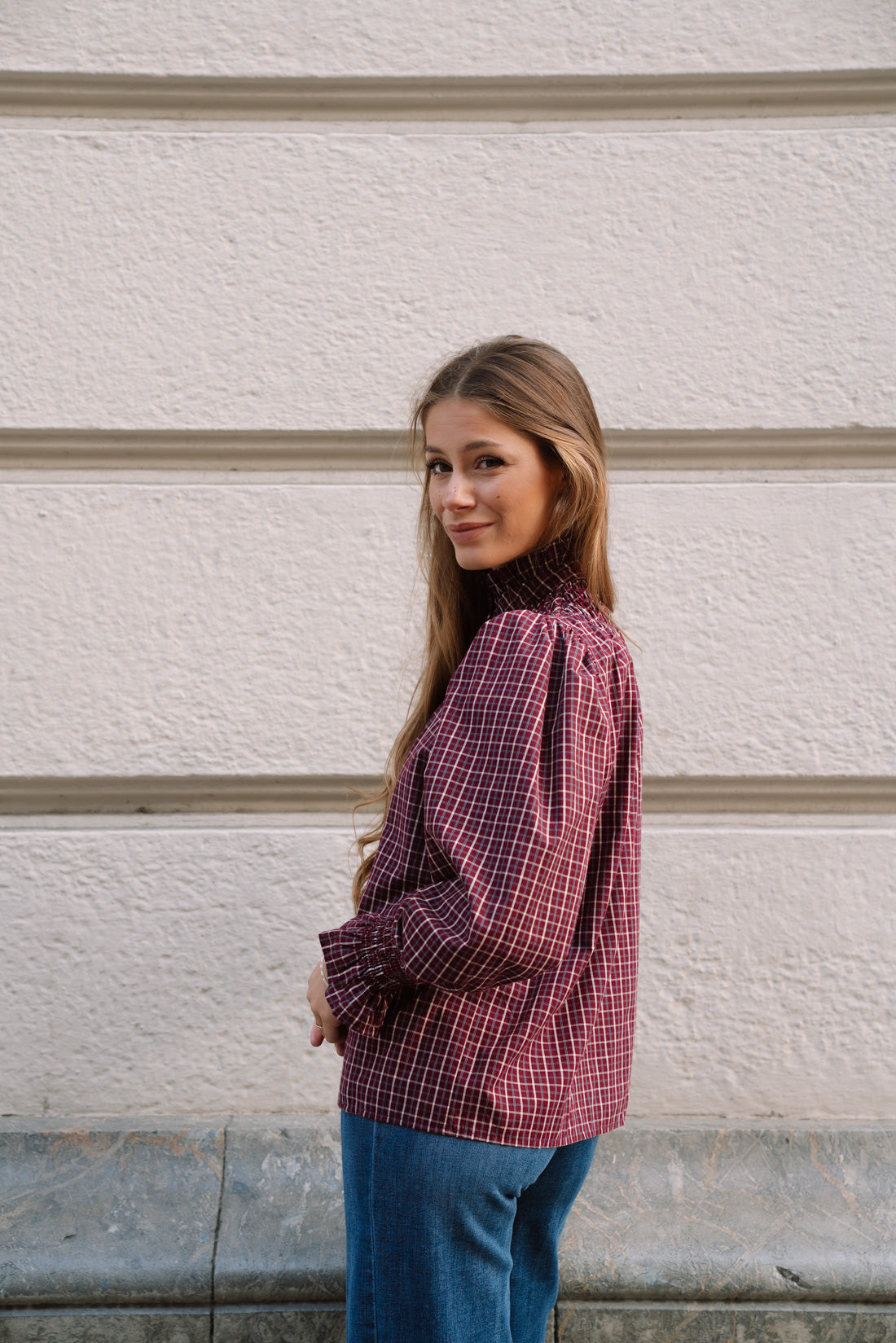 Blusa KHUINA con estampado tartán vino. La elegancia y versatilidad de una camisa abotonada con inspiración victoriana. Cuello alto y mangas con goma. 100 % algodón. T.U equivalente a T.M ( la modelo utiliza t.XS)