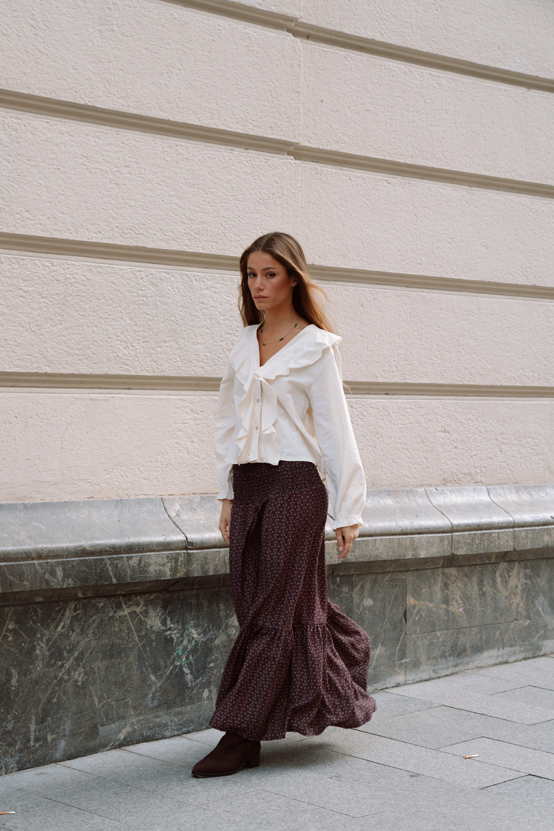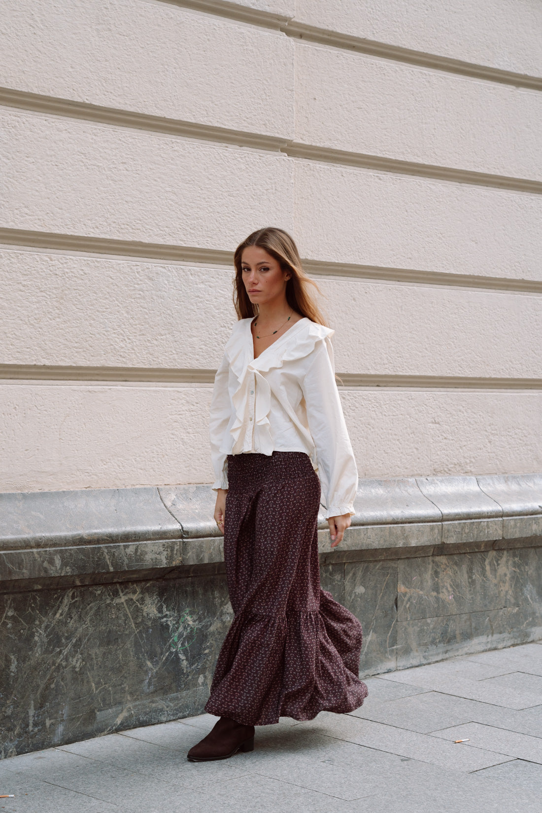 Camisa VIOLETT choco. Blusa abotonada pico 100% algodón con detalle de chorrera en el pecho. Manga con goma y pequeño volante. T.U (la modelo utiliza T.S)