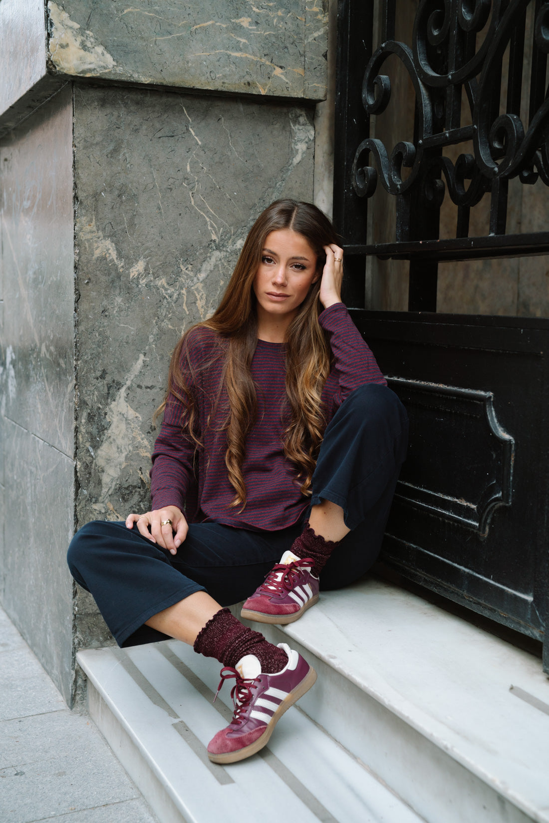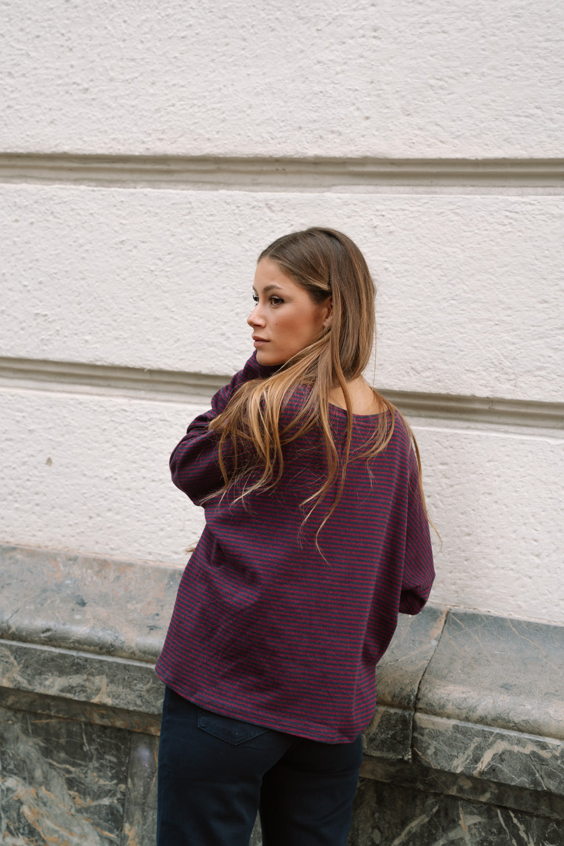 Camiseta tipo jersey FRANCIS rayas vino. Cómodo y versátil. 100% algodón. T.U equivalente a S-M (La modelo utiliza T.S)