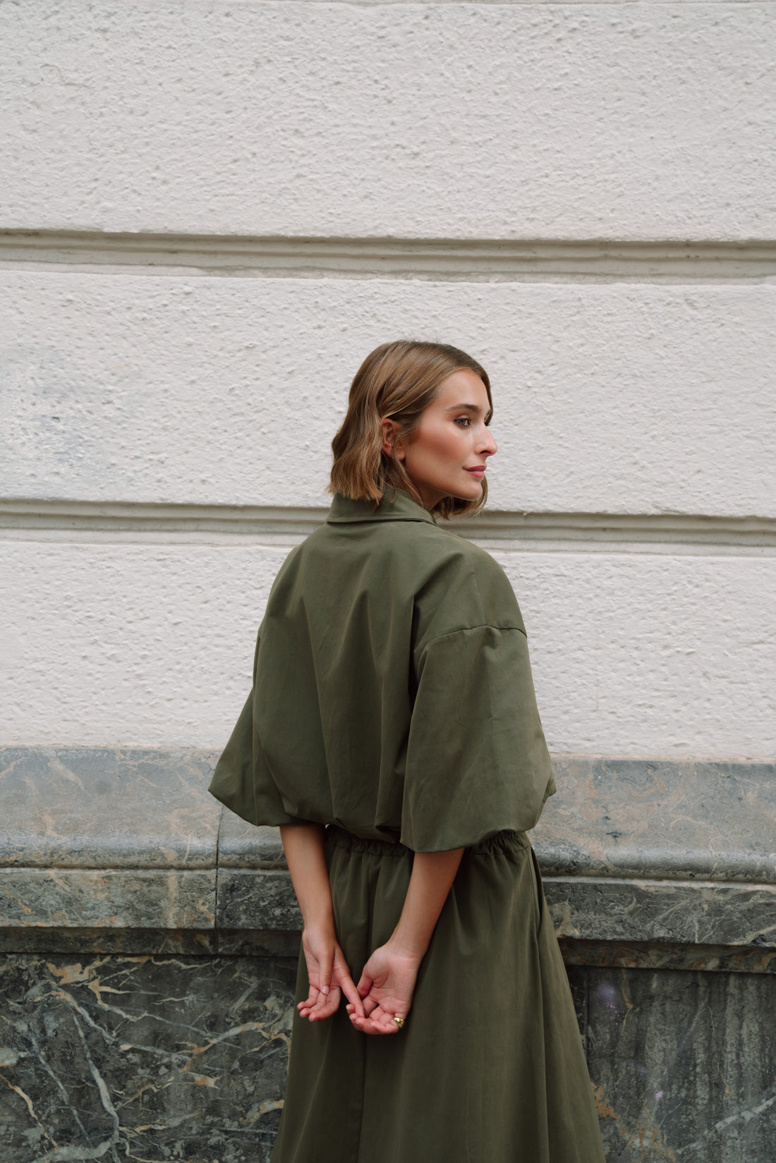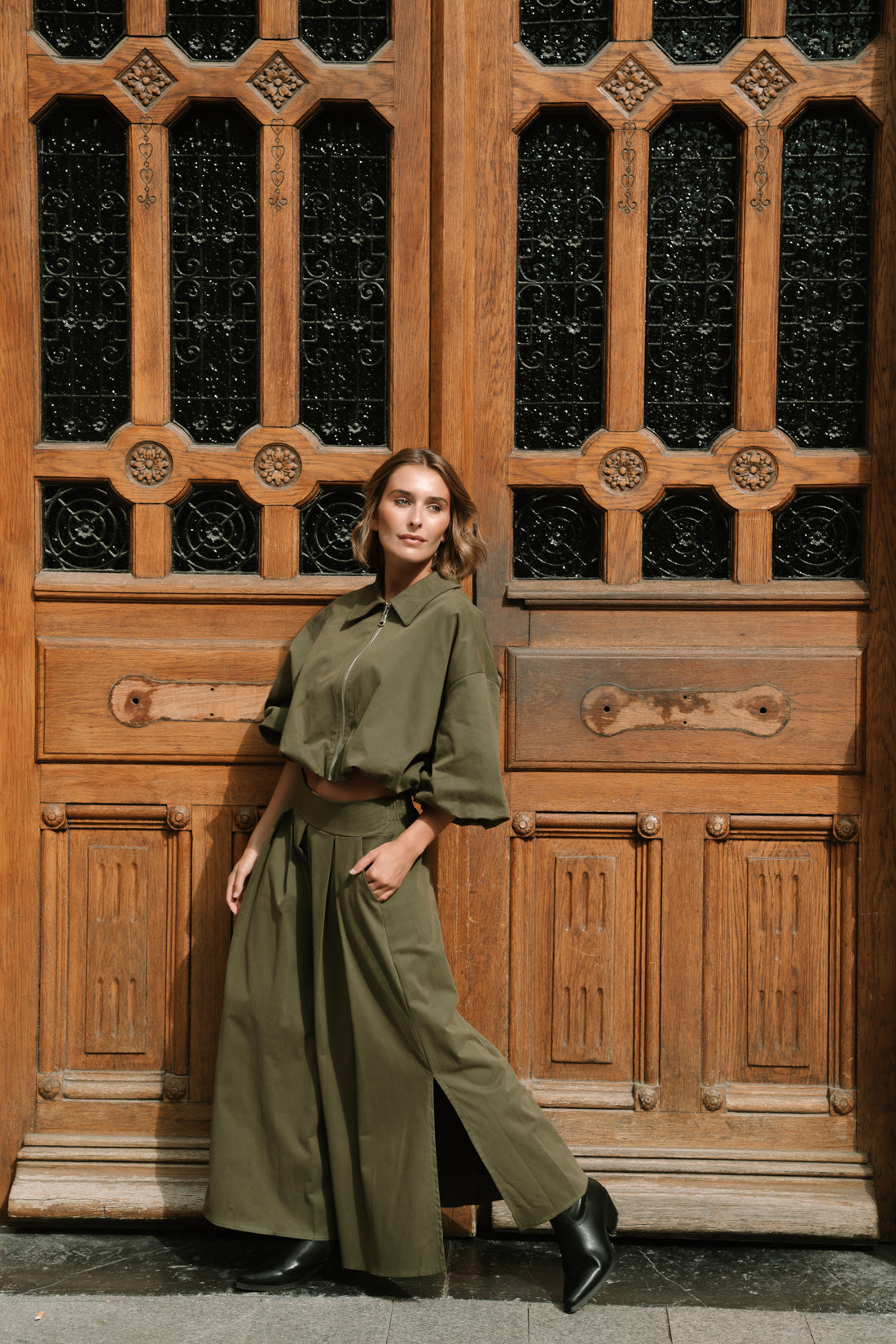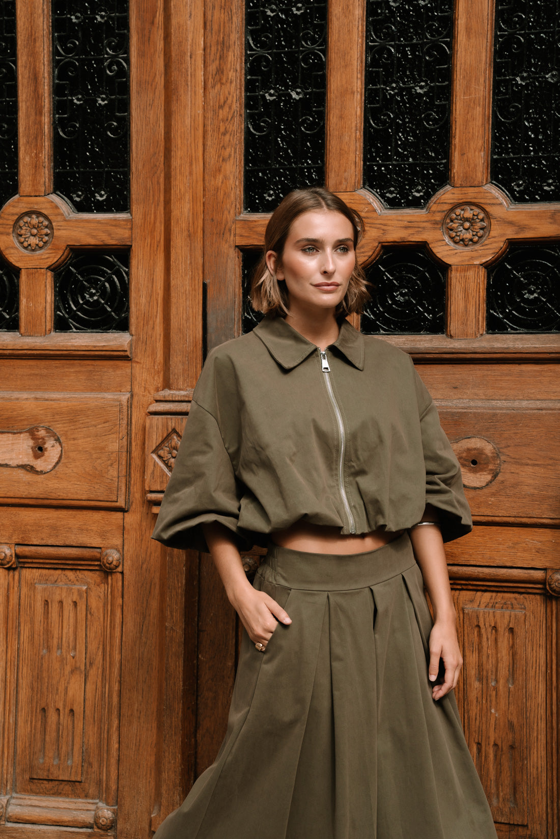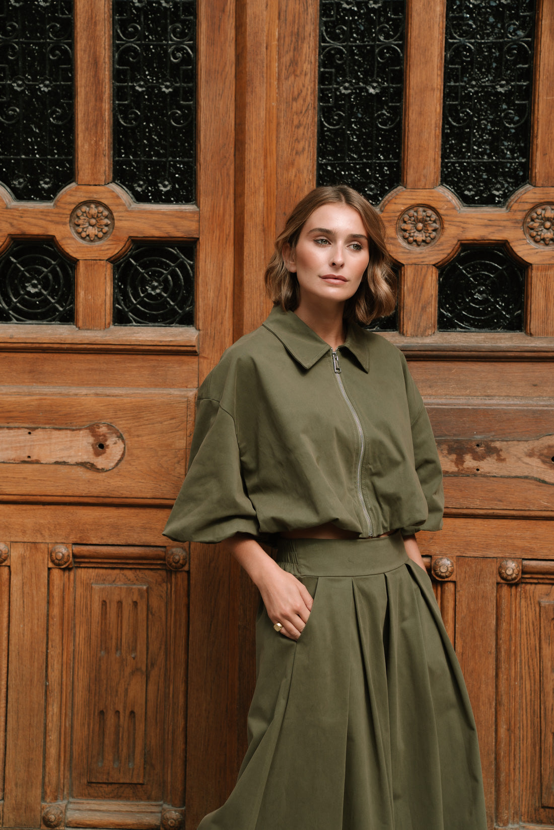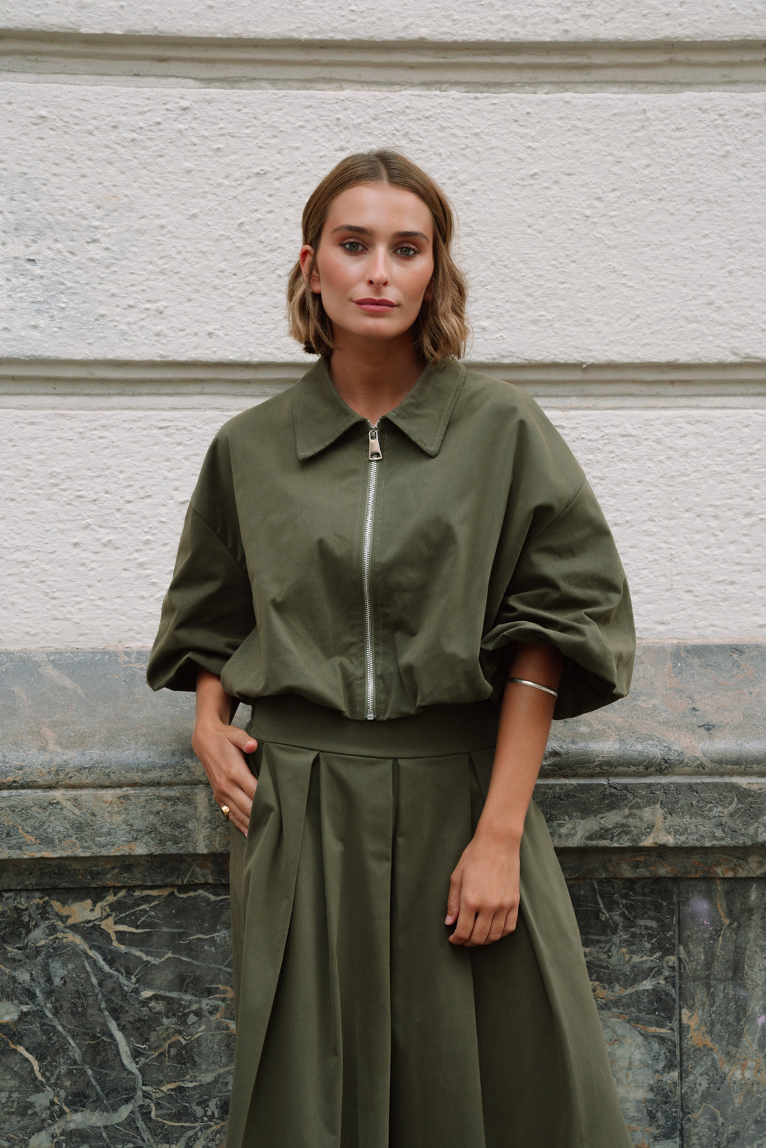 Chamarra VOGH kaki con cremallera. Bajo y mangas abullonadas con goma. Cómodísimo tejido "tacto melocotón" 80% algodón 17% viscosa 3% elastano. T.U equivalente a S-M ( La modelo utiliza XS)