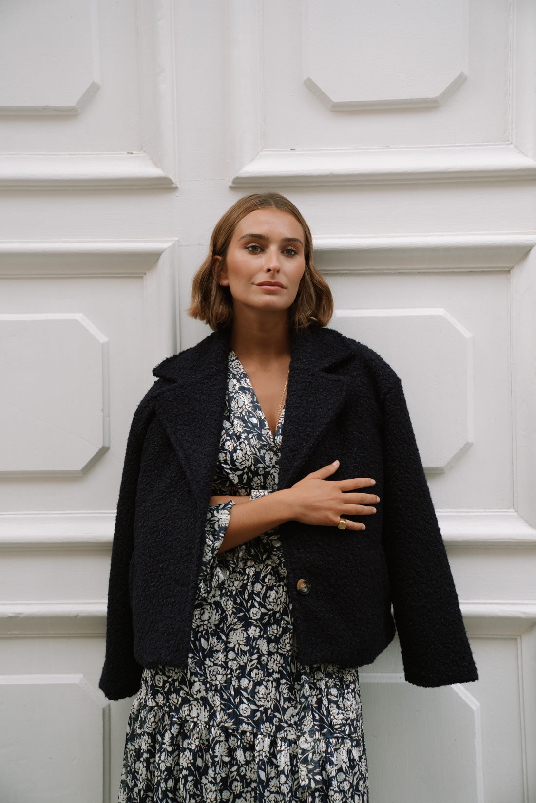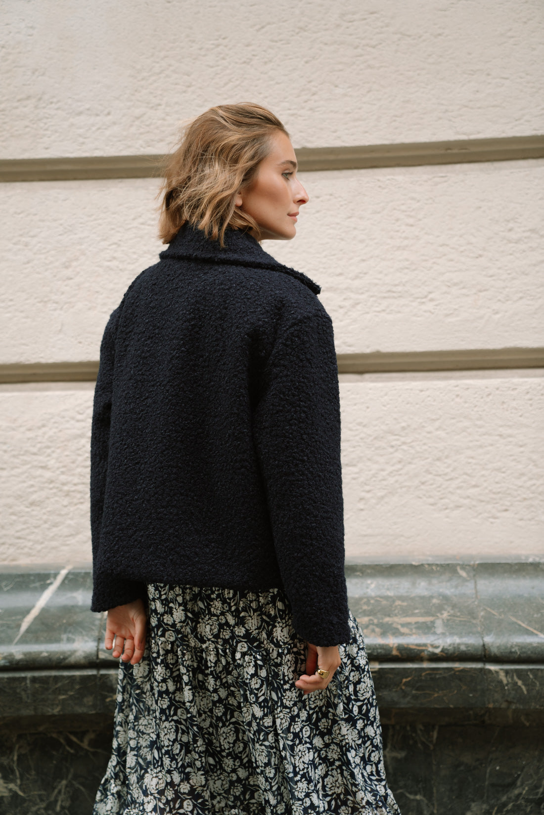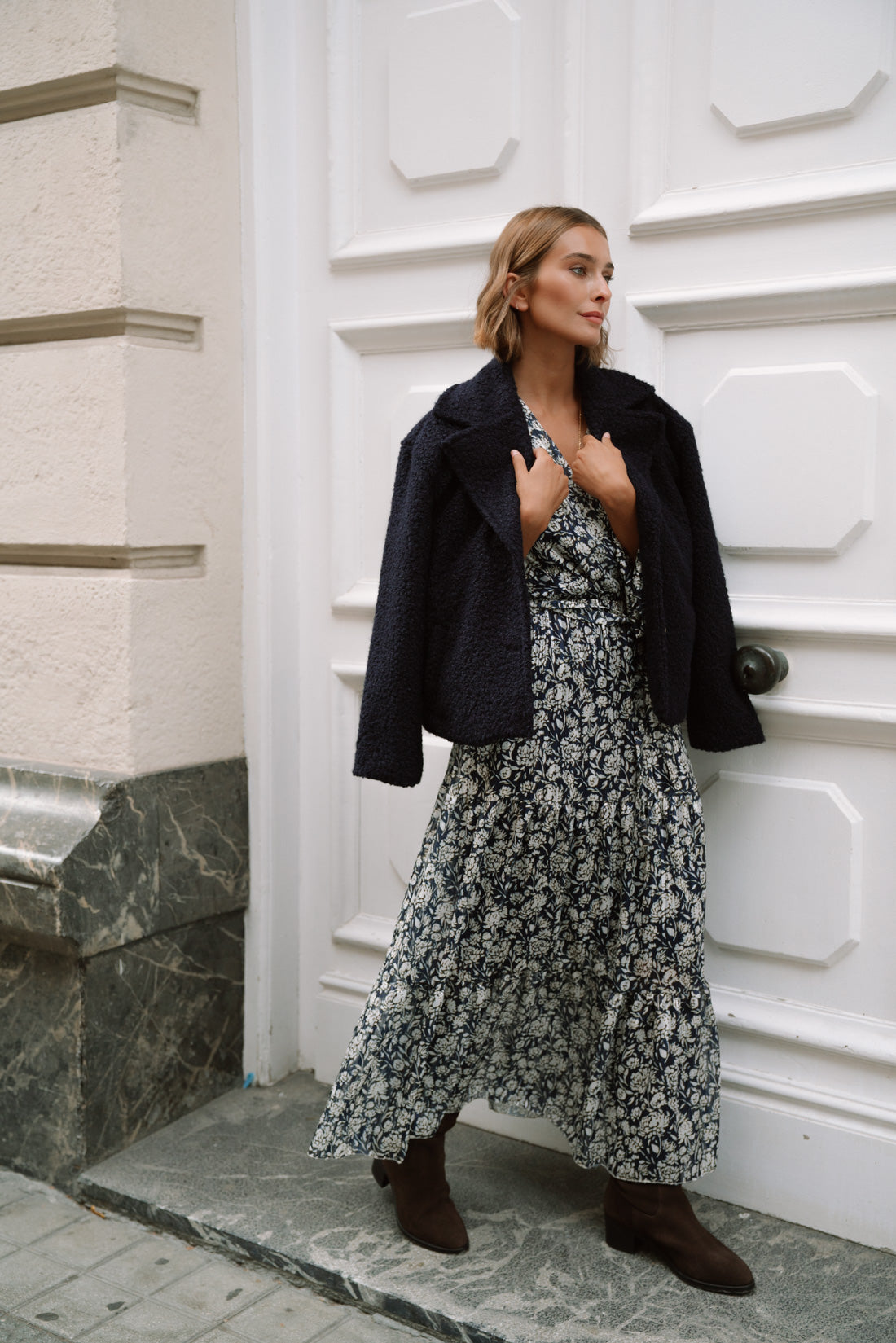 Chaqueta DOLLS marino borreguito sintético. La prenda perfecta para elevar tu outfit y darle un toque actual y sofisticado. T.U. equivalente a S-M (La modelo utiliza T.XS)