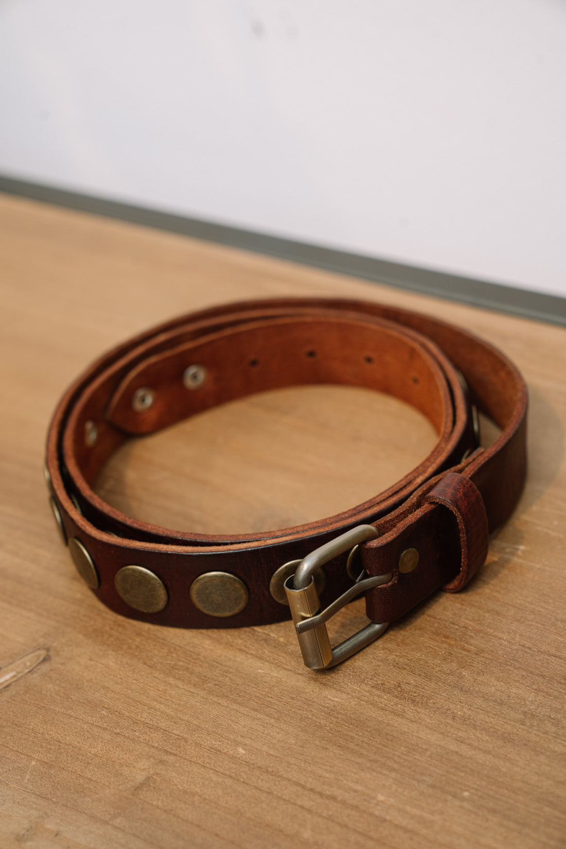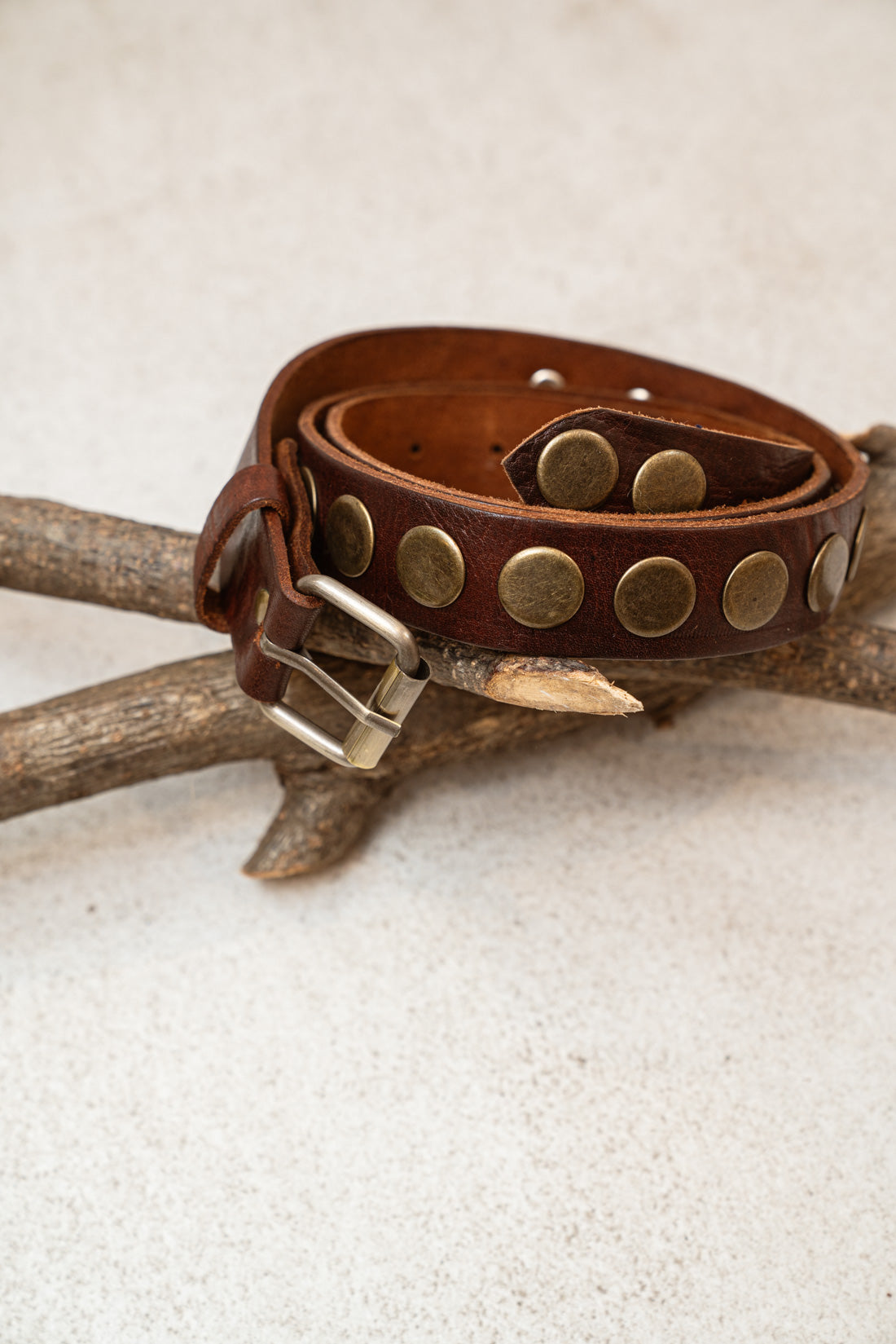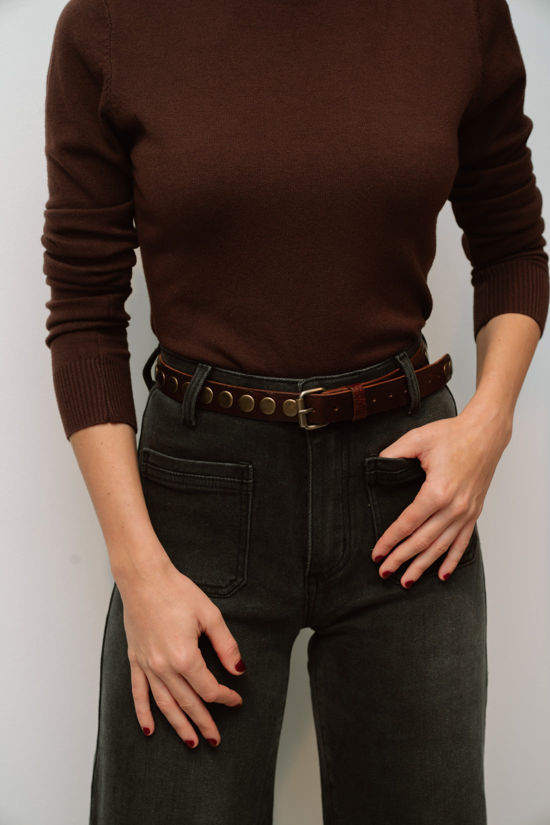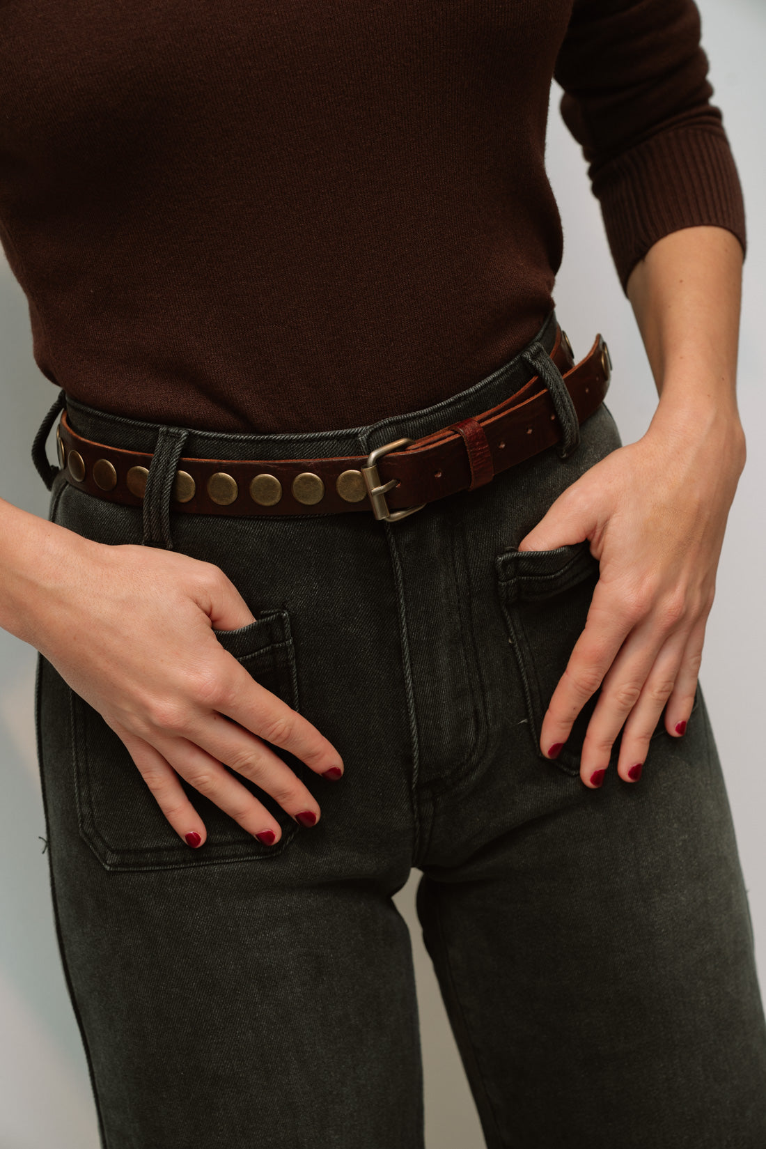 Cinturón marrón hebilla con tachas doradas.