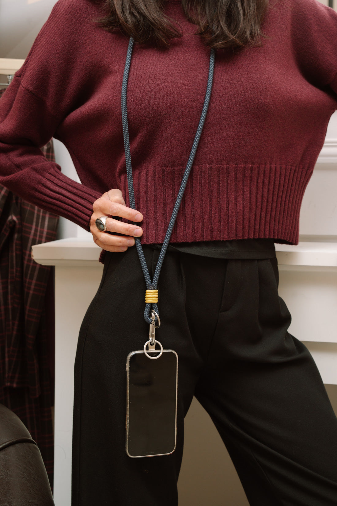 Cuelgamovil mostaza largo para bolsillo.