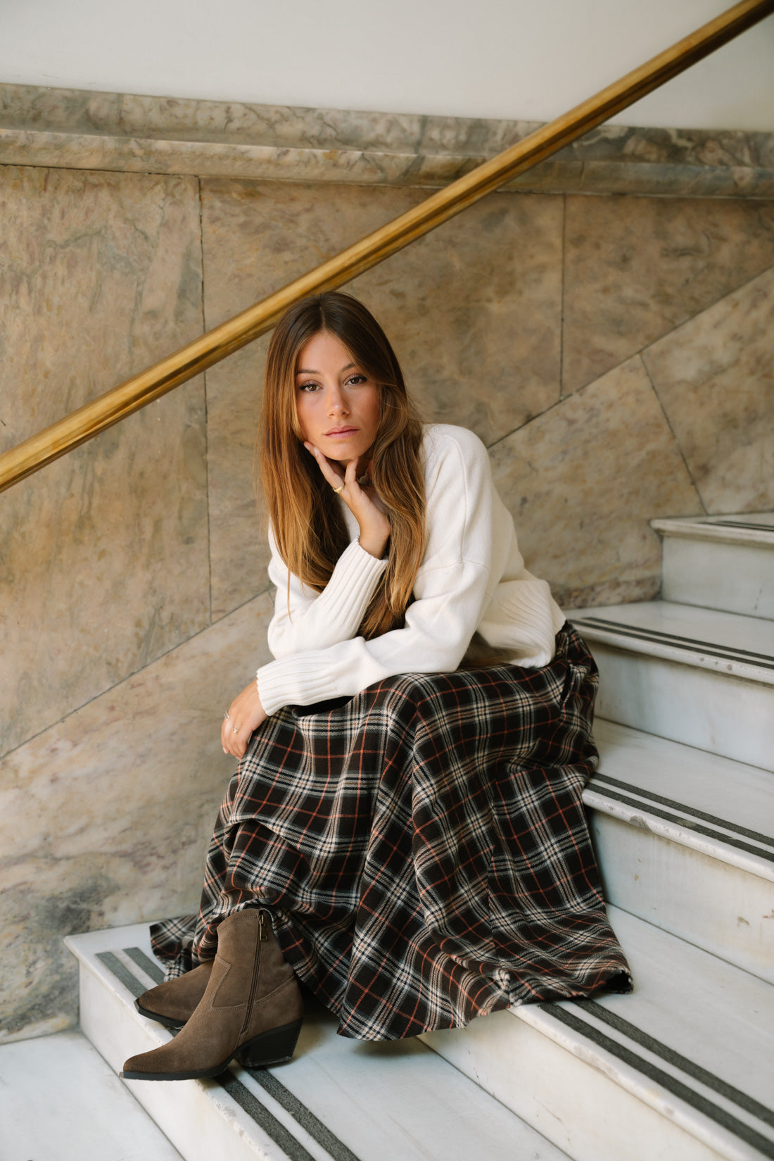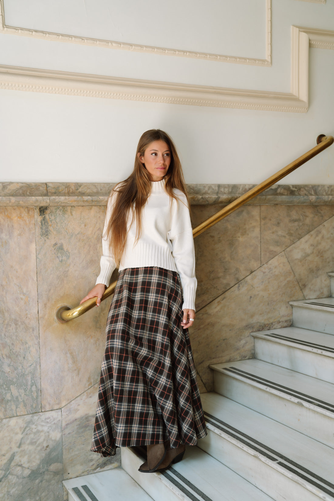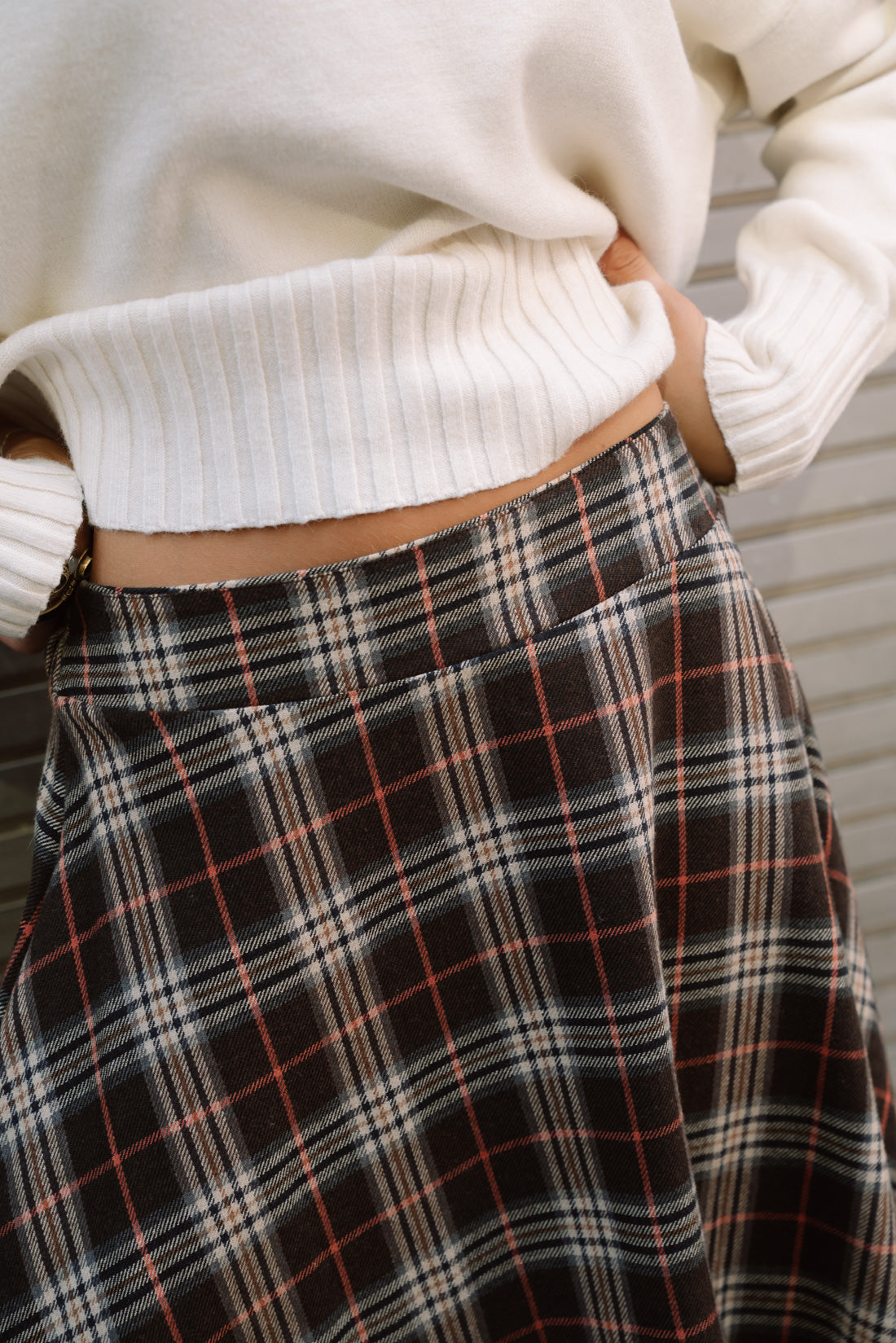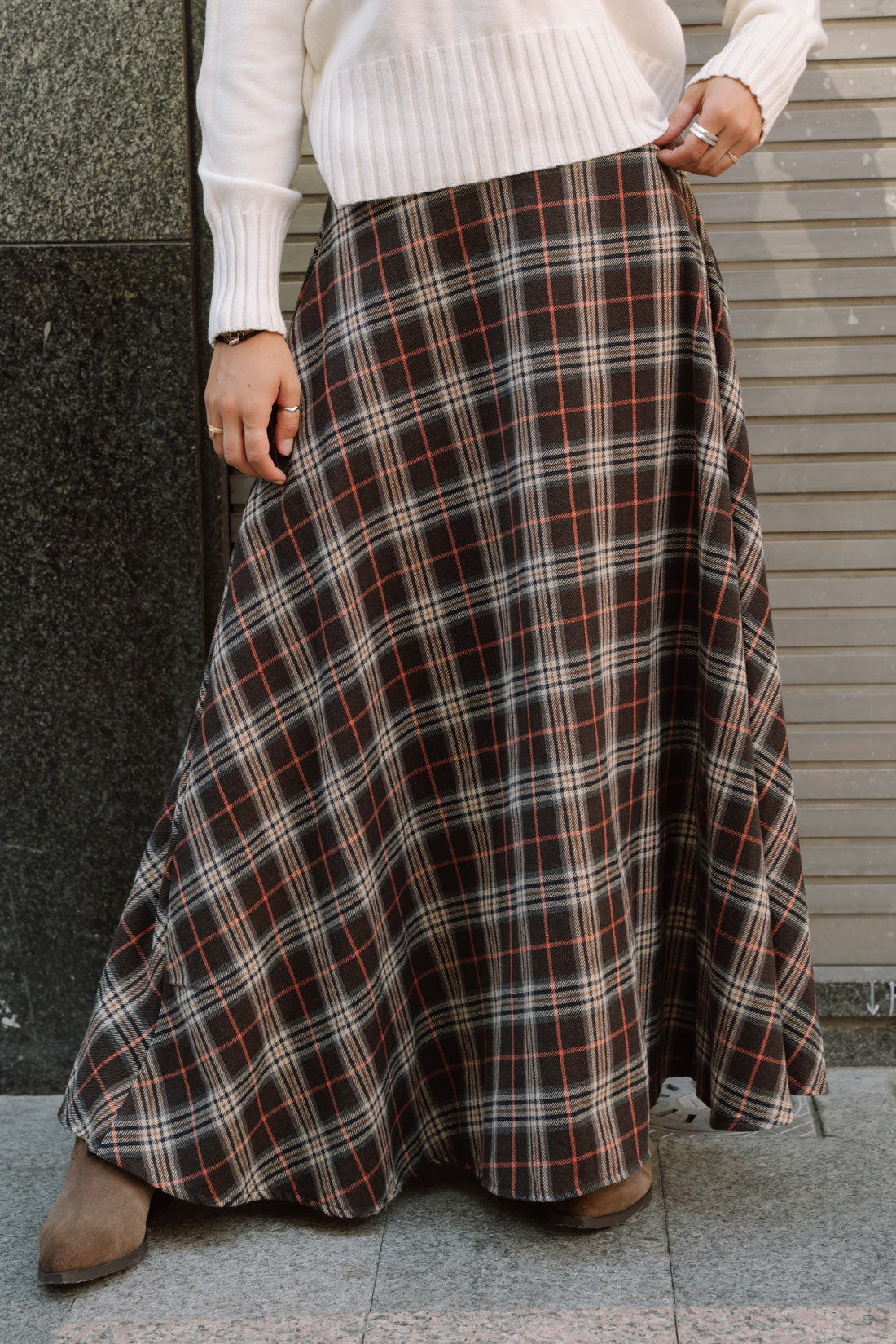 Falda ESCOCIA choco. Falda oversize con bolsillos ocultos. Tejido tartán en tonos marrones 80%algodón 20%poliester T.U. equivalente a S-M (La modelo utiliza talla XS)