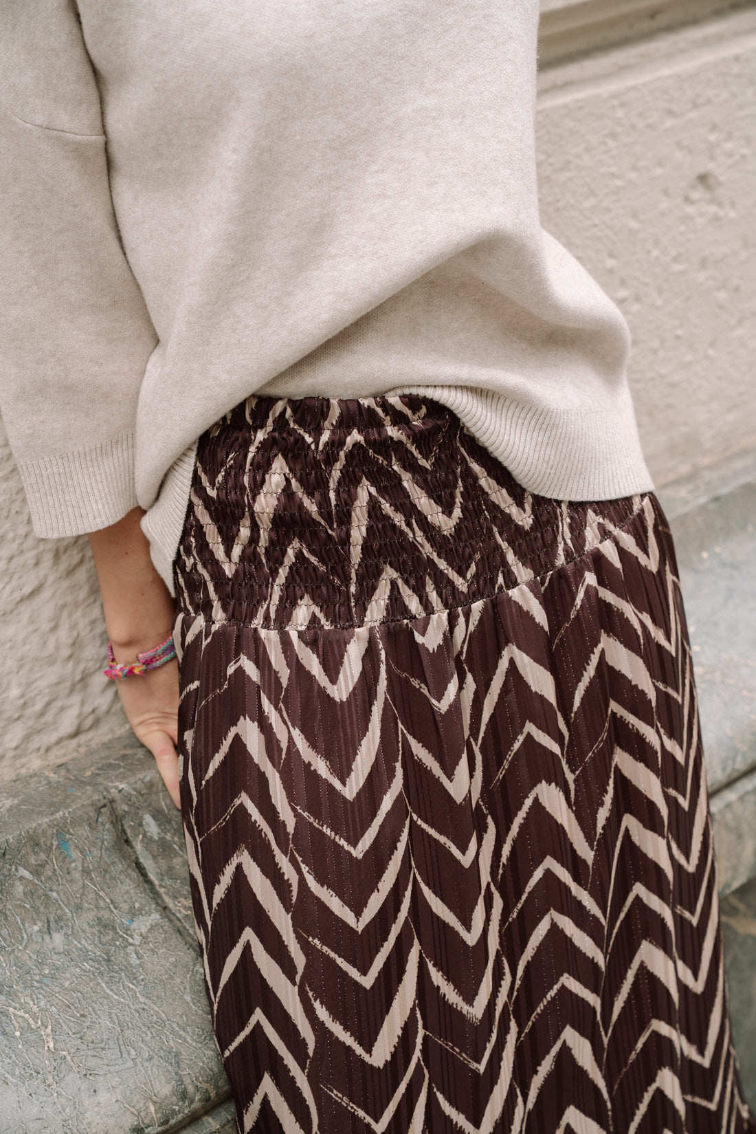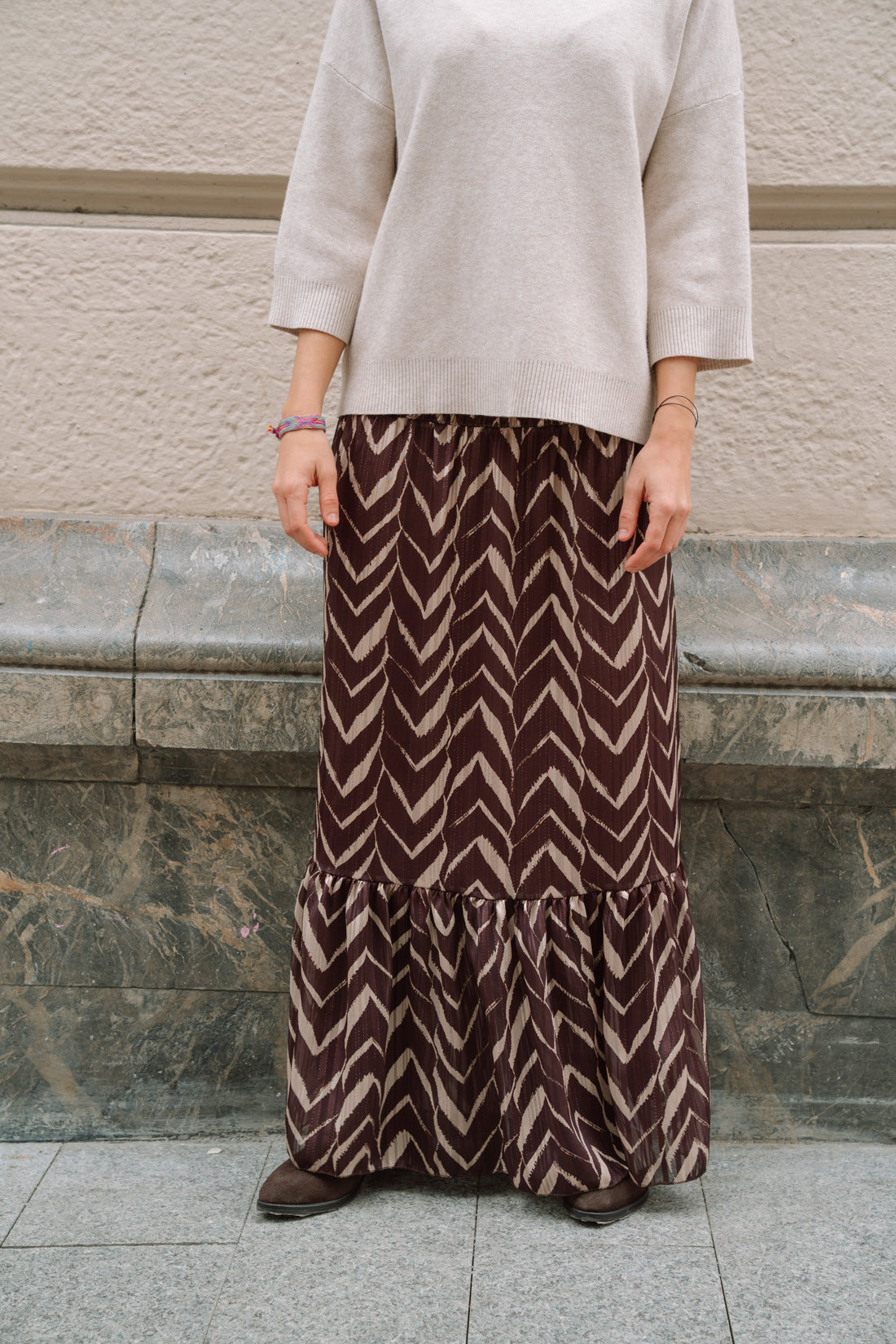Falda PRADY de gasa con estampado de espiga en tonos choco y beige Tejido de gasa con hilo metalizado. Detalle de goma en la cintura y volante que aporta feminidad al look. T.U. equivalente a S-M gracias al diseño y elástico de la cintura. La modelo utiliza talla XS.