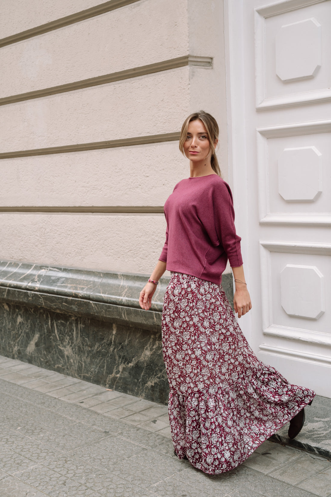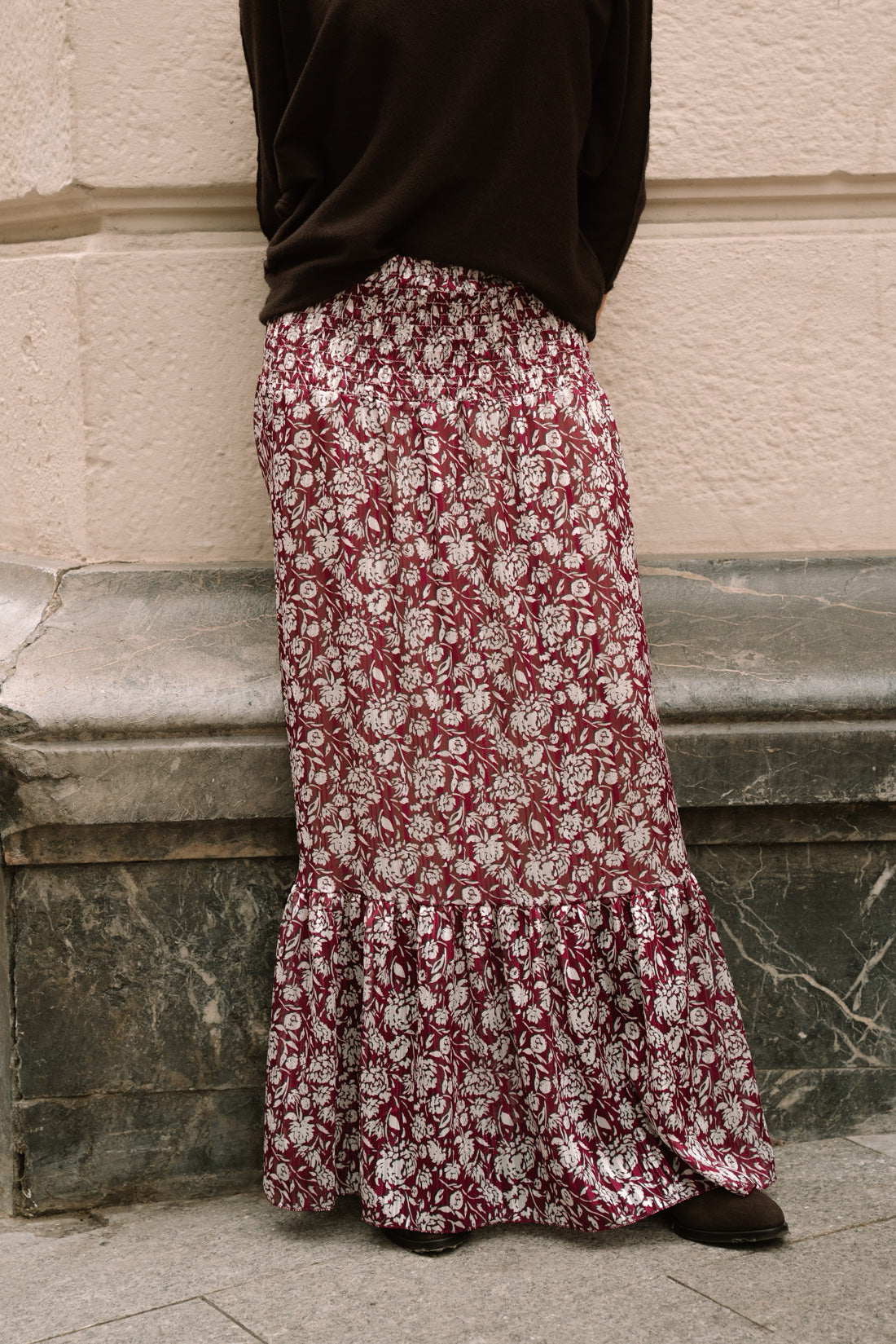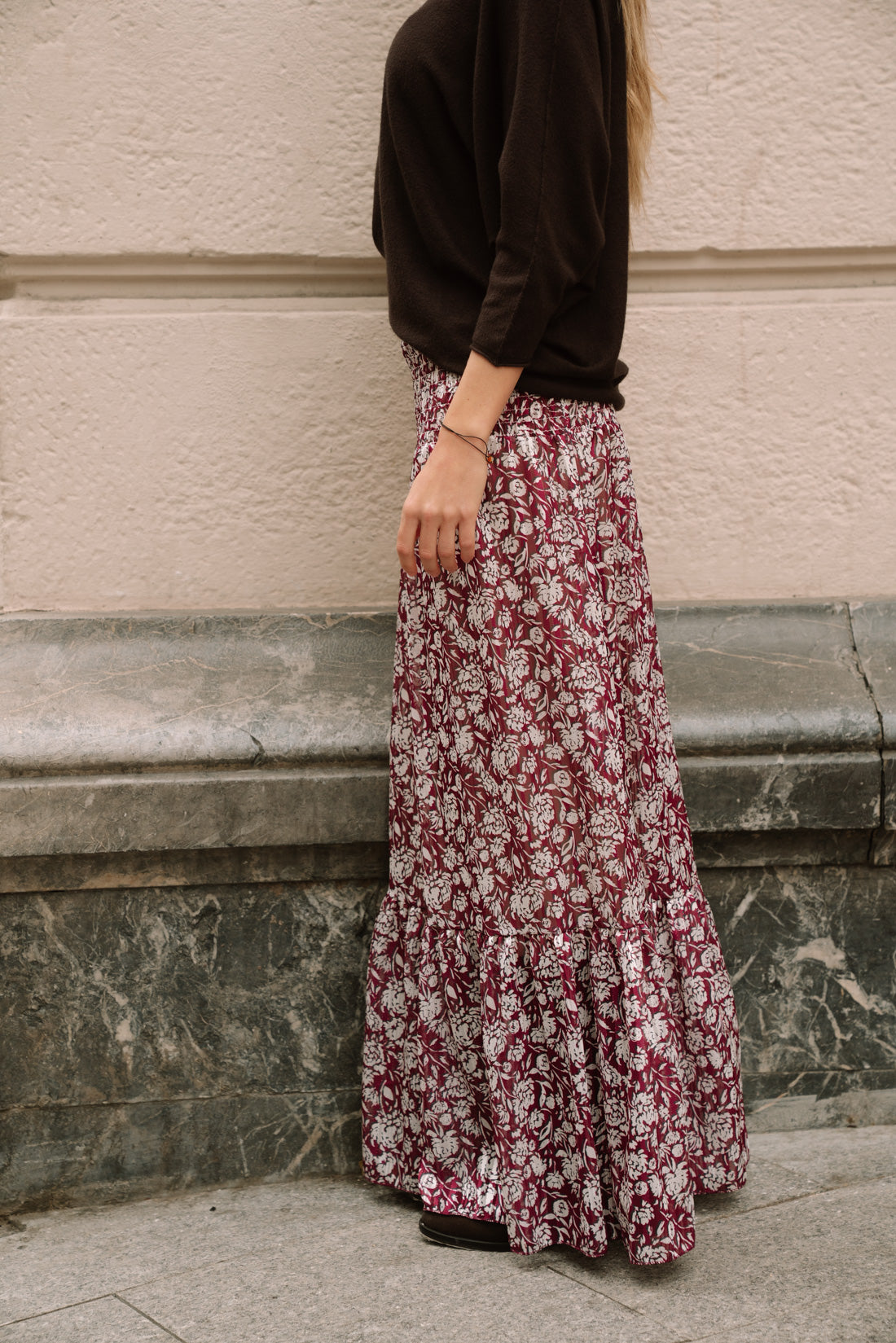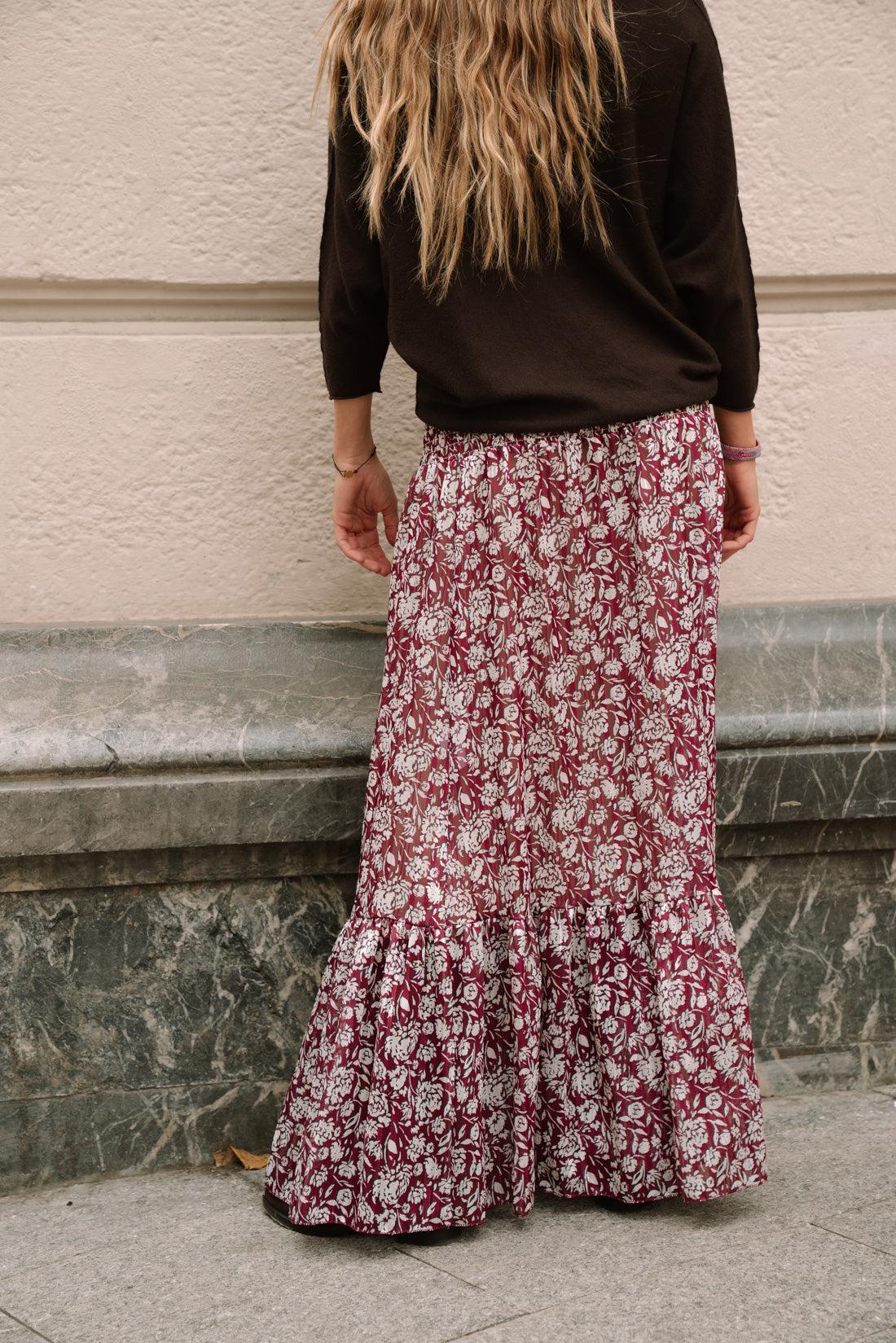 Falda PRADY de gasa con estampado de flores en tonos burdeos. Tejido de gasa con hilo metalizado. Detalle de goma en la cintura y volante que aporta feminidad al look. T.U. equivalente a S-M gracias al diseño y elástico de la cintura. La modelo utiliza talla XS.