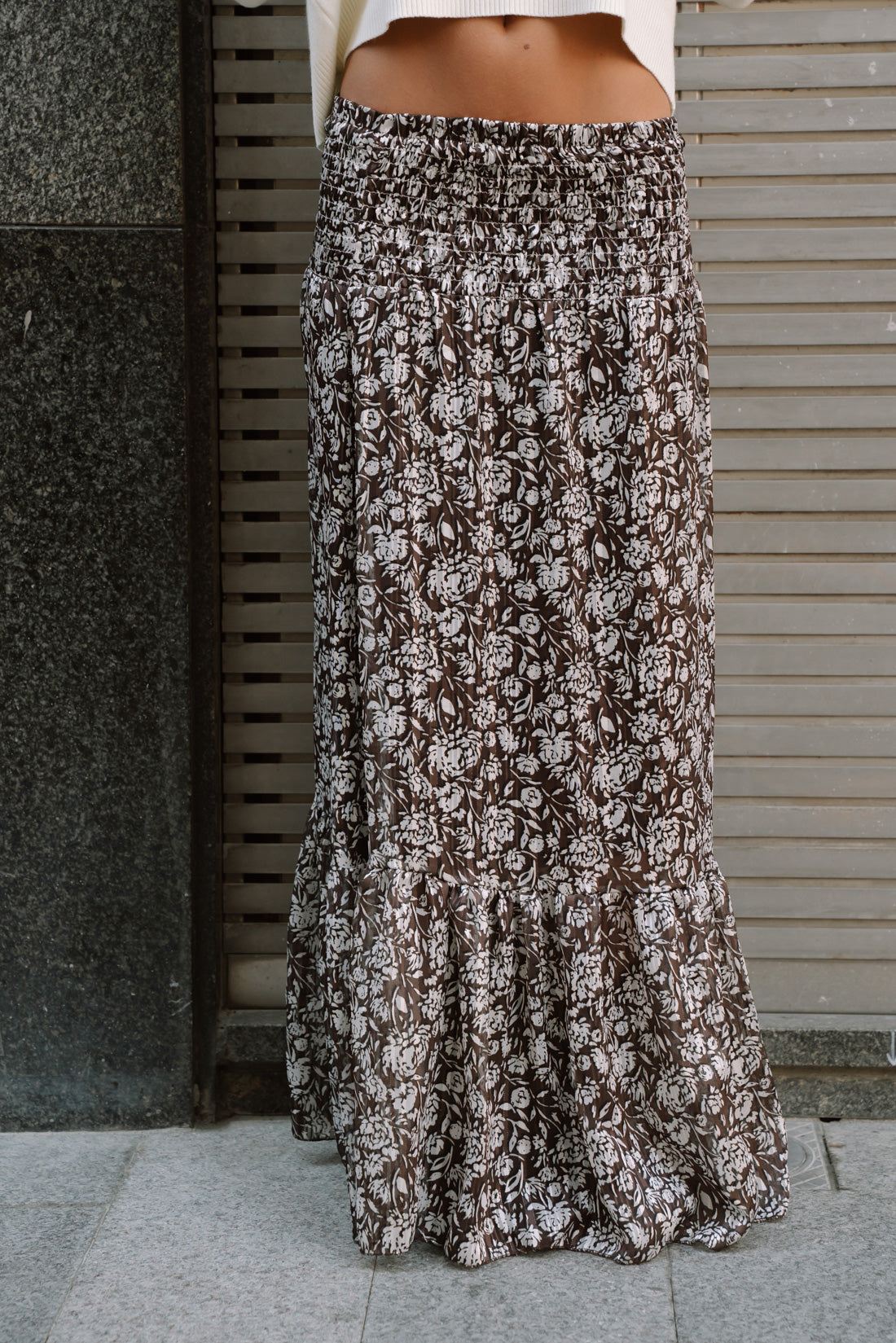 Falda PRADY de gasa con estampado de flores en tonos choco, negro y beige. Tejido de gasa con hilo metalizado. Detalle de goma en la cintura y volante que aporta feminidad al look. T.U. equivalente a S-M gracias al diseño y elástico de la cintura. La modelo utiliza talla XS.