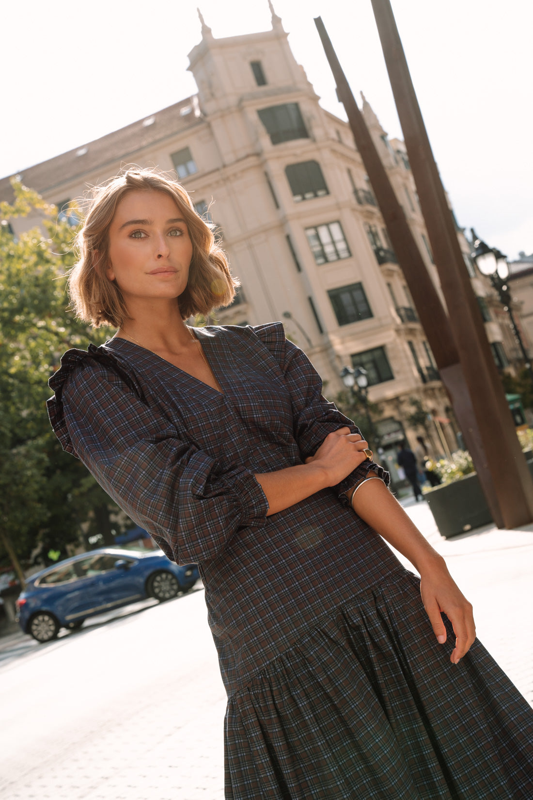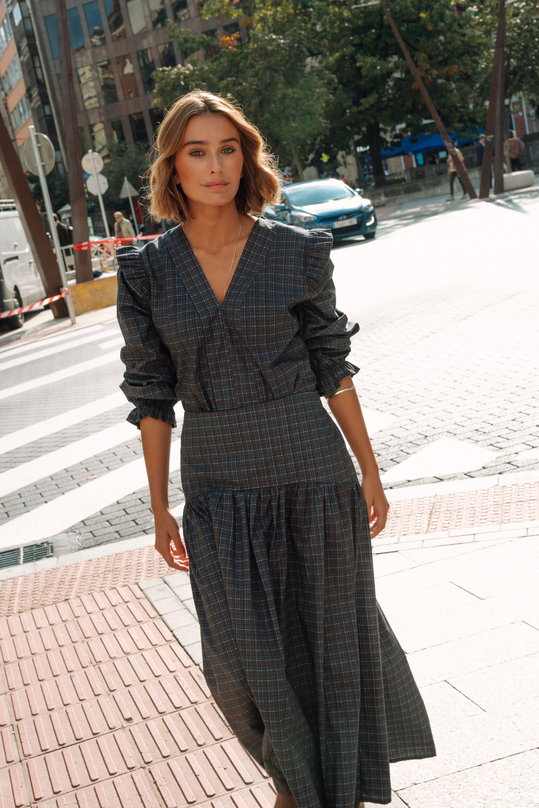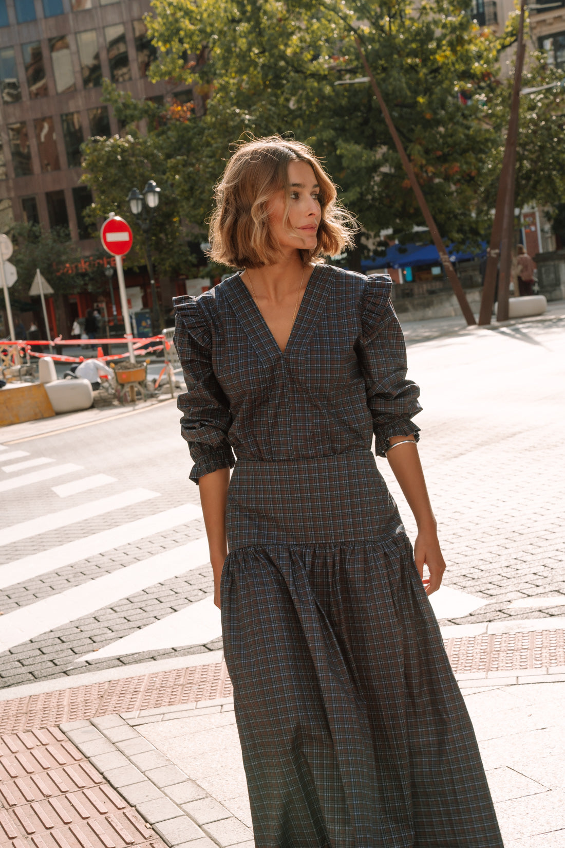 Falda YZAR con estampado tartán en tonos marino y choco. 100% algodón. T.U. equivalente a S-M (La modelo utiliza XS)