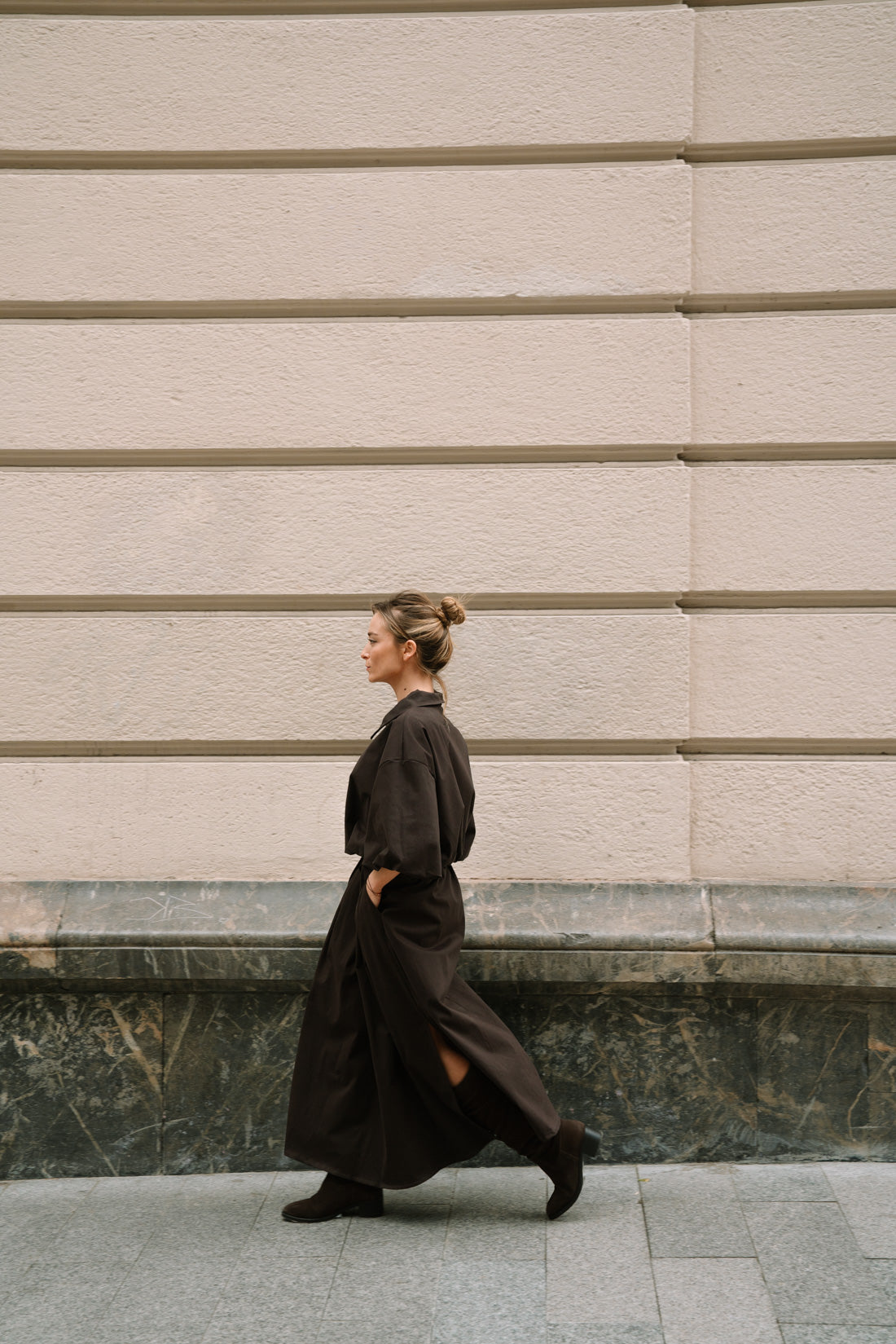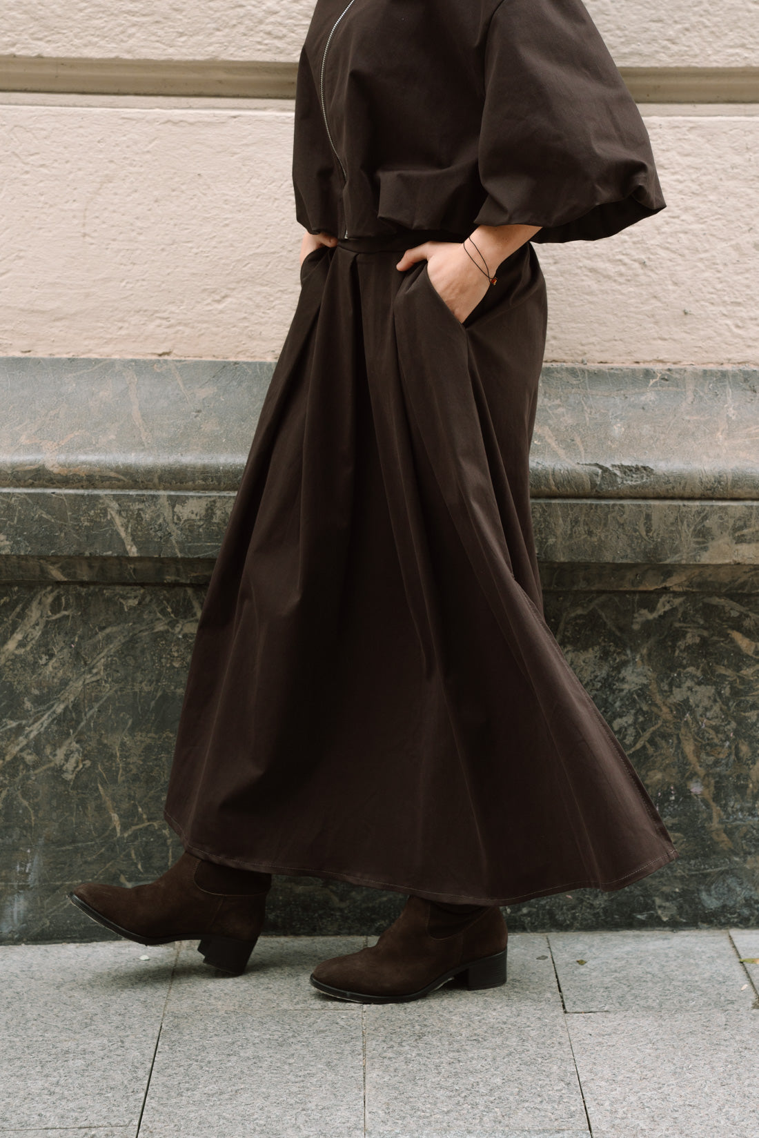 Falda VOGH choco. Falda tableada con bolsillos con goma en la parte trasera de la cintura. Cómodísimo tejido "tacto melocotón" 80% algodón 17% viscosa 3% elastano. T.U equivalente a S-M ( La modelo utiliza XS)