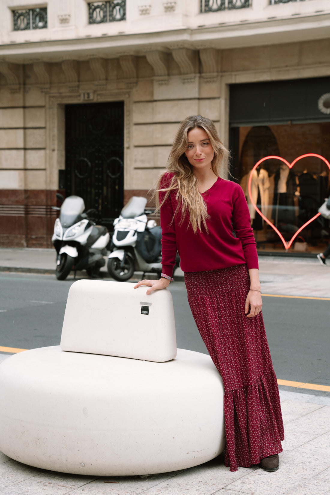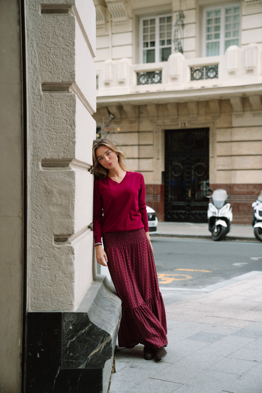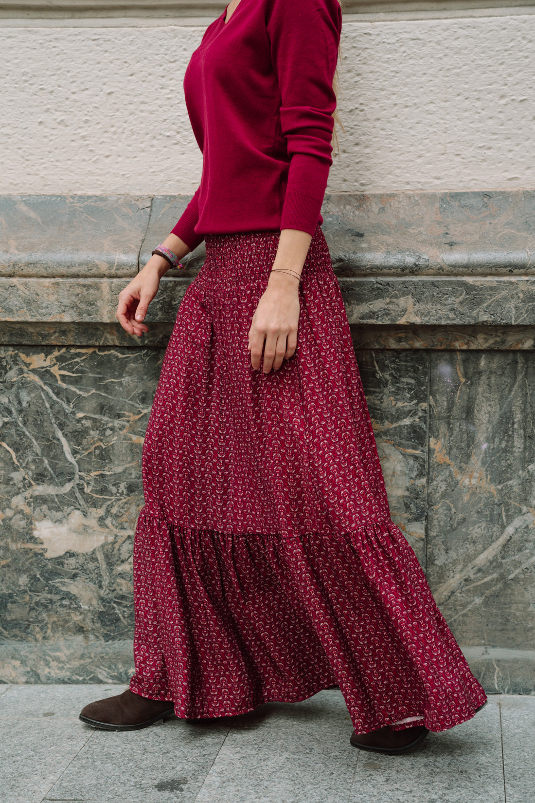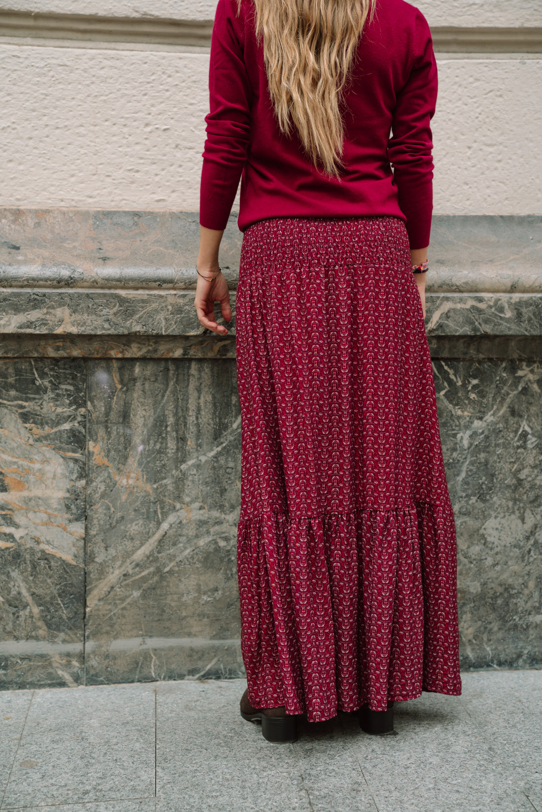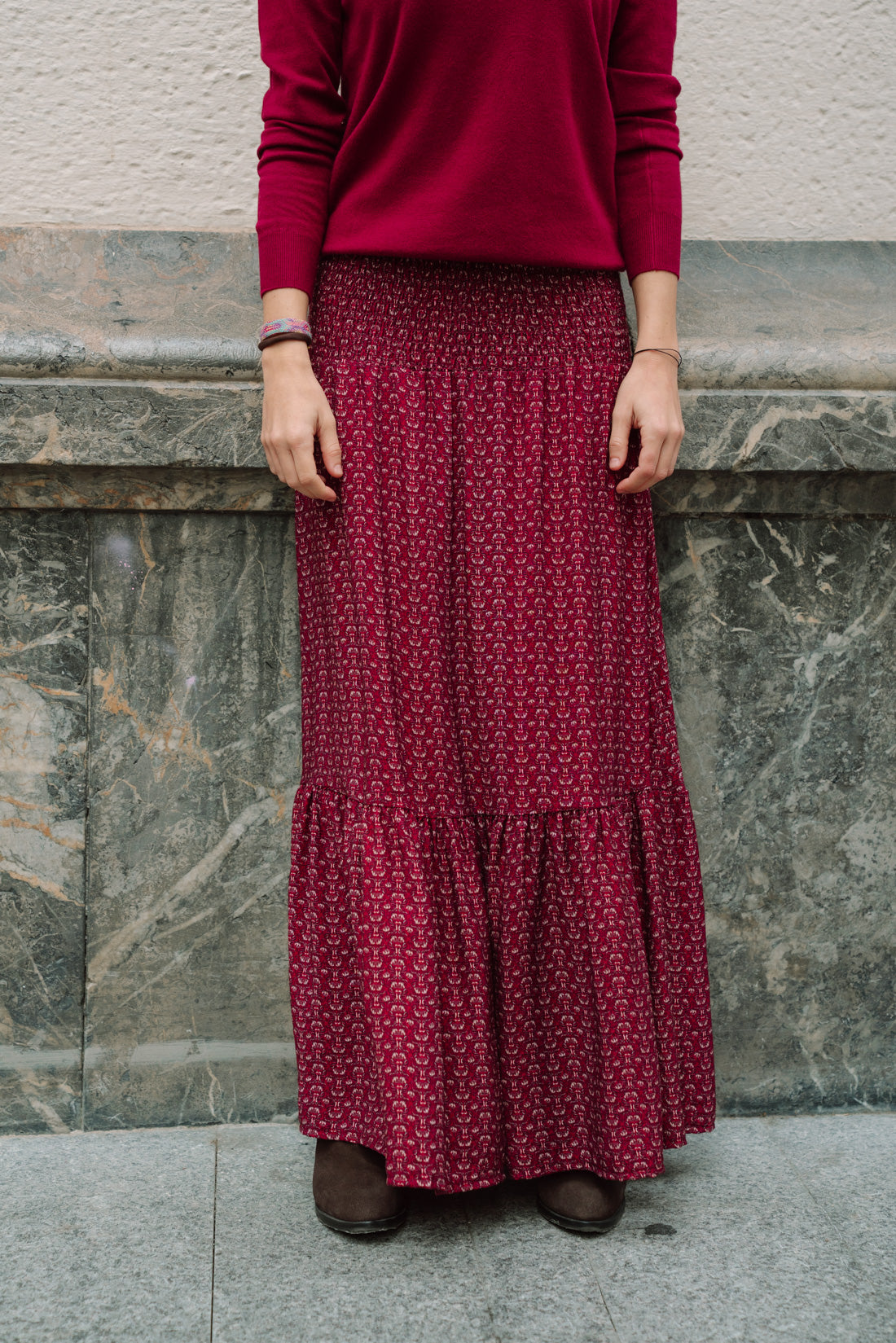 Falda fluida con goma ancha en cintura y volante inferior. 100% Viscosa. Estampado estilo Morris en tonos burdeos. T.U. equivalente a S-M ( La modelo utiliza T.XS)