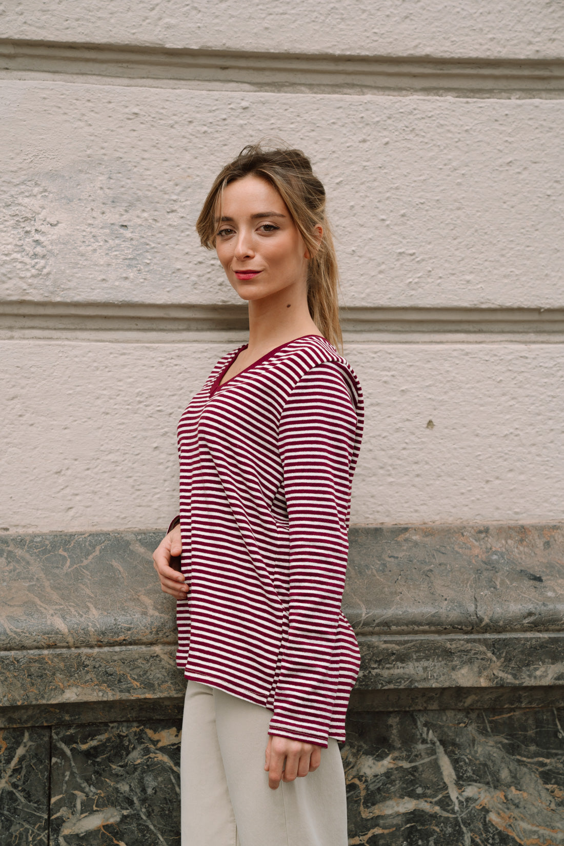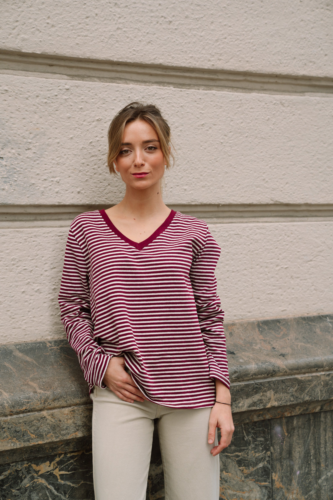 Jersey algodón con rayas blanco y burdeos. Pico de color contrastado en color choco T.U. equivalente a una talla S-M (La modelo utiliza talla XS por lo que le queda amplio)
