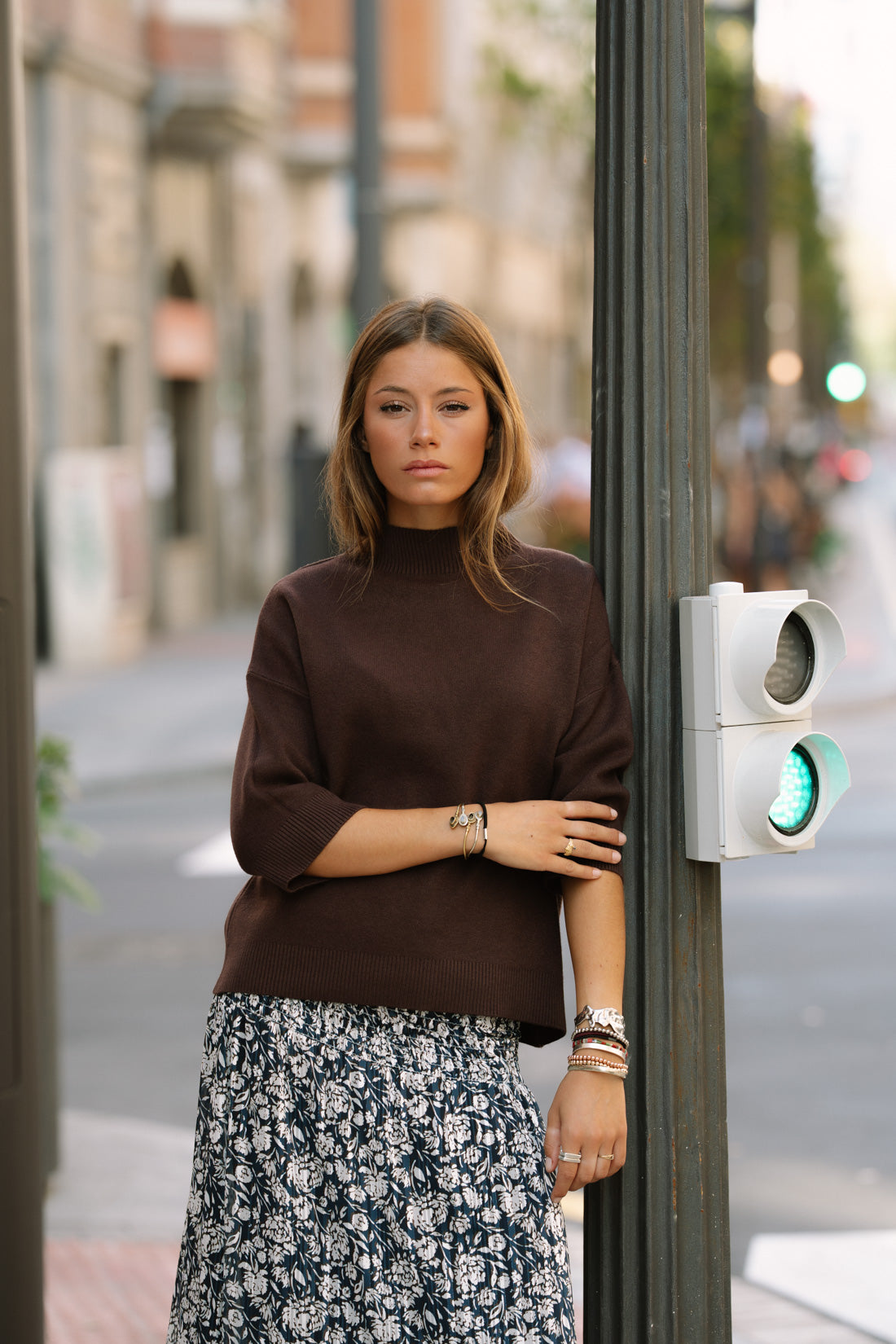 Jersey CHIMMY choco cuello alto con manga francesa. 50%Viscosa 28%Poliester 22%Polyamida T.U.