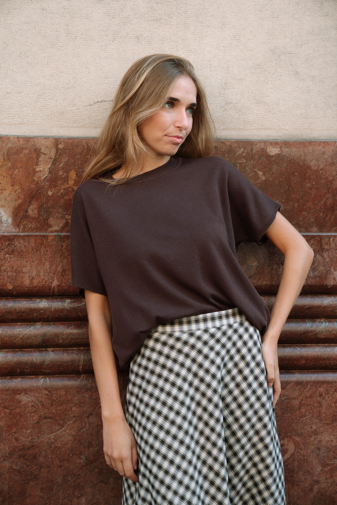 Jersey HITT choco. Cuello redondo y manga corta. Un tejido super suave que te va a encantar. 50%viscosa 22%poliester 22%polyamida. T.U. (La modelo utiliza T.S)