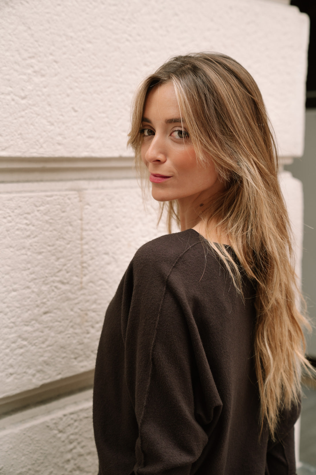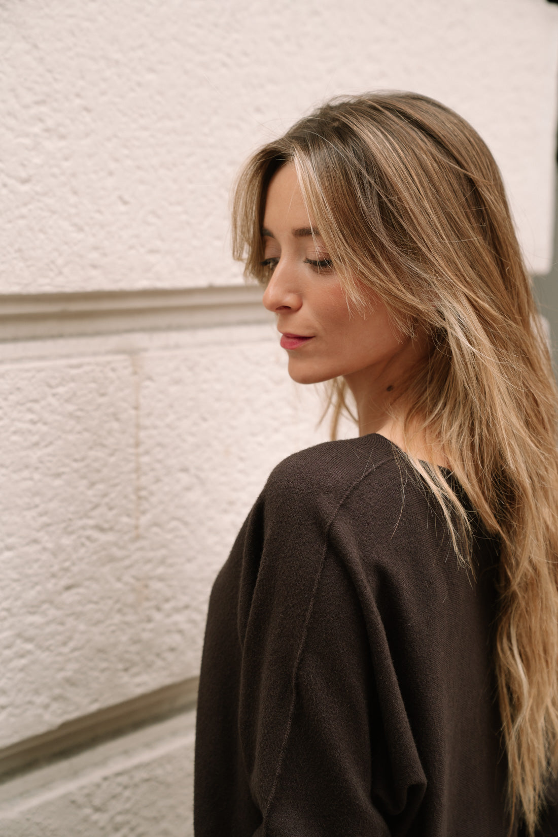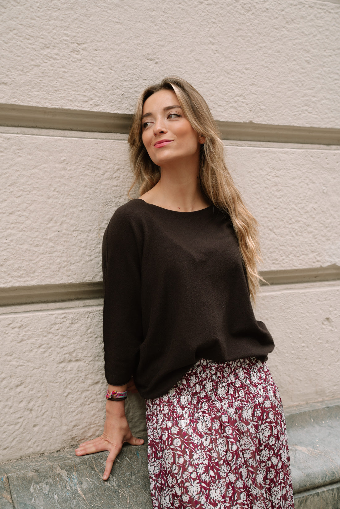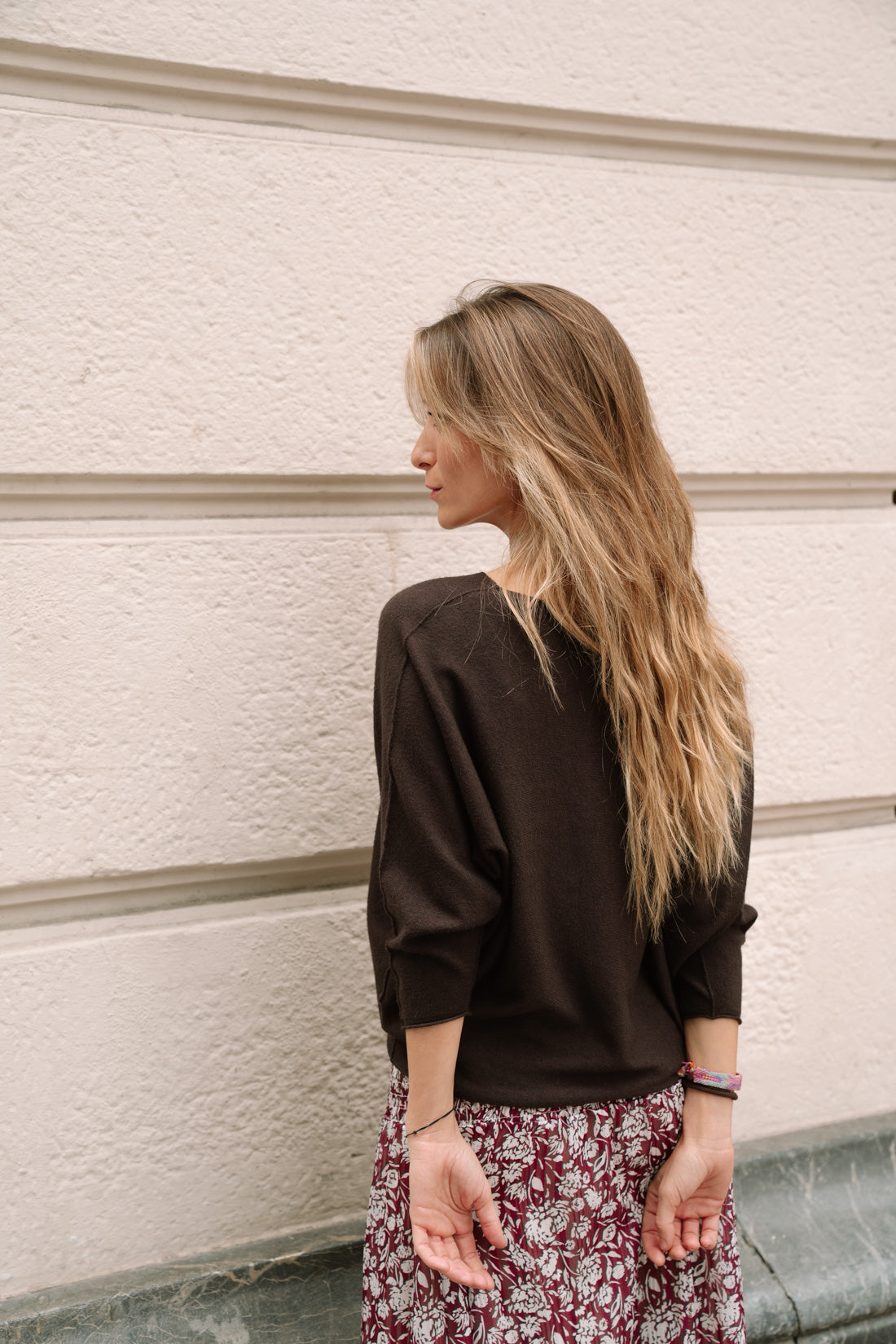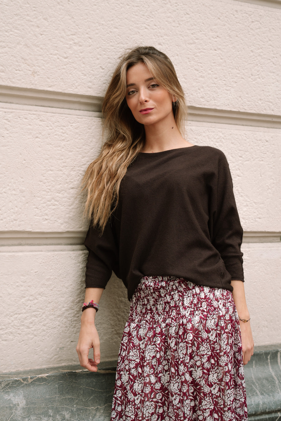 Jersey KIMY choco con cuello barco y manga tipo murciélago. 50% viscosa 28% poliester 22% poliamida. T.U. equivalentes a T.S-M (La modelo utiliza T.XS)