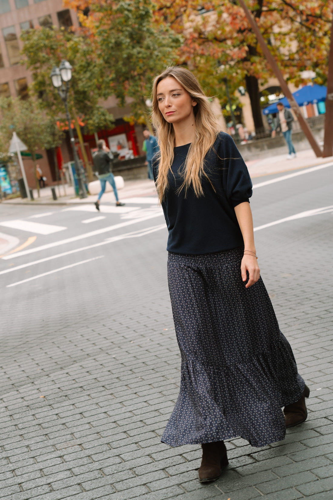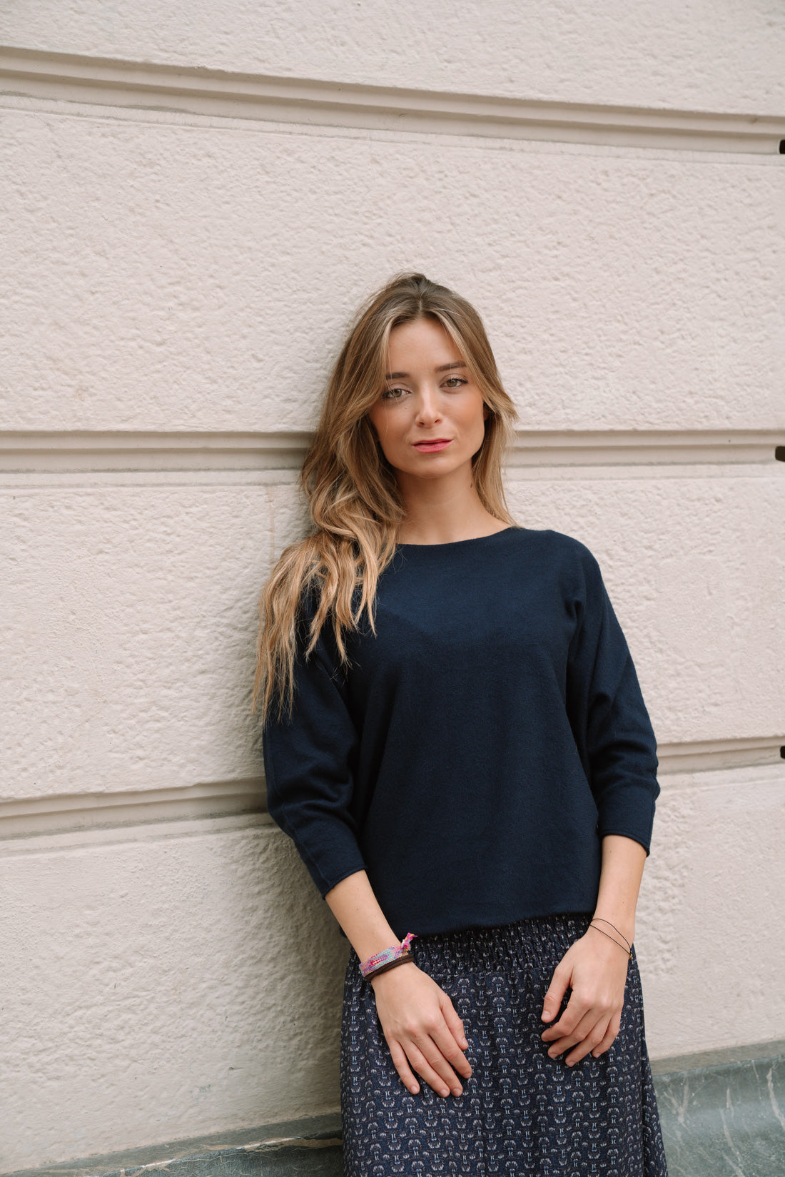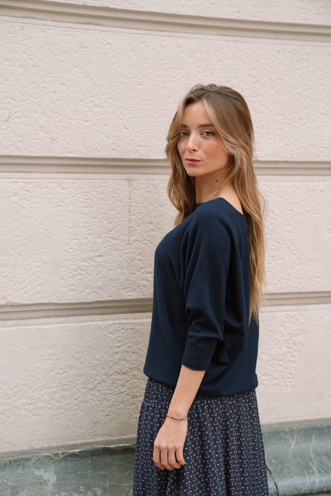 Jersey KIMY marino con cuello barco y manga tipo murciélago. 50% viscosa 28% poliester 22% poliamida. T.U. equivalentes a T.S-M (La modelo utiliza T.XS)