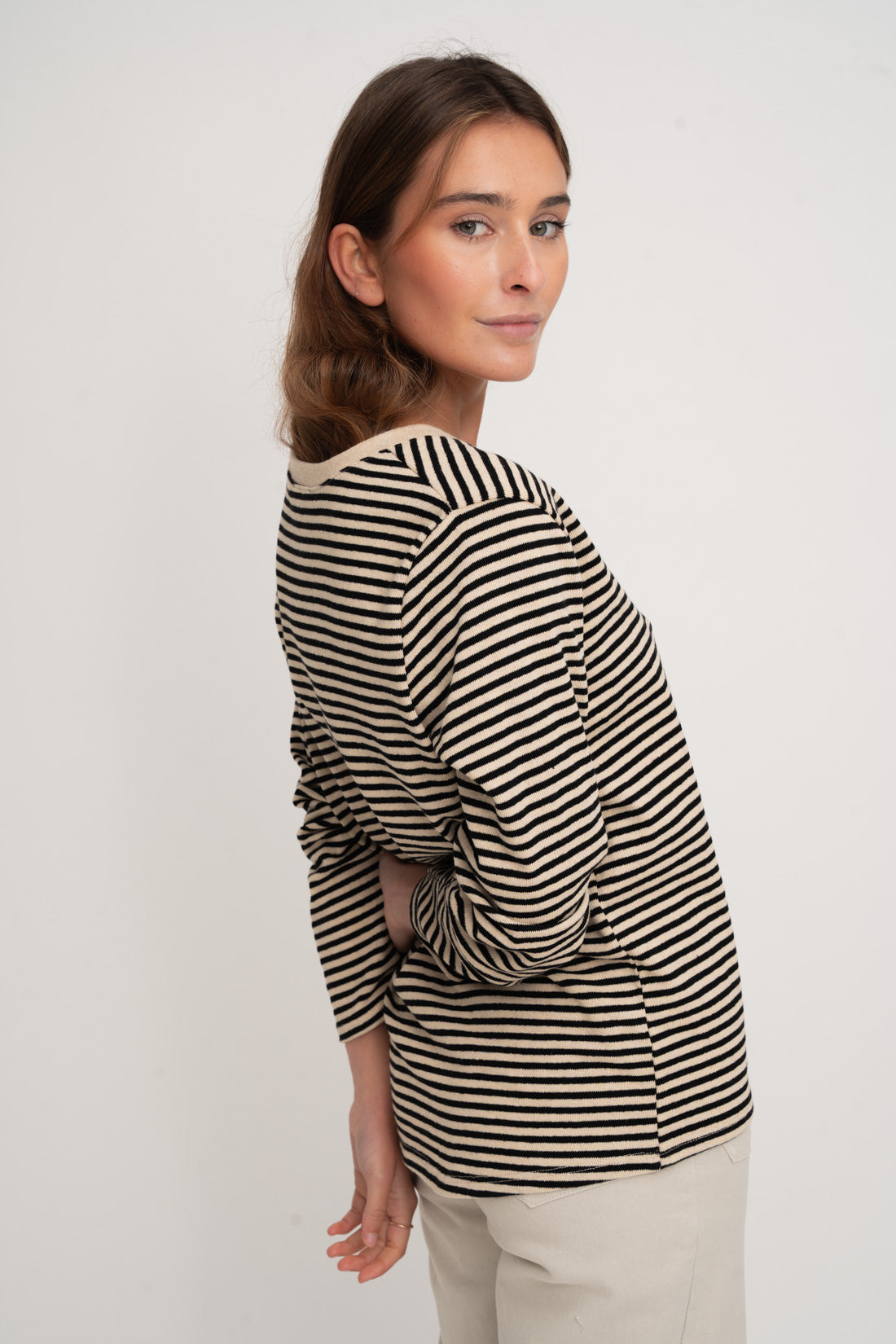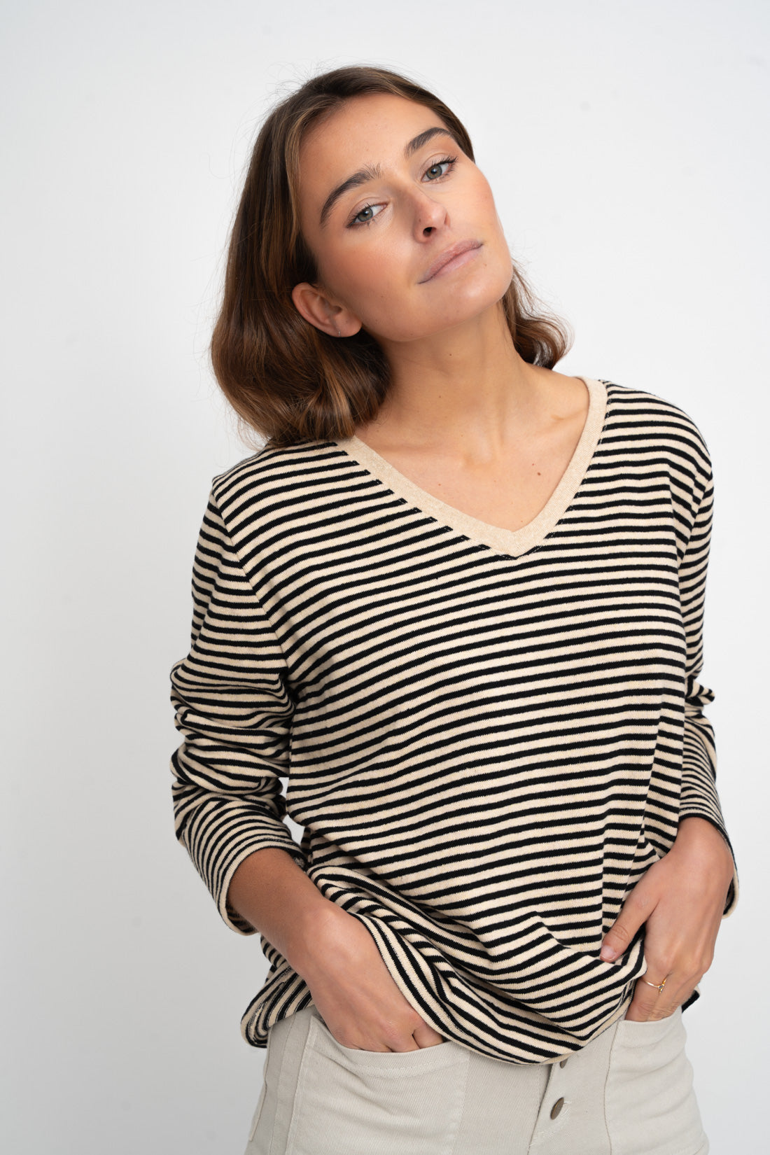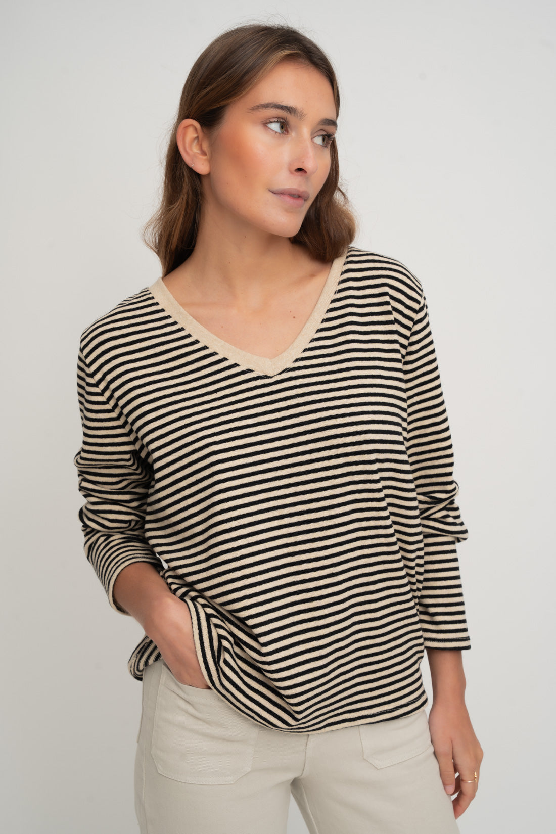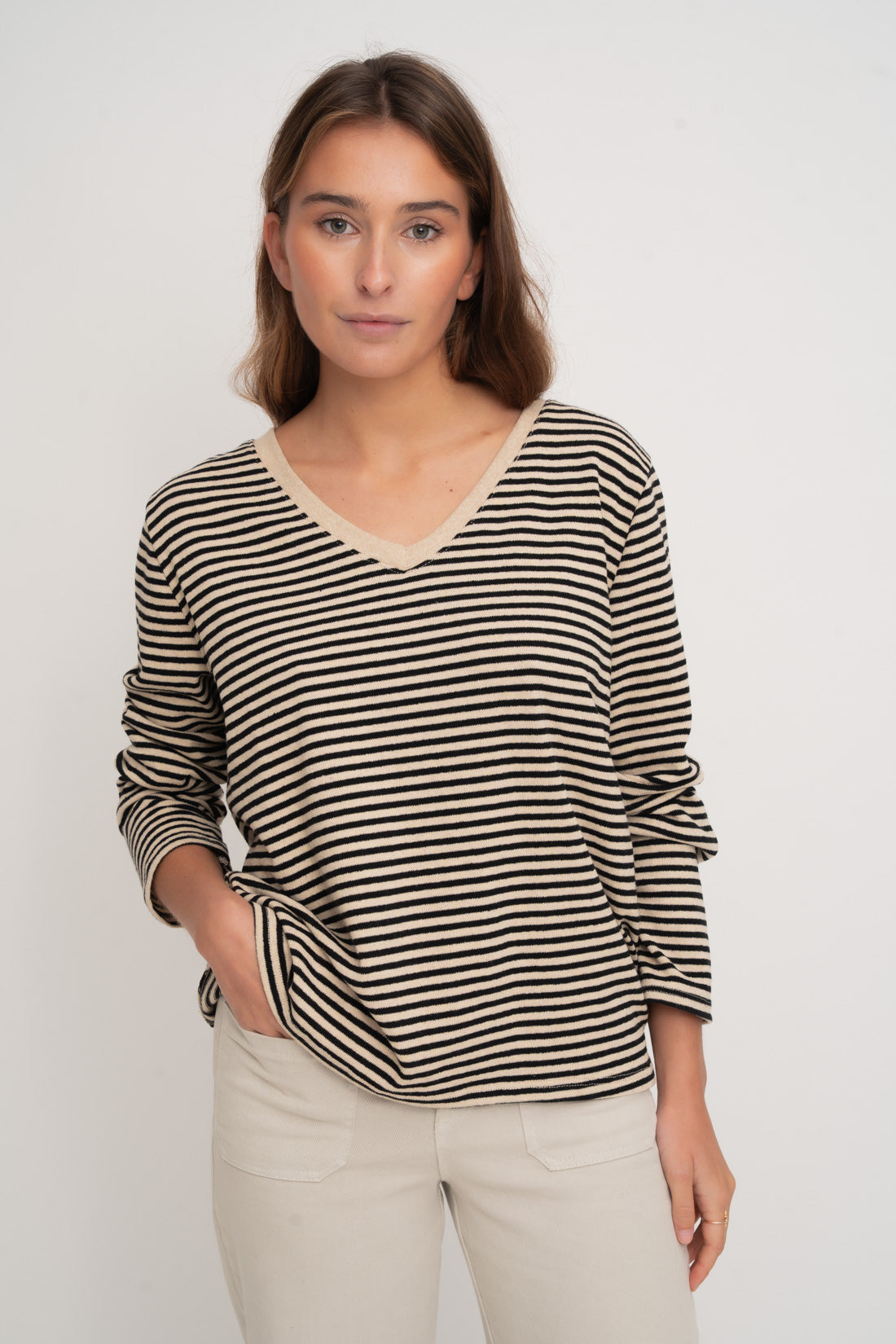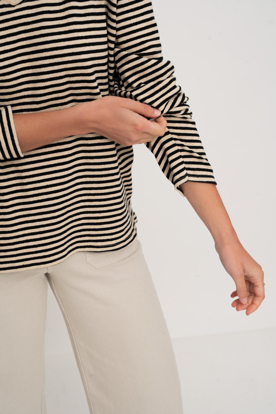 Jersey rayas de algodón negro y beige con pico de color contrastado en color negro