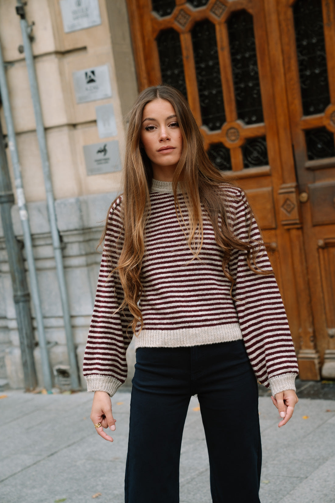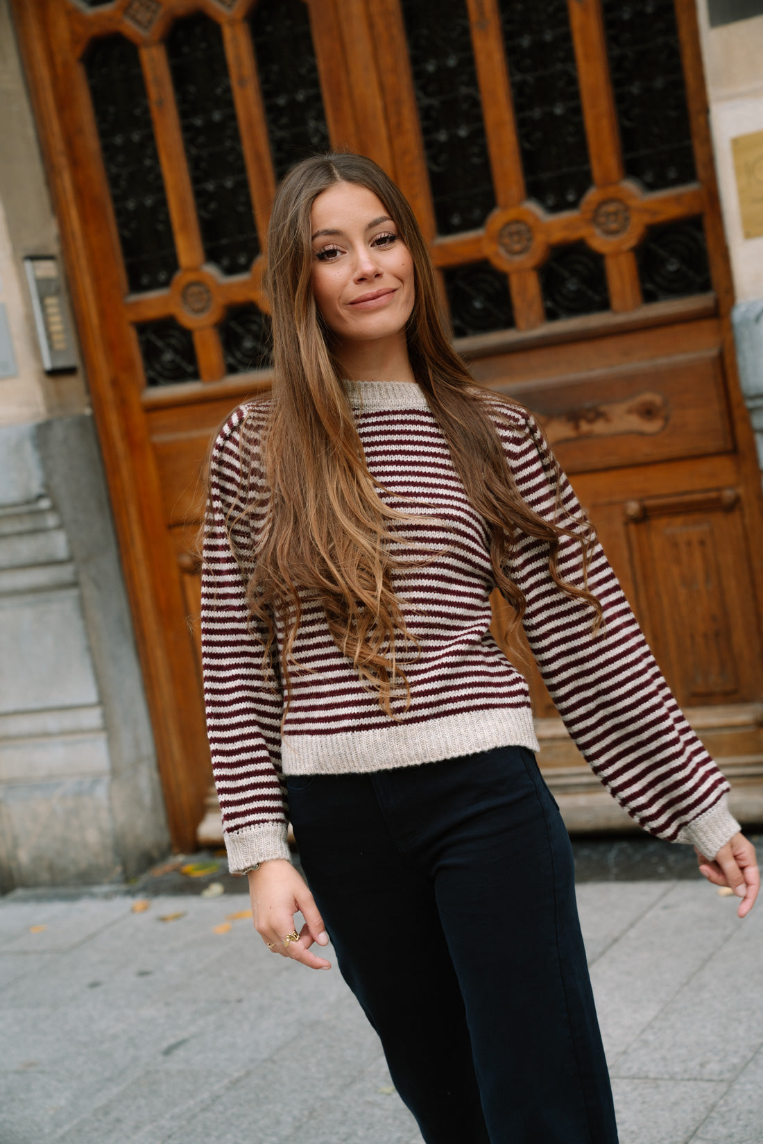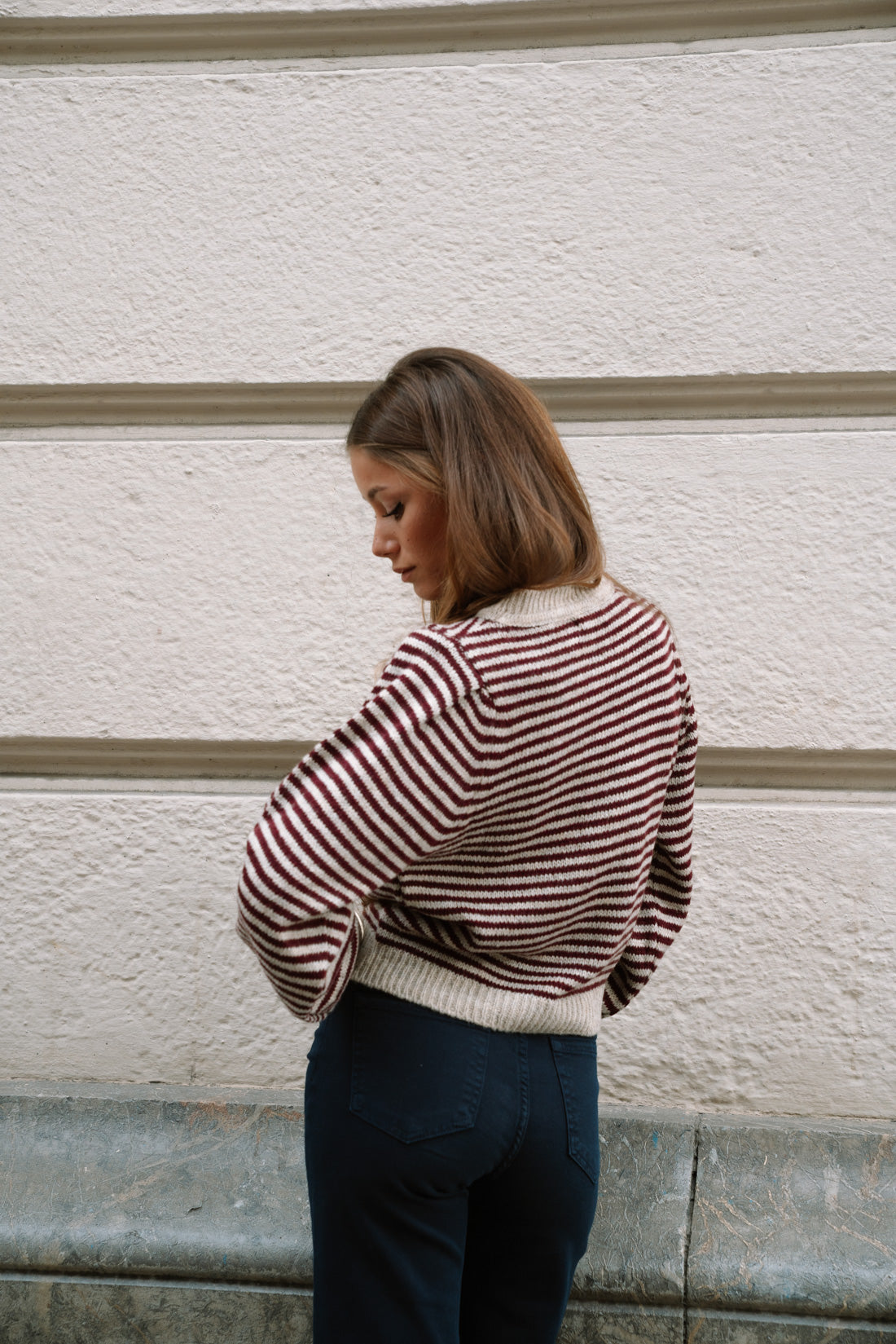 Jersey de cuello caja con rayas en beige y vino. Detalle fruncido en los hombros. 57% acrílico 29% poliamida 7%viscosa 7%lana. T.U equivalente a XS-S (La modelo utiliza XS)