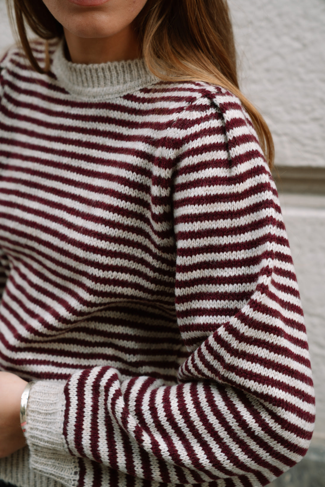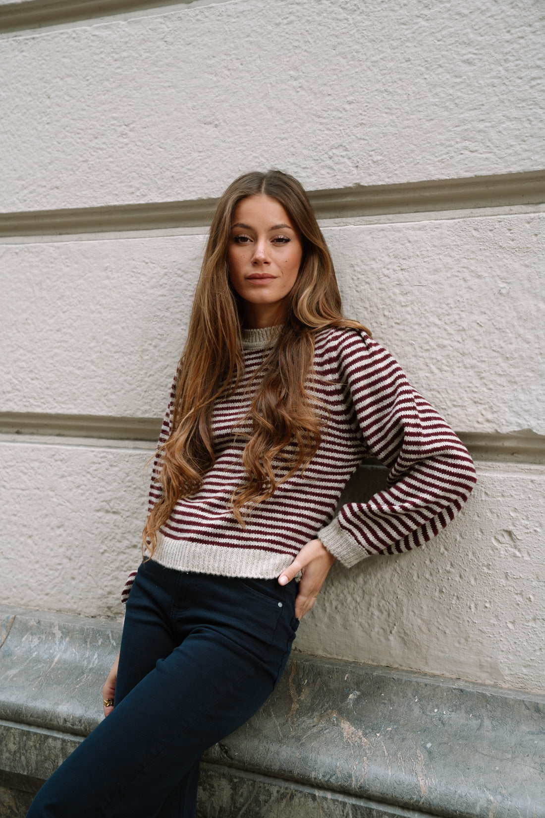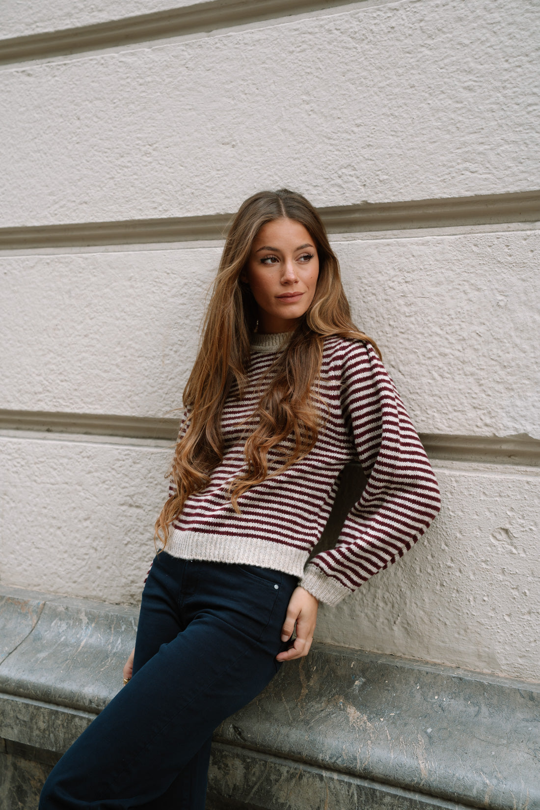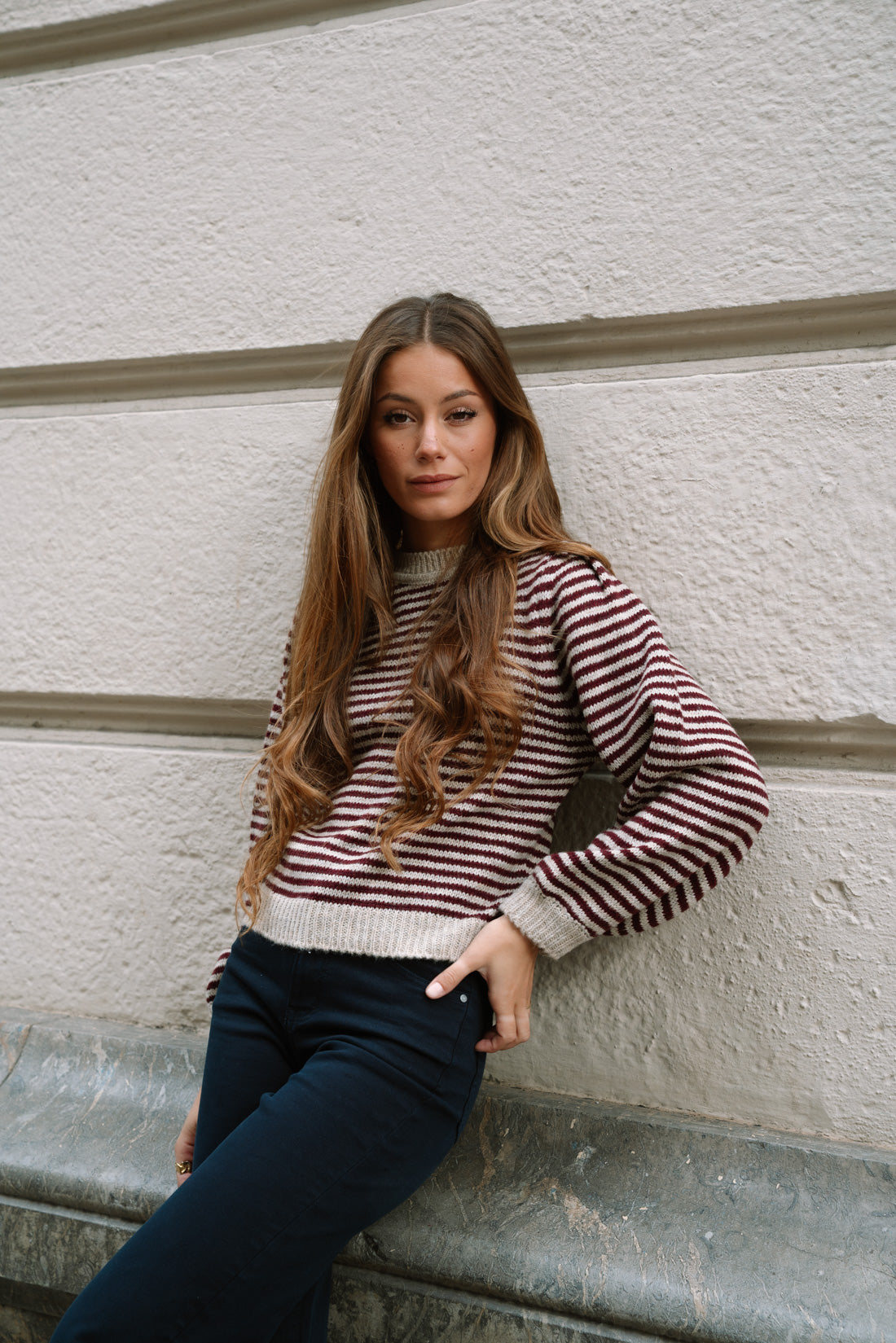 Jersey de cuello caja con rayas en beige y vino. Detalle fruncido en los hombros. 57% acrílico 29% poliamida 7%viscosa 7%lana. T.U equivalente a XS-S (La modelo utiliza XS)