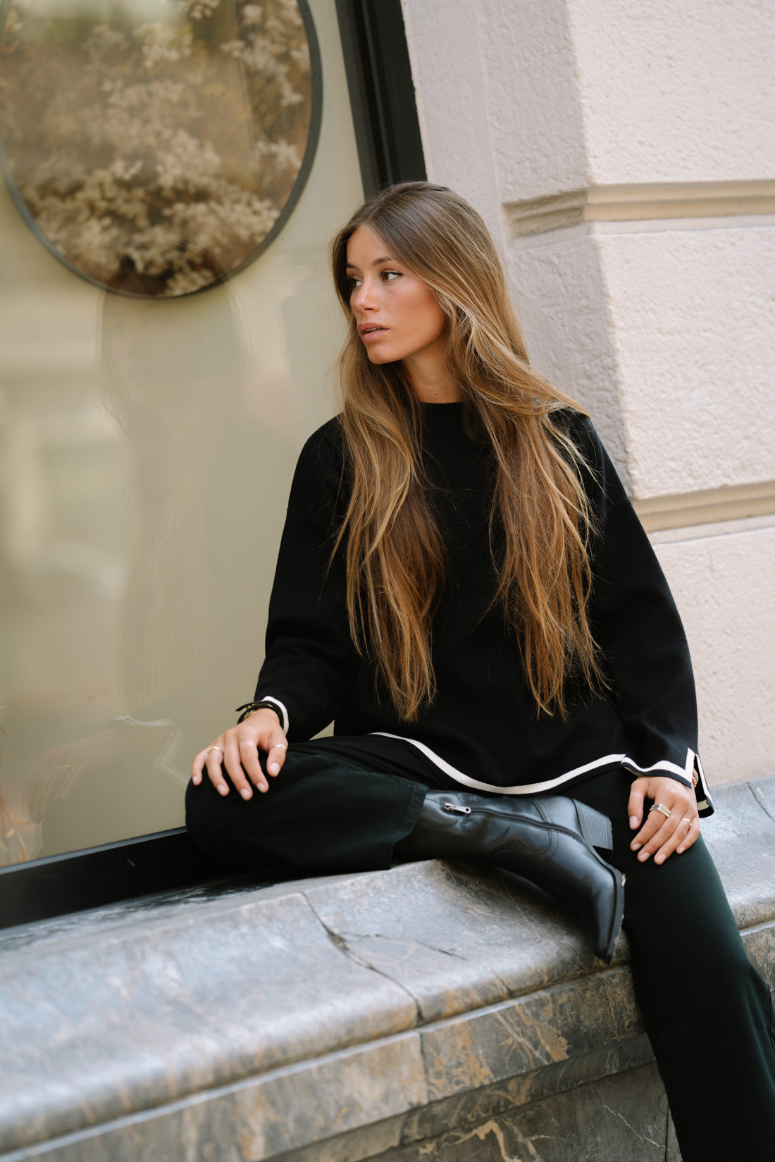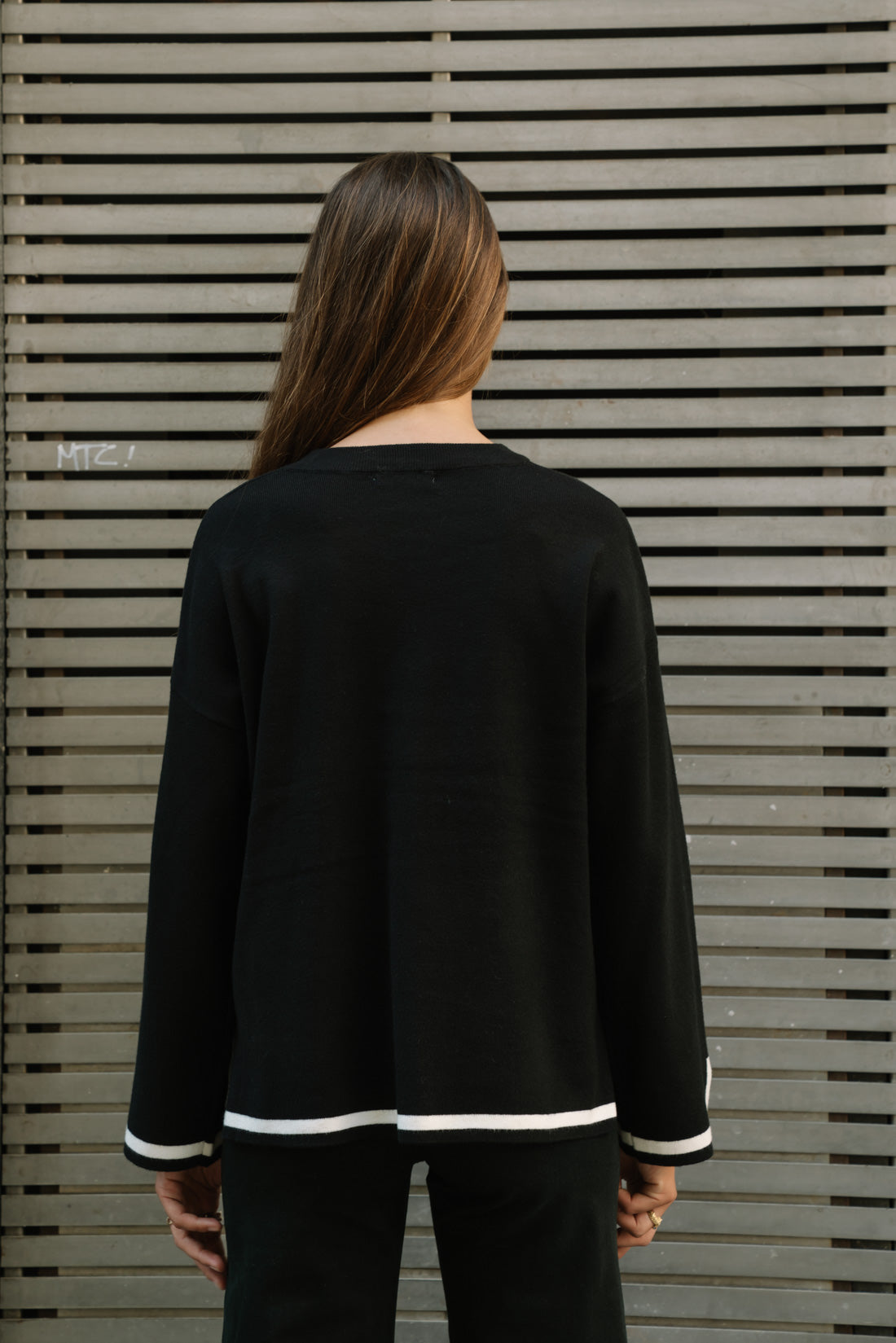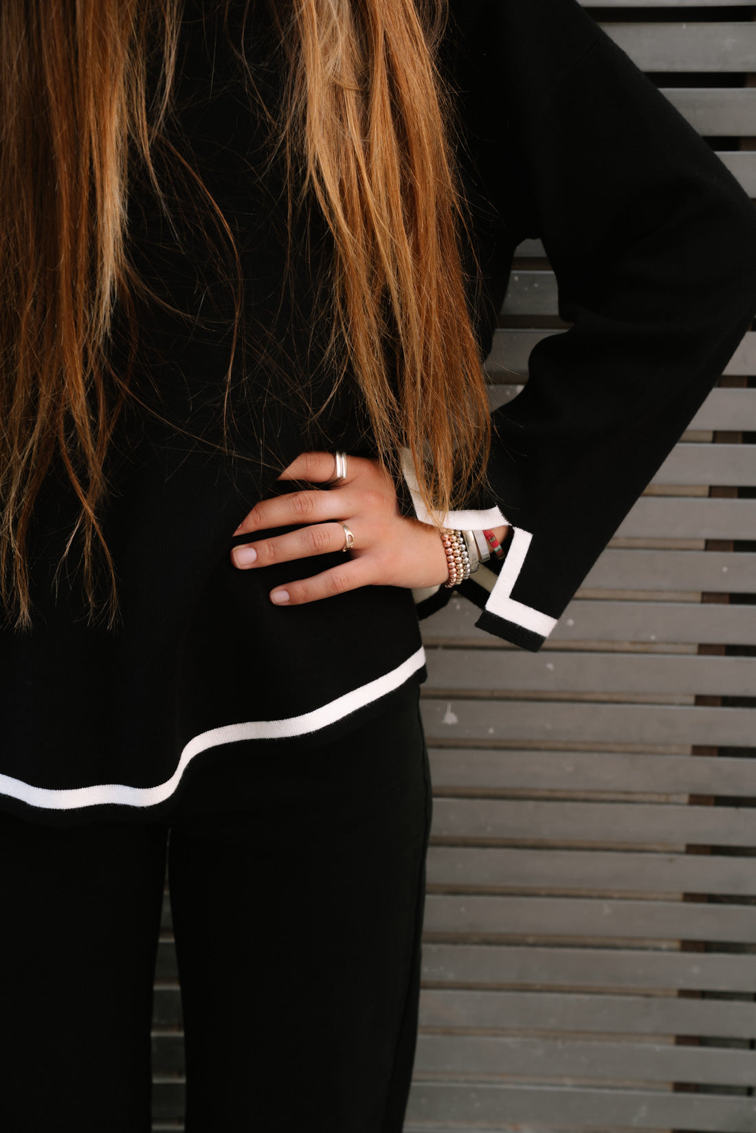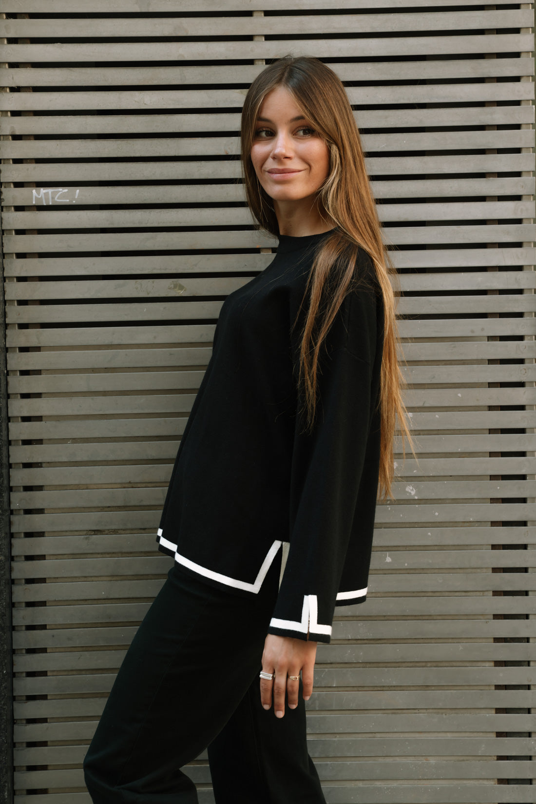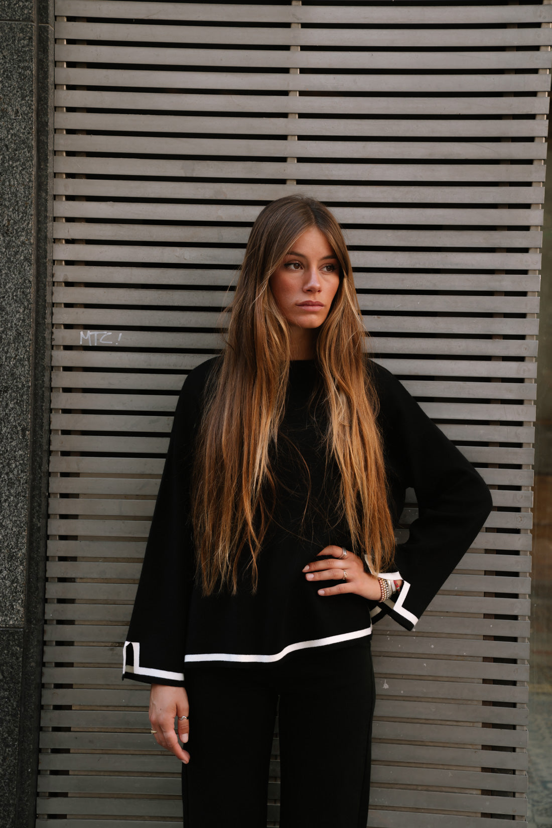 Jersey VIBES negro con detalle en blanco. Originales mangas ligeramente acampanadas.Tejido elástico adaptable. 50%Viscosa 22%Poliamida 28%Elastano T.U.