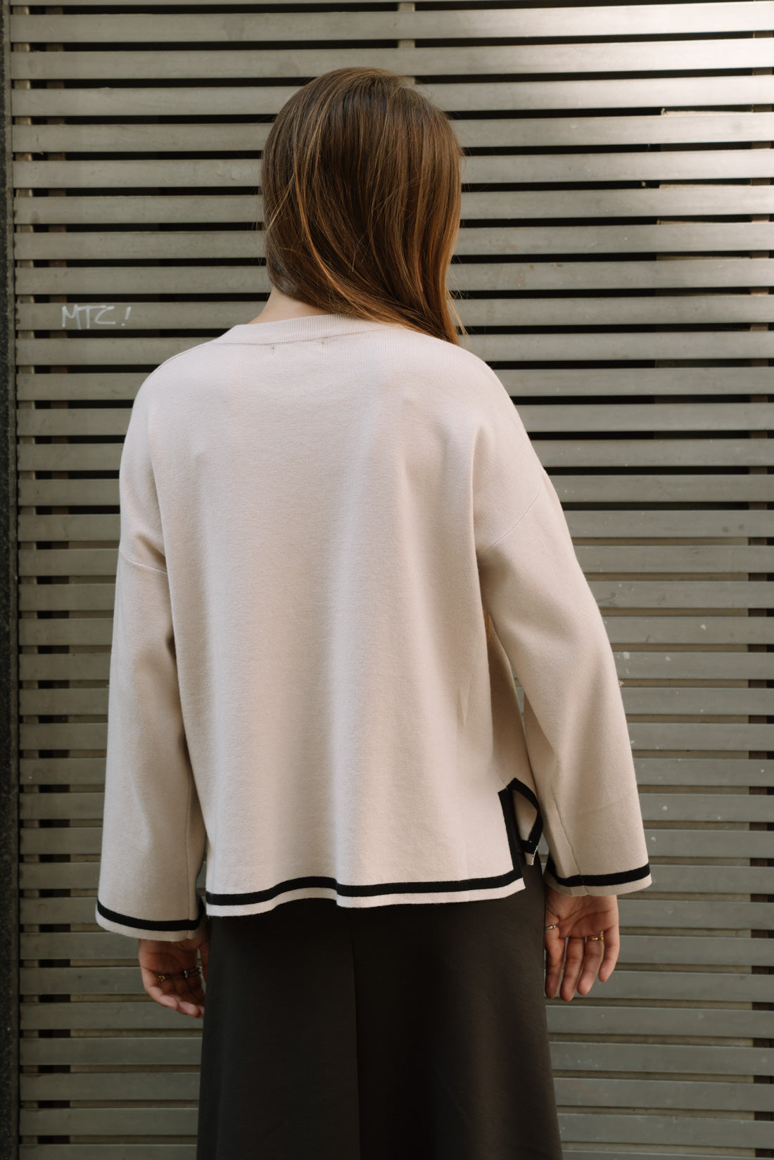 Jersey VIBES beige con detalle en choco. Originales mangas ligeramente acampanadas.Tejido elástico adaptable. 50%Viscosa 22%Poliamida 28%Elastano T.U.