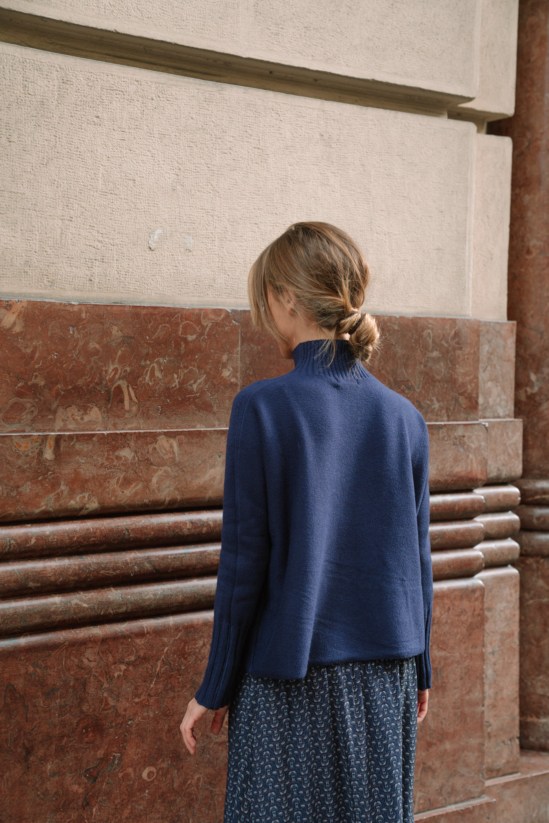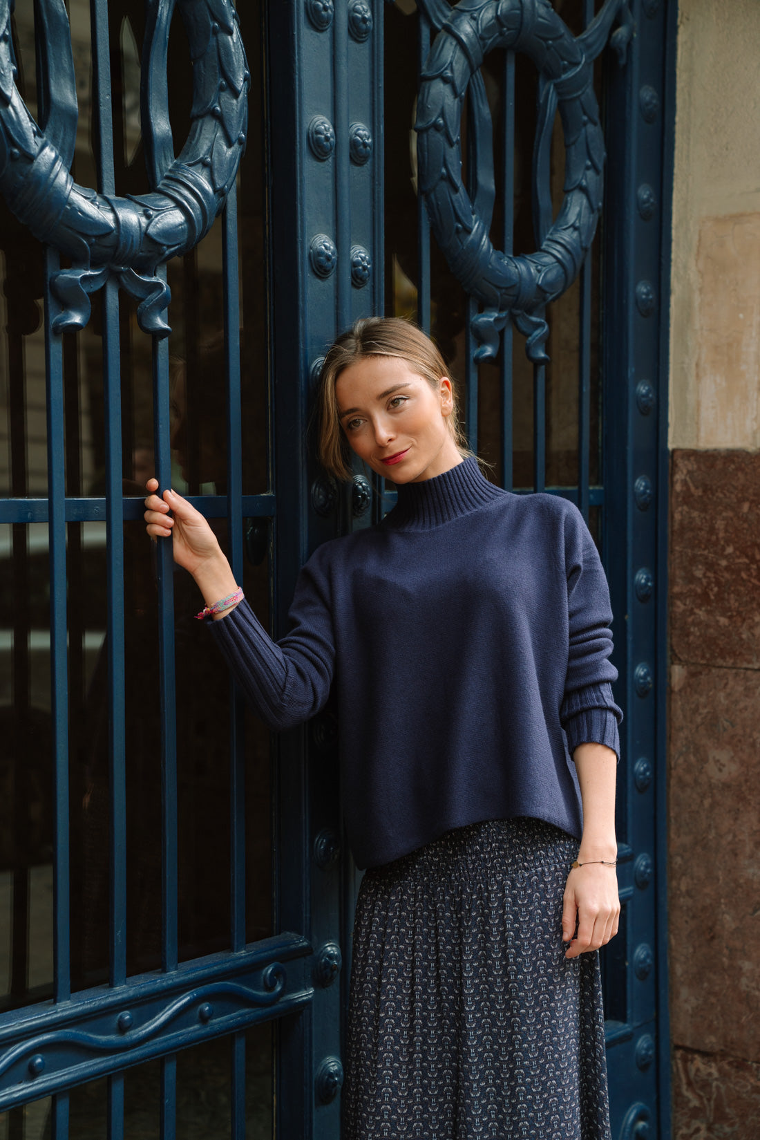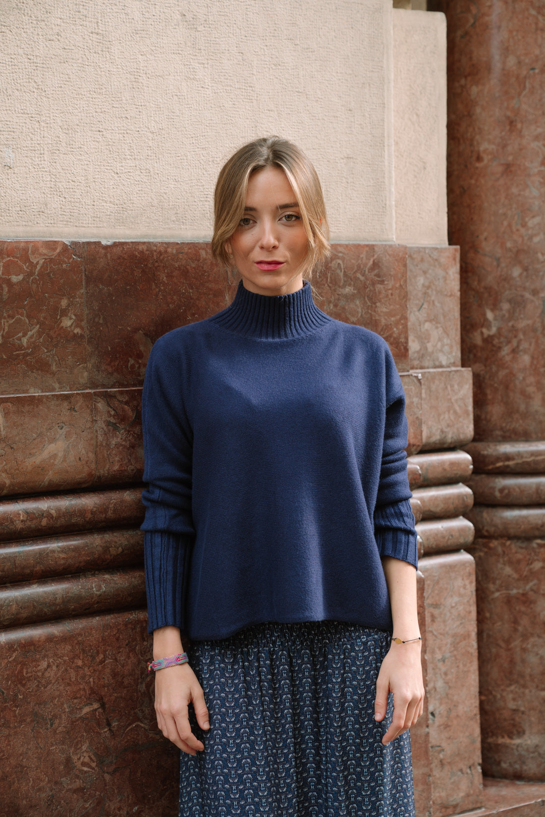 Jersey WINT2 marino cuello Perkins y detalle acanalado en las mangas. T.U equivalente a XS-S ( La modelo utiliza XS) Tejido super gustoso 50% viscosa 28% poliester 22% poliamida