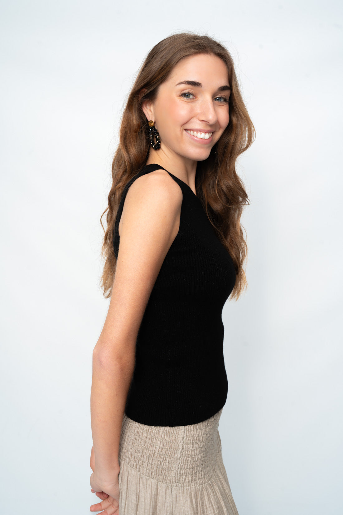 Top elastico de punto microcanale con lurex y cuello redondo.