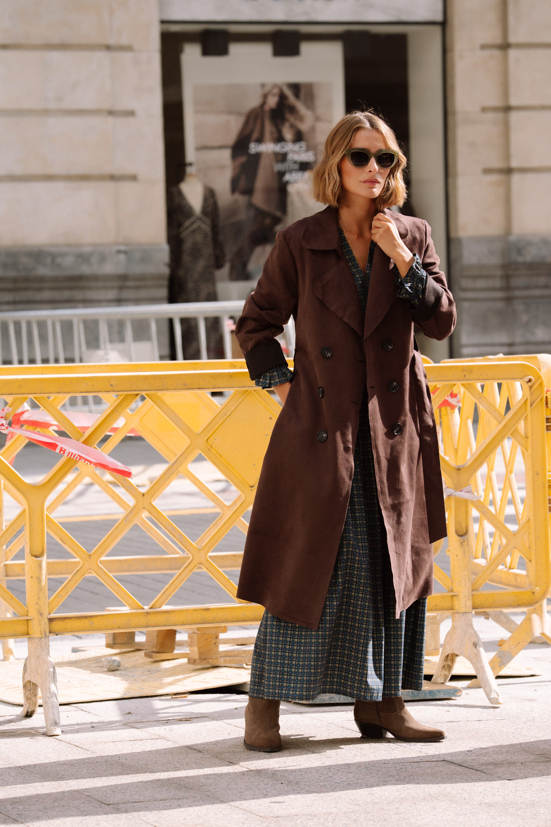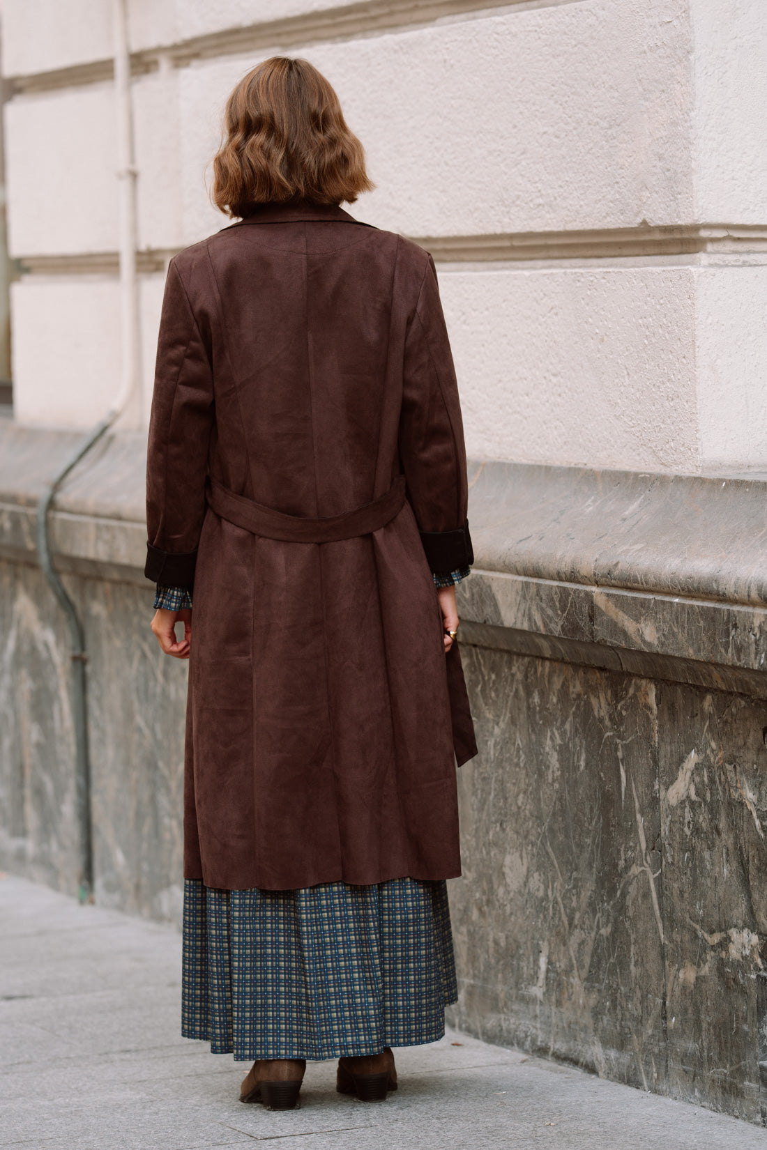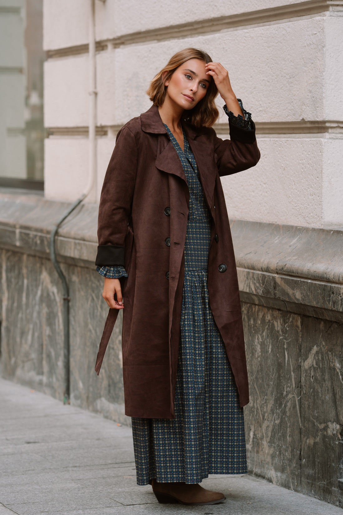 Trench antelina choco. Tejido elástico adaptable y cómodo. 92%poliester 8%elastano. T.U. equivalente a S-M (La modelo utiliza T.XS)
