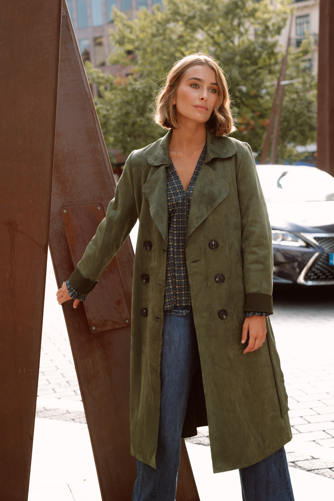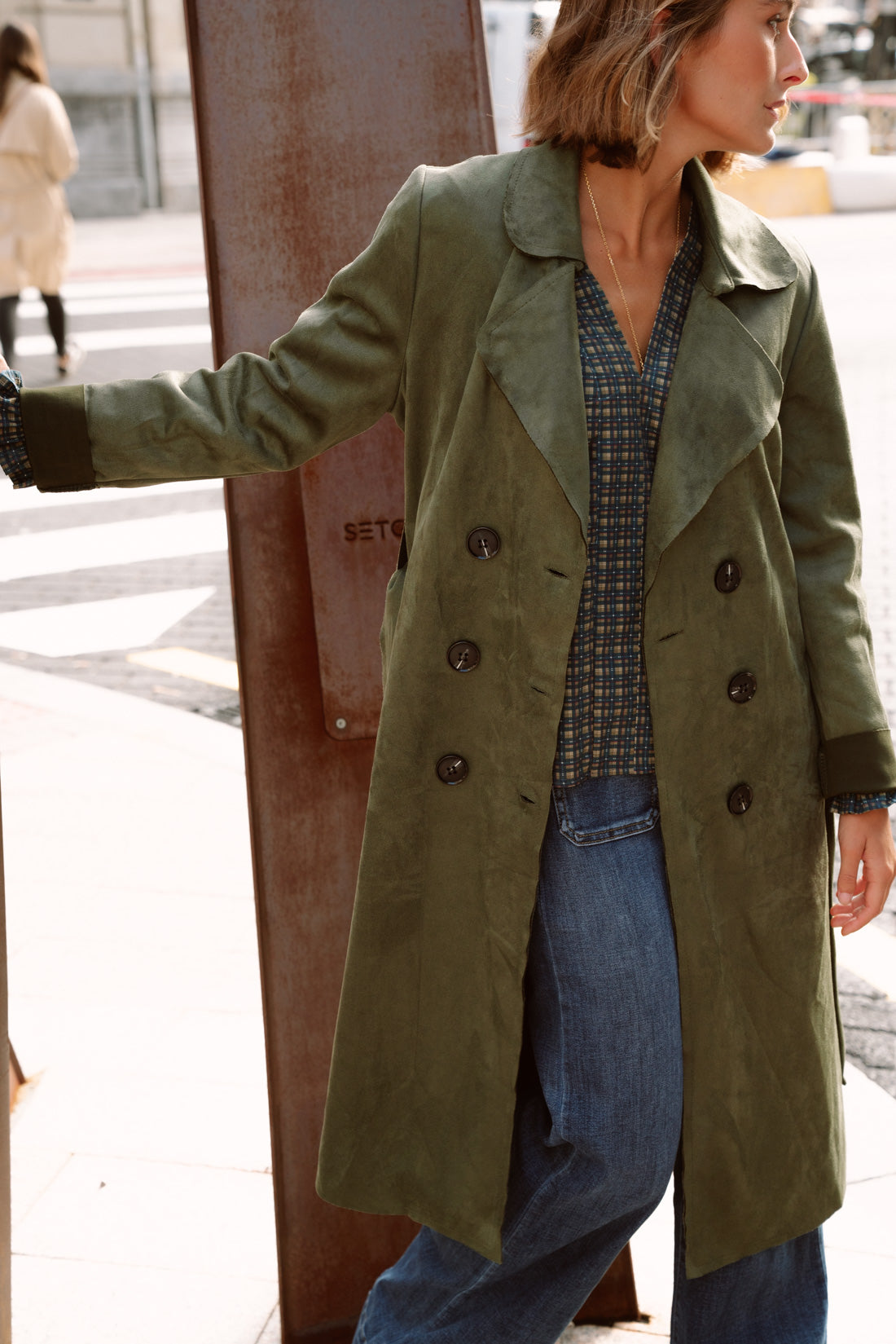 Trench antelina choco. Tejido elástico adaptable y cómodo. 92%poliester 8%elastano. T.U. equivalente a S-M (La modelo utiliza T.XS)