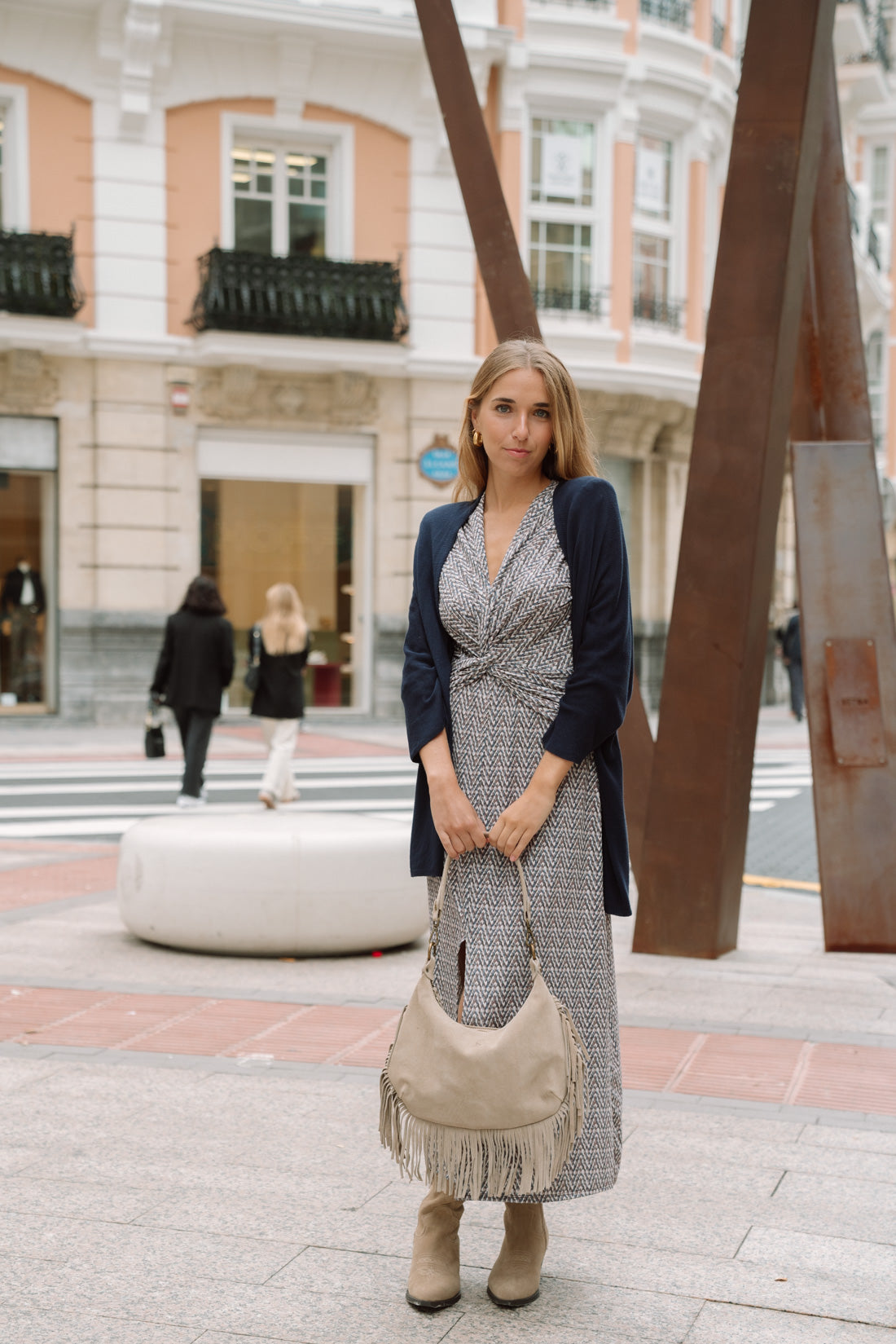 Vestido NURK con estampado espiga en tonos azules. Hombreras y detalle anudado en la cintura. Un diseño femenino y favorecedor confeccionado con un tejido super elástico que garantiza la comodidad y libertad de movimiento. 100% poliester. T.U. equvalente a S-M (La modelo utiliza T.S)
