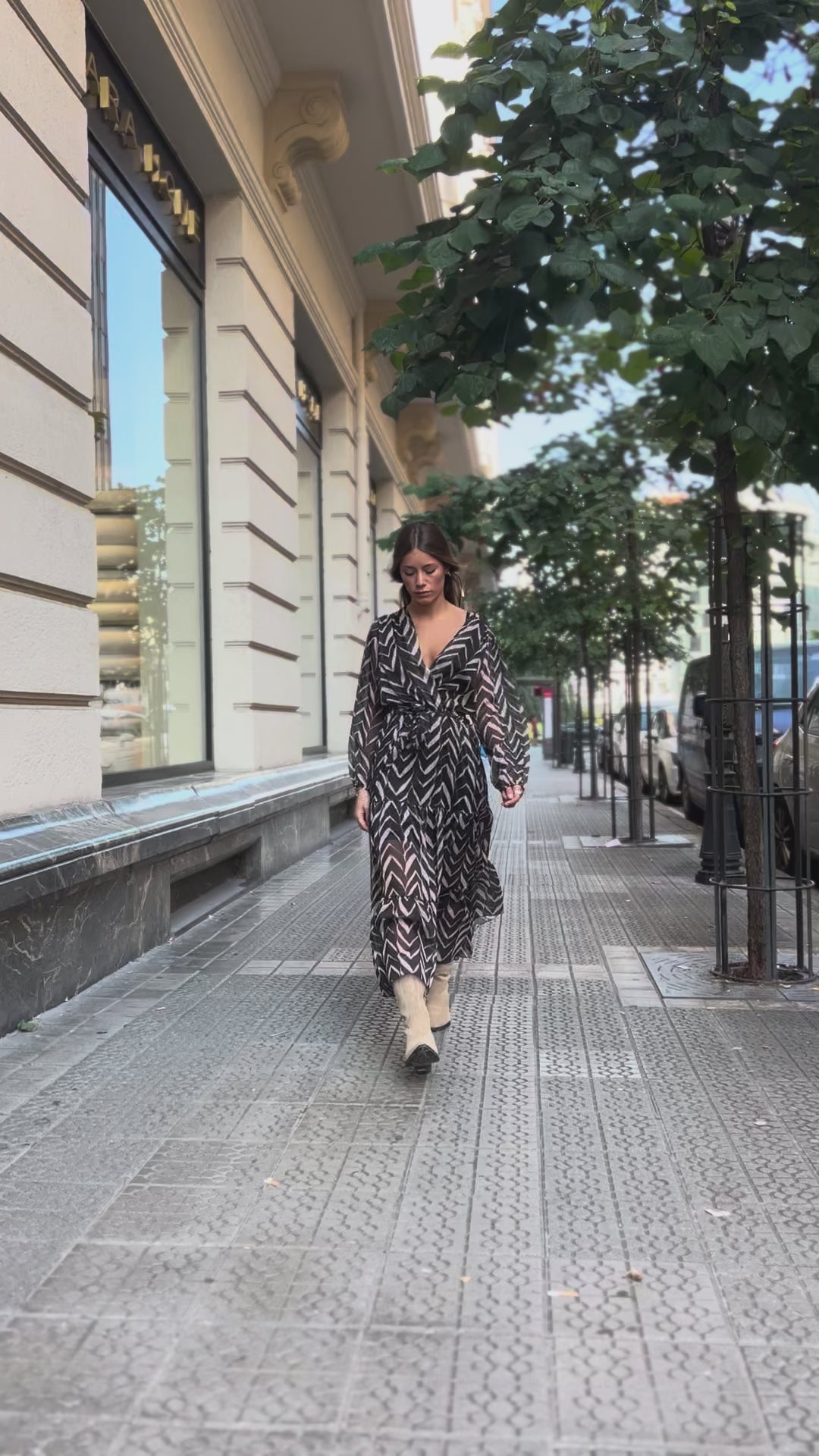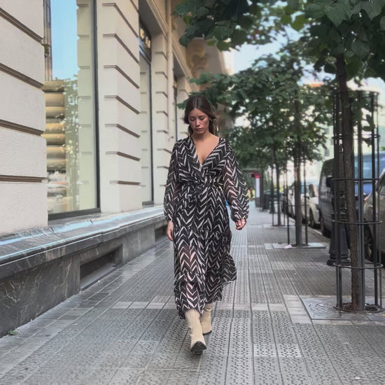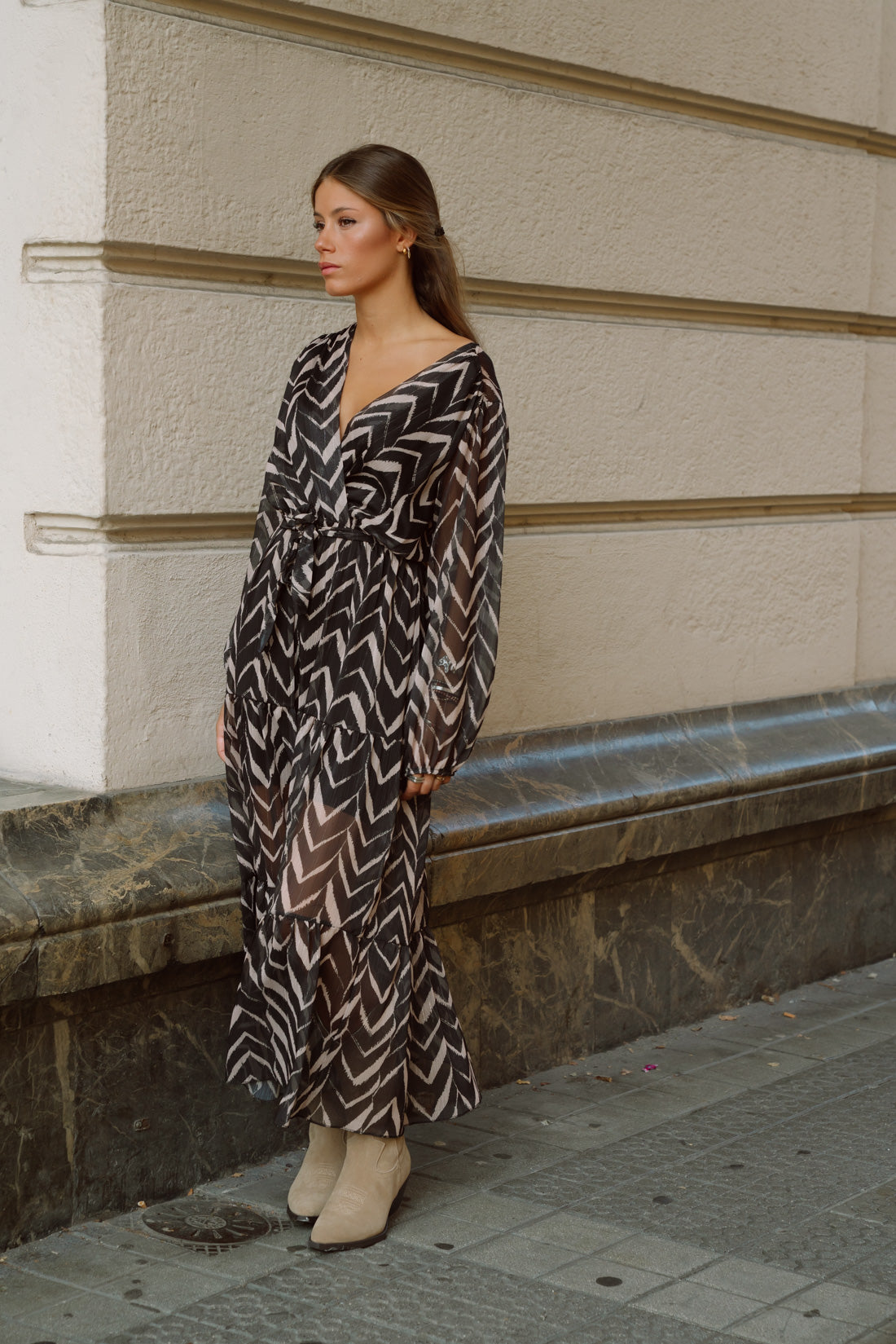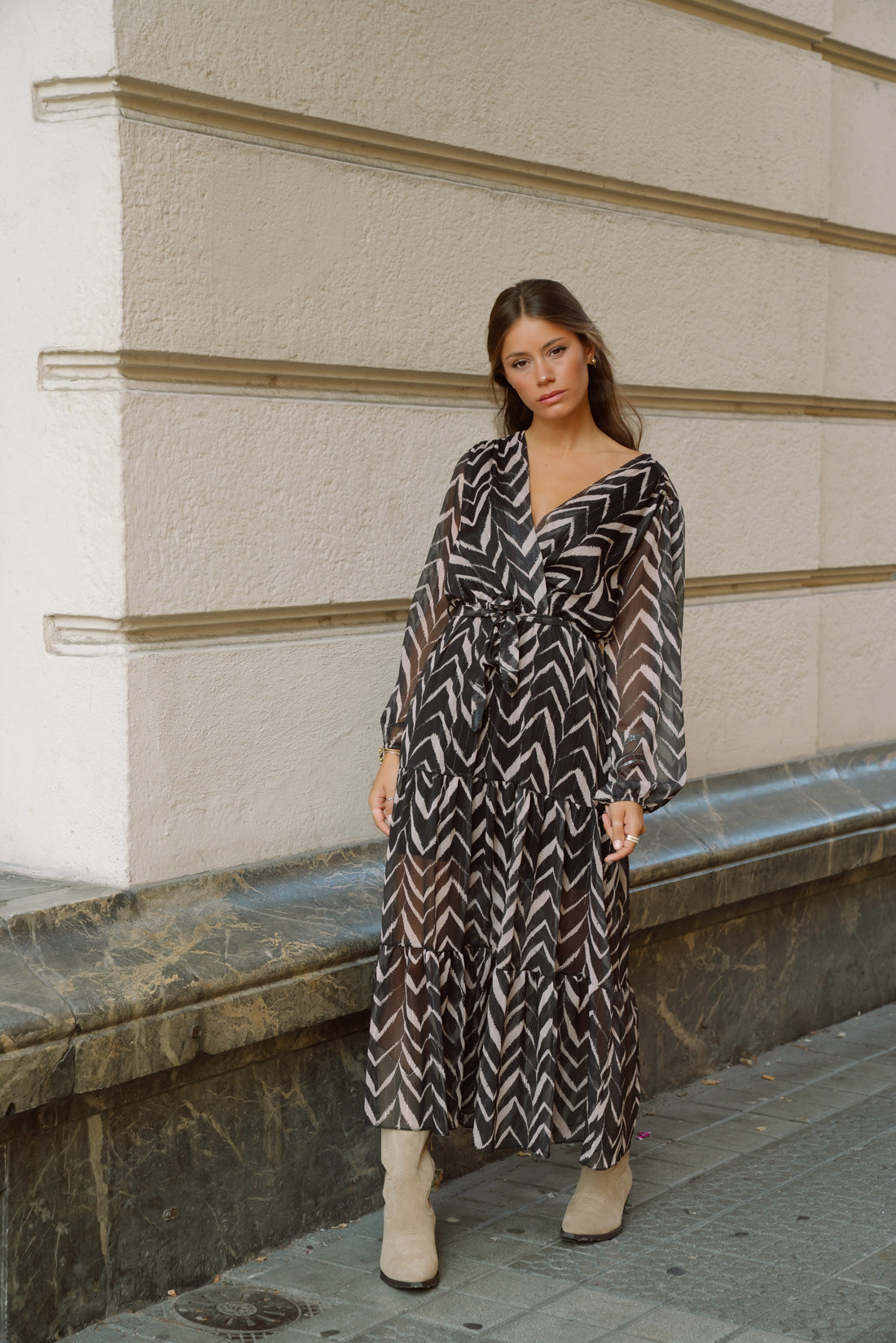 Vestido PATY fluido de gasa con estampado espiga en tonos beige y negro. Escote en pico cruzado y cinturón ajustable. Falda con discretos volantes que aportan feminidad a la prenda. 100% poliéster. T.U equivalente a S-M La modelo utiliza talla S y le queda perfecto con el cinturón ajustado.