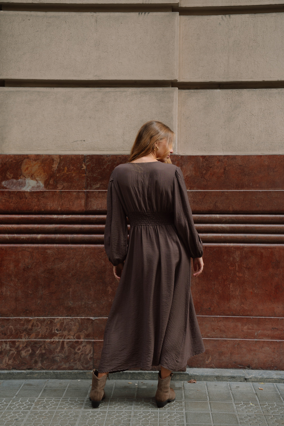 Vestido THURY choco con escote cruzado en pico, detalle fruncido en la cintura que y abertura delantera en la falda para que puedas moverte con libertad. T.U equivalente a S-M (La modelo utiliza T.S)
